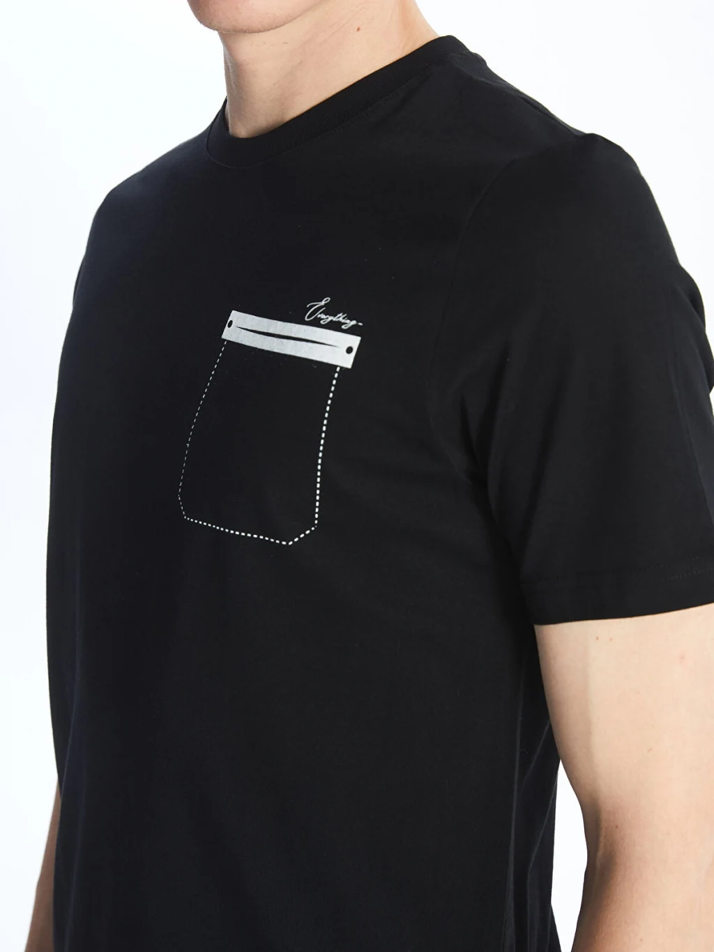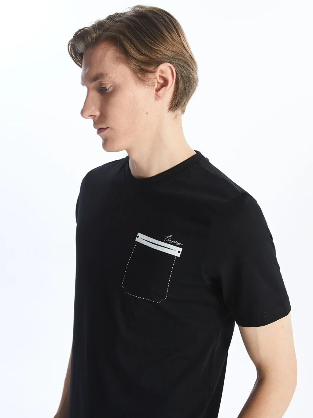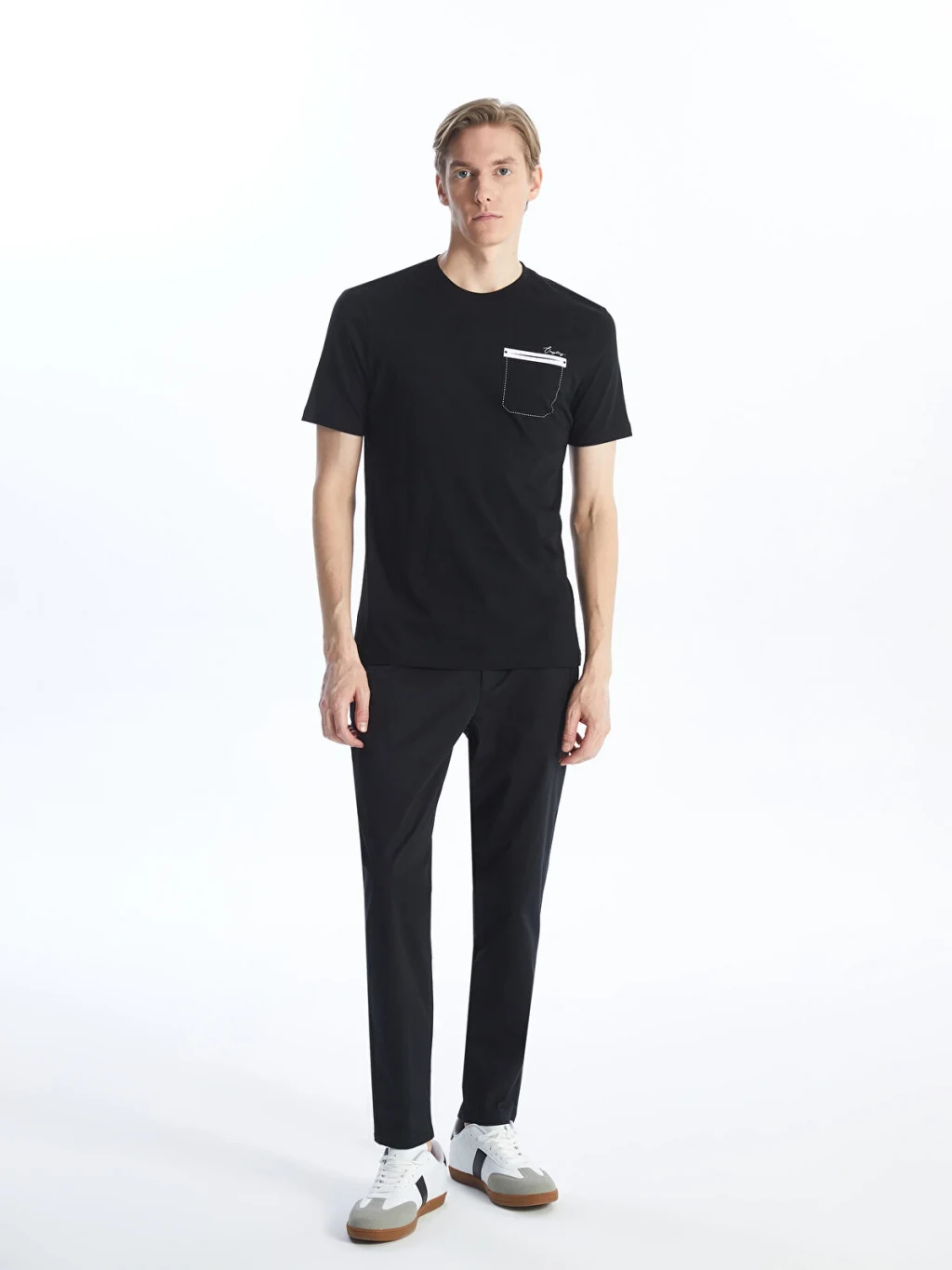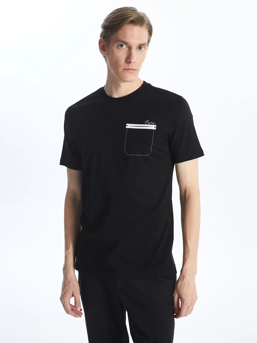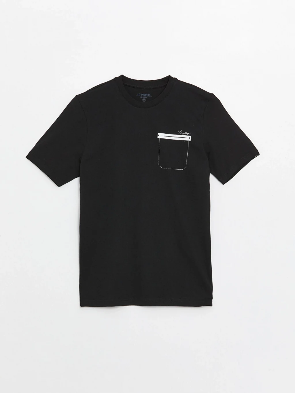 Bisiklet yaka, kısa kollu erkek tişört, %100 pamuklu penye kumaştan üretilmiştir. Göğüs kısmında şerit detaylı tek cebi bulunur.
