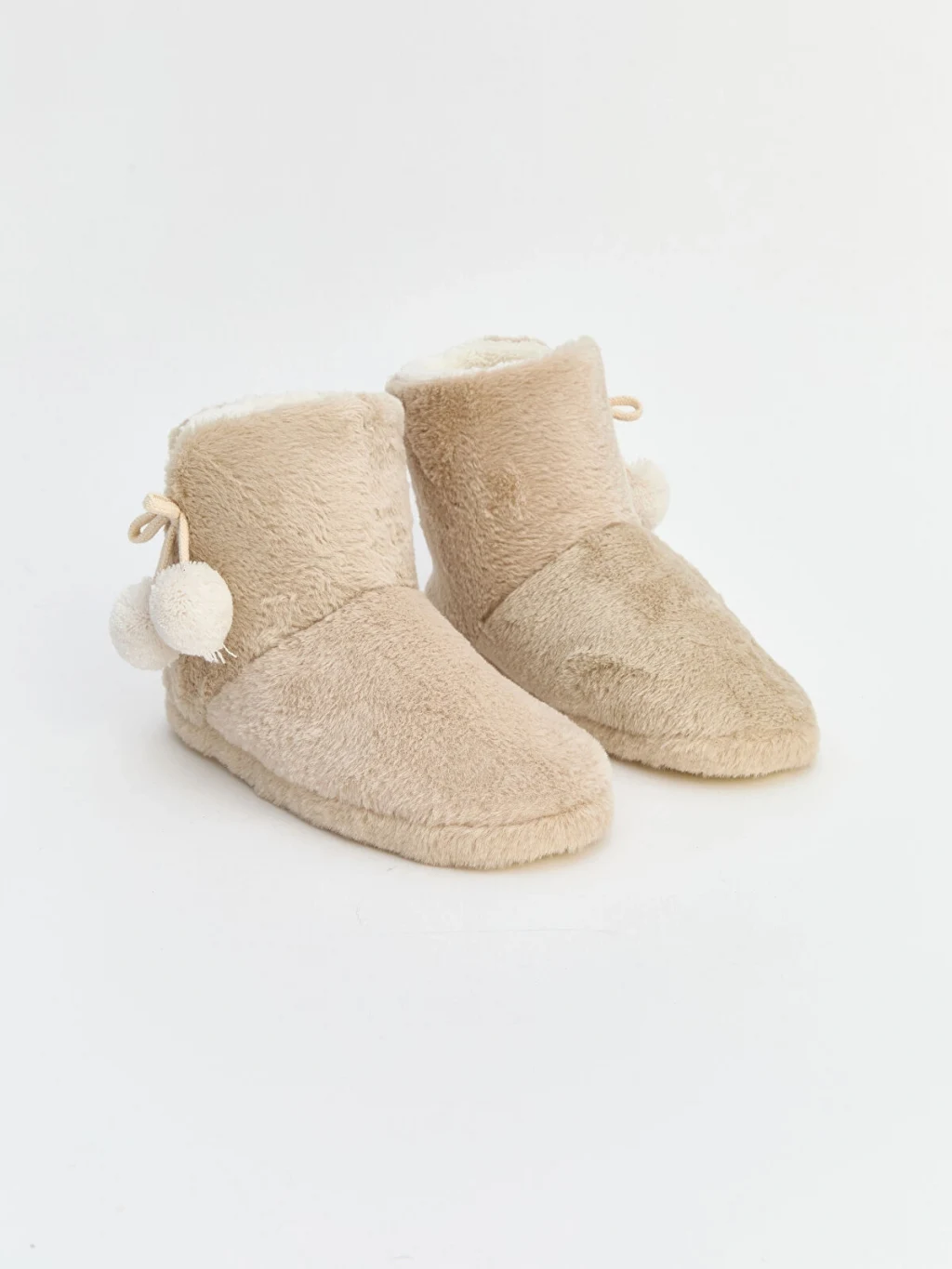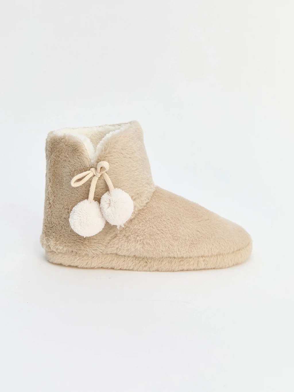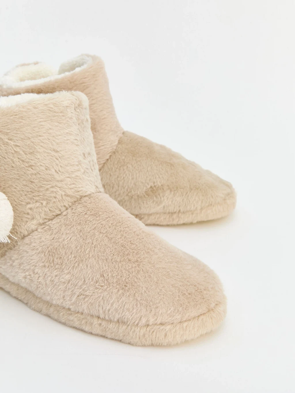 LCW STEPS Bej Pelüş Ponponlu Kadın Panduf