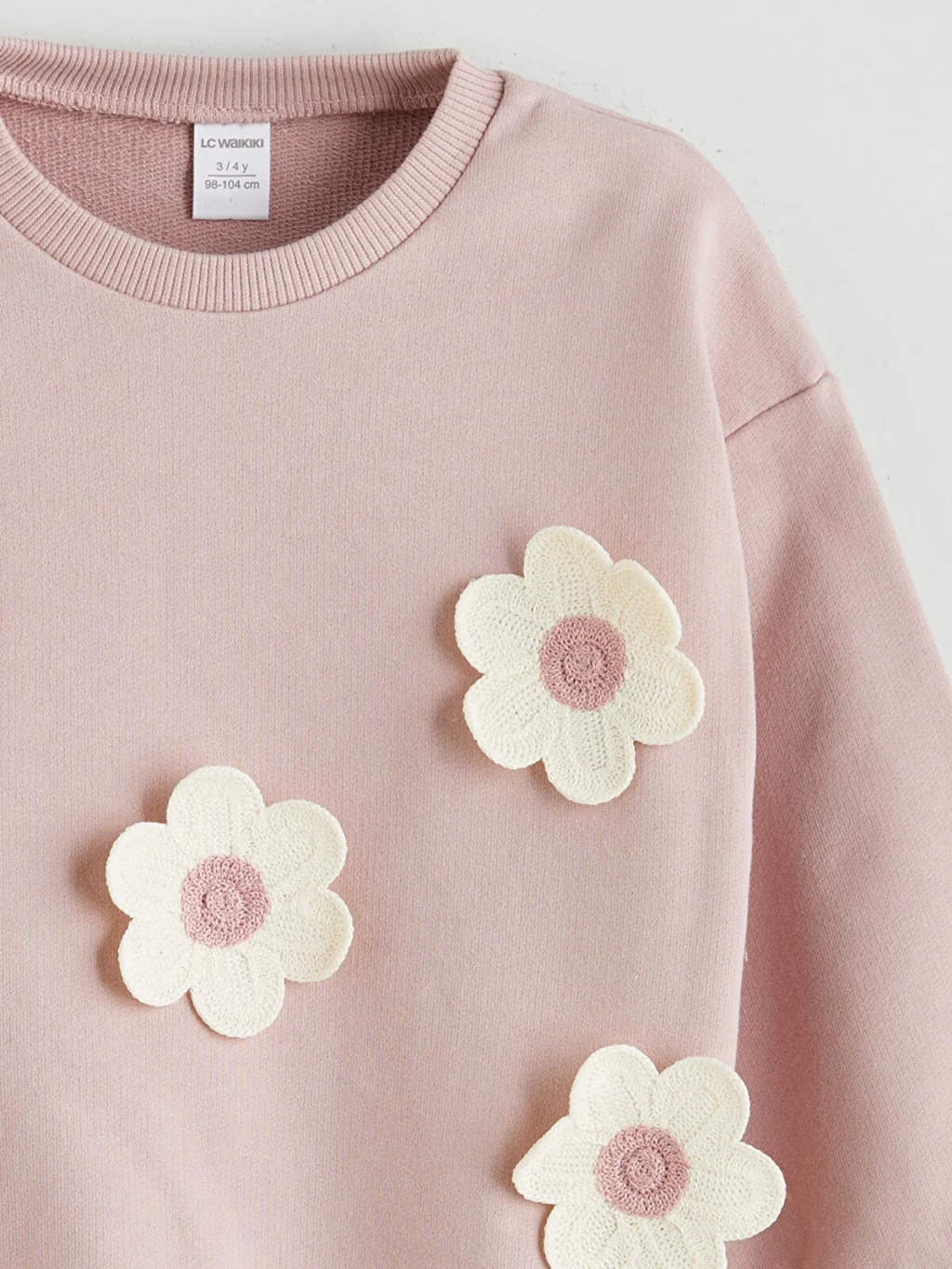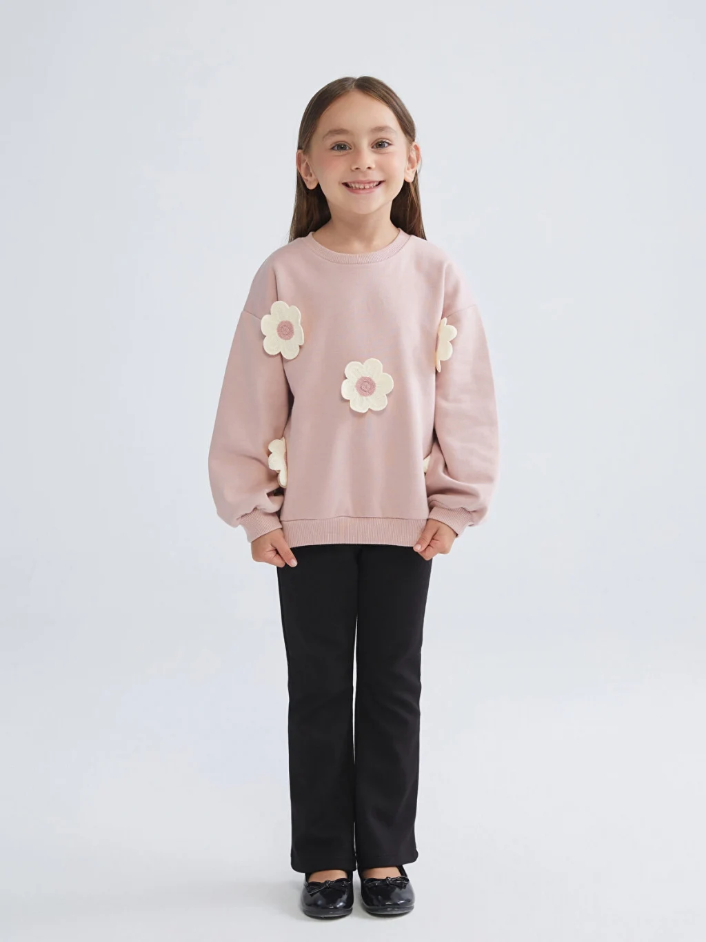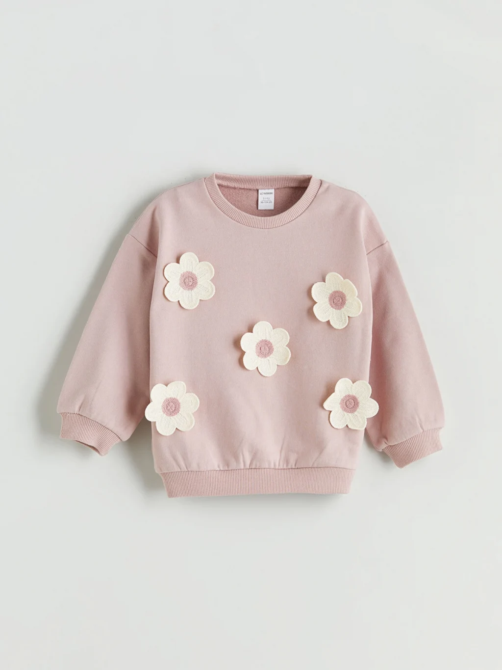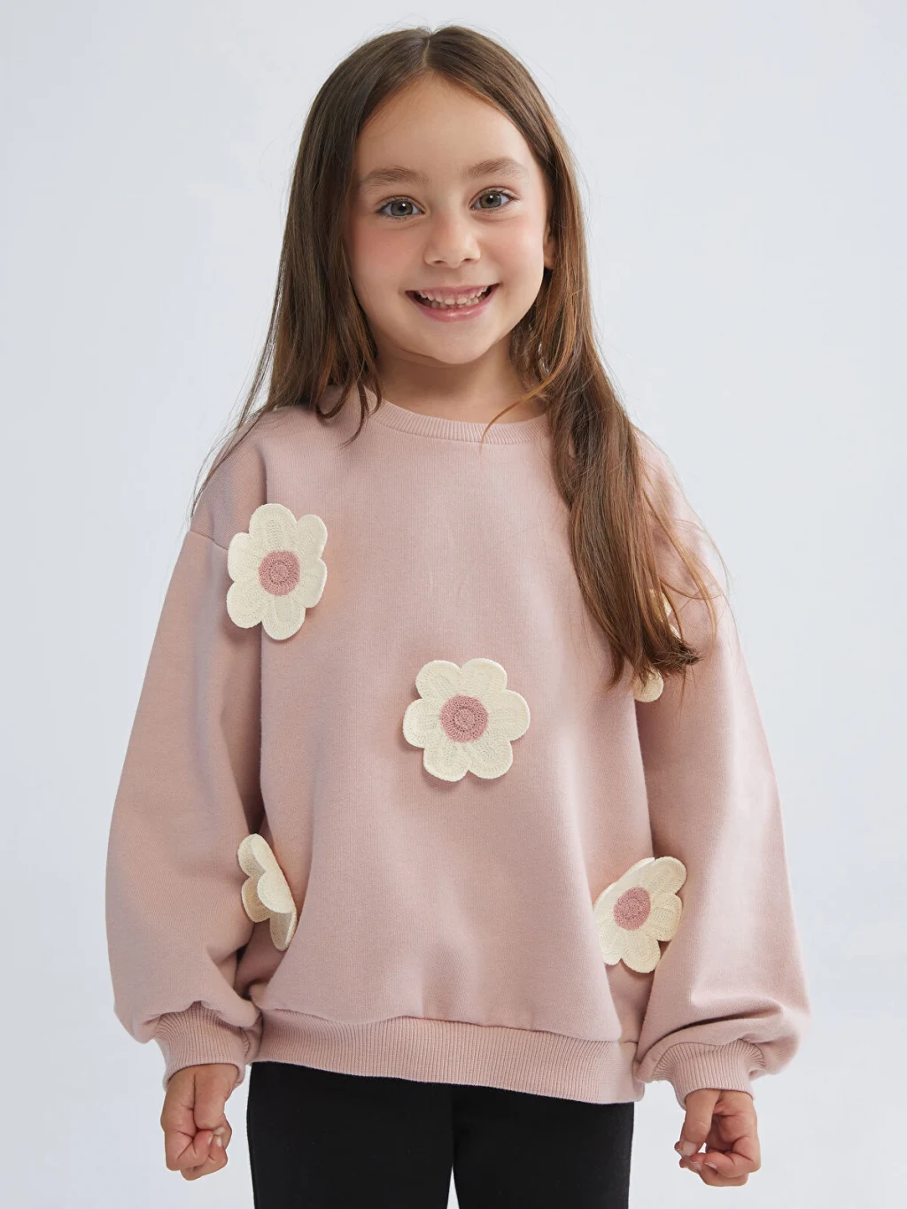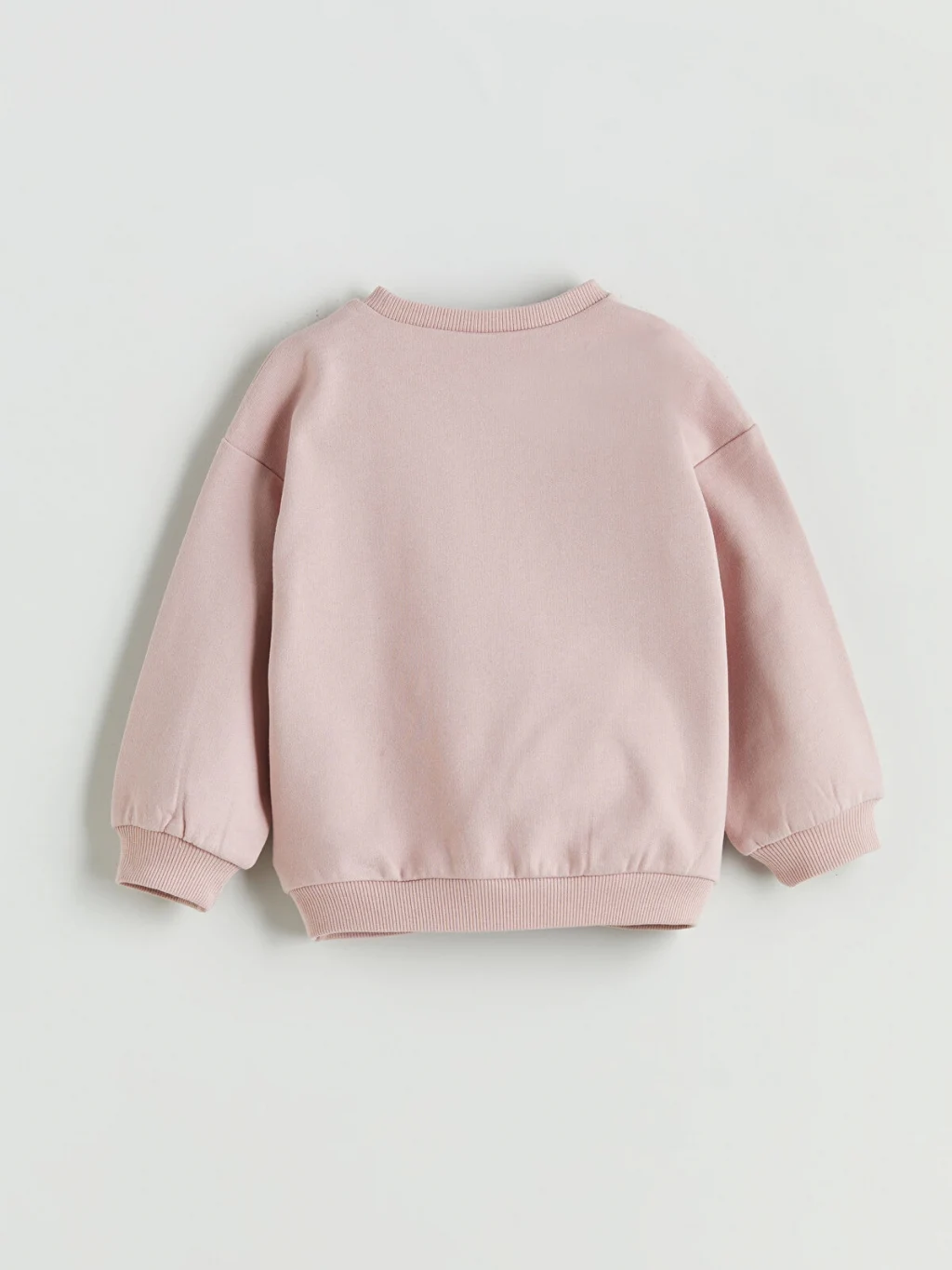 Bisiklet yaka, uzun kollu kız çocuk sweatshirt, pamuklu 3 iplik kumaştan üretilmiştir. Kol uçları ve etek ucu ribanalıdır.