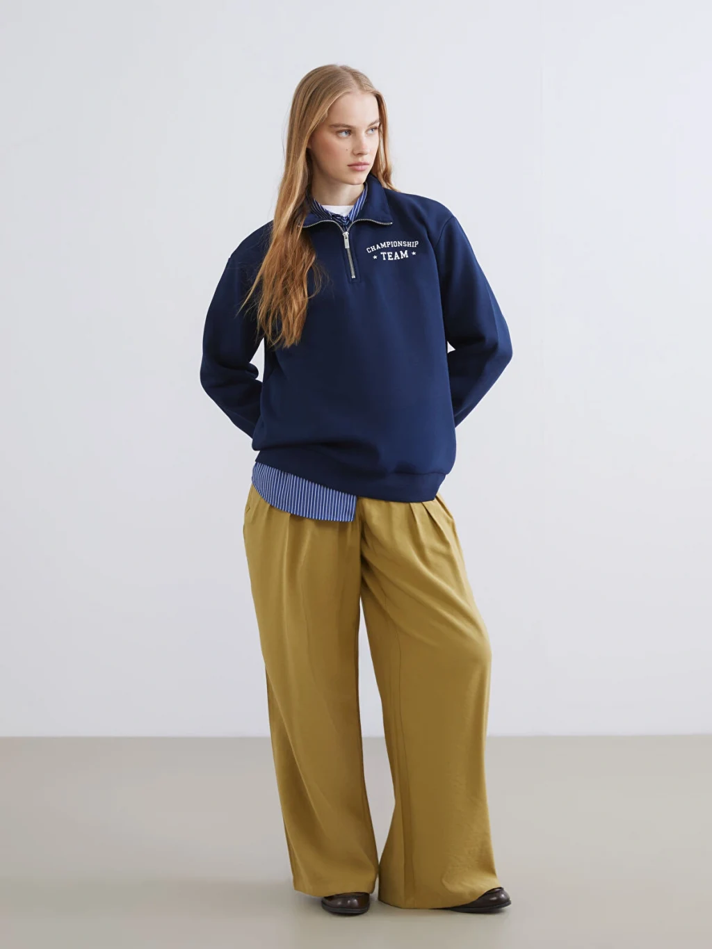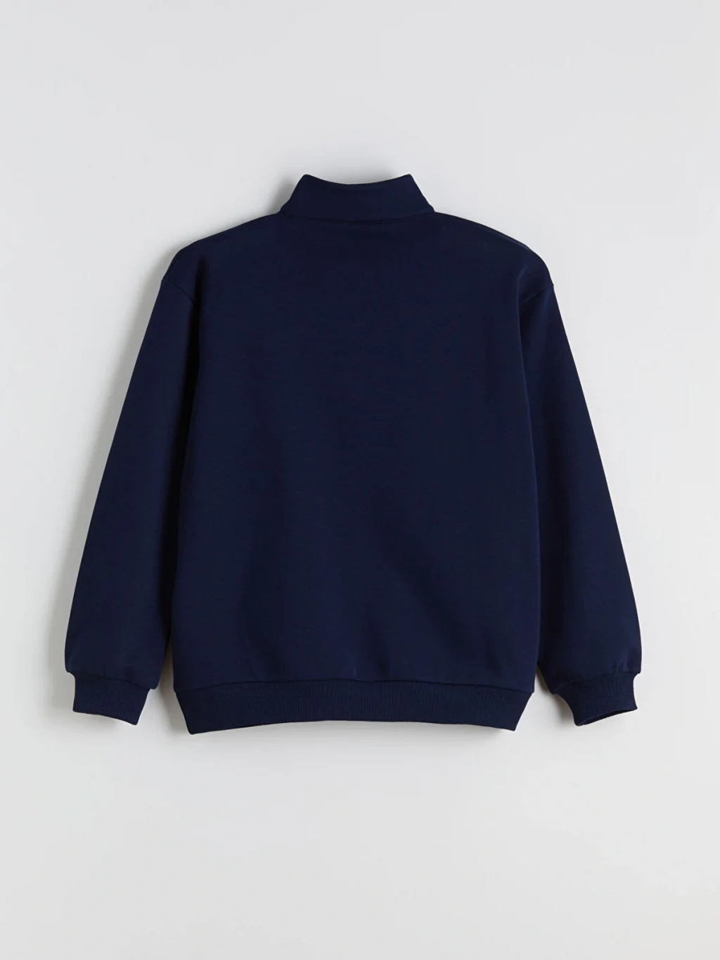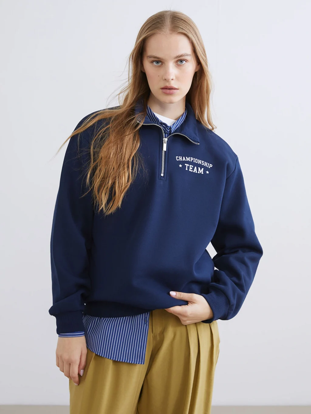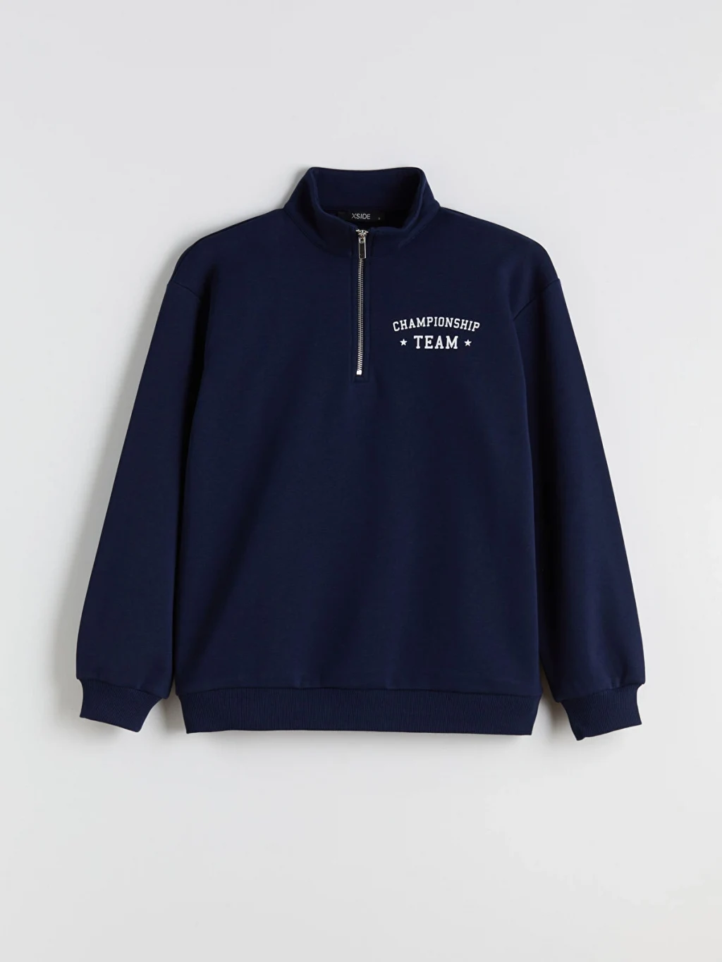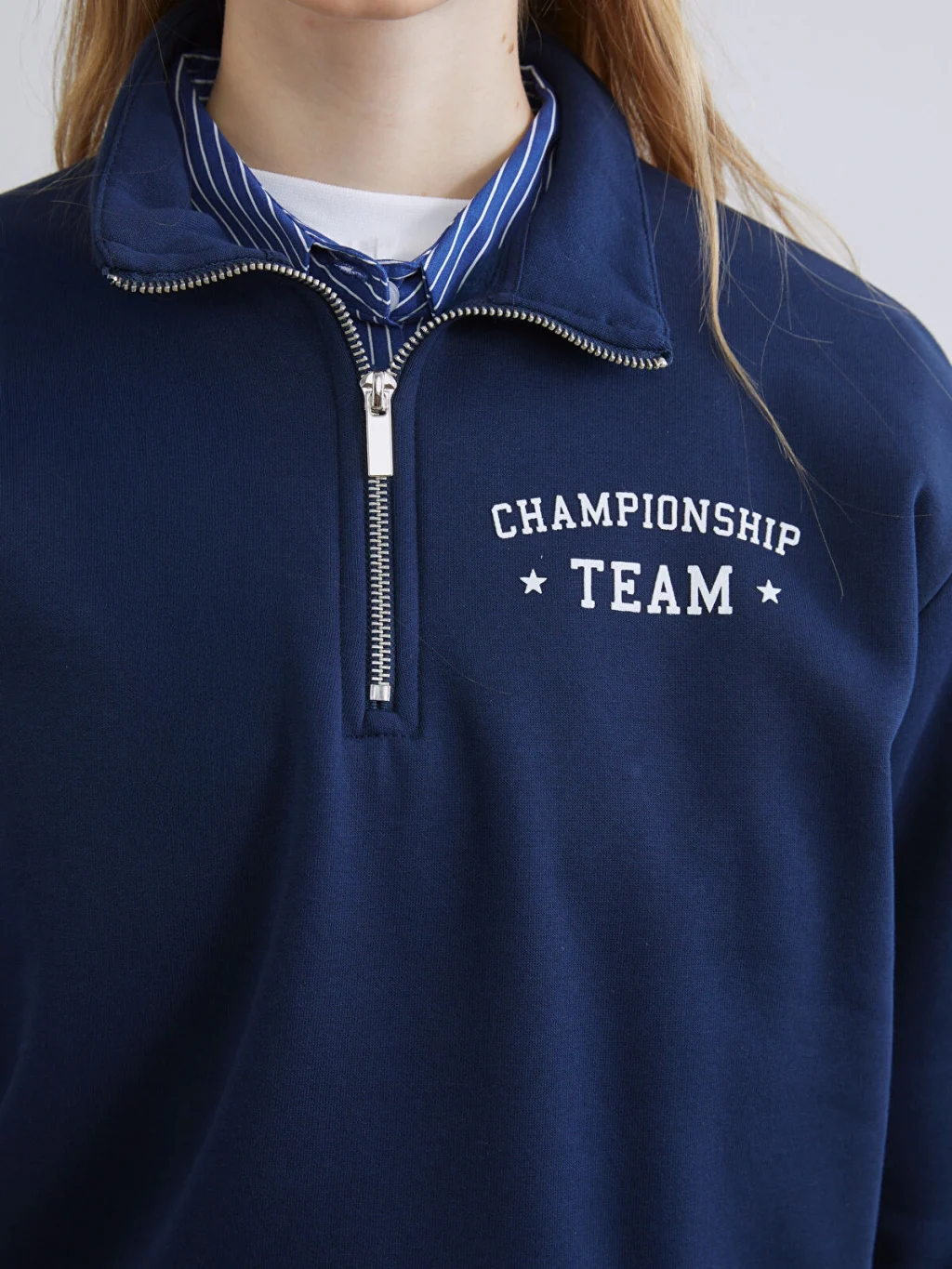 Dik yakalı ve yarım fermuar kapamalı kadın sweatshirt, uzun kolludur. Önü yazı baskılıdır, kol ve etek ucu ribanalıdır.