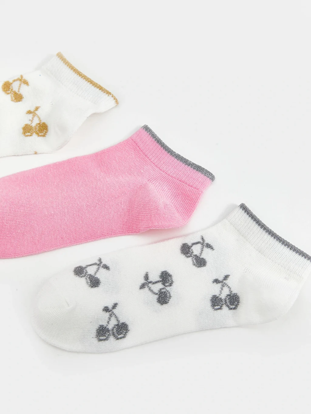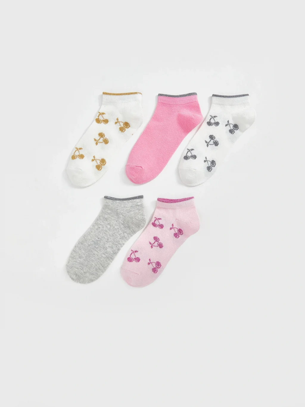 Düz ve kiraz desenli modellerden oluşan 5'li kız çocuk patik çorap seti. Çorapların bilek kısımları ribanalıdır.