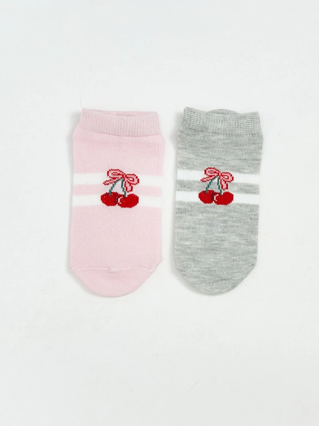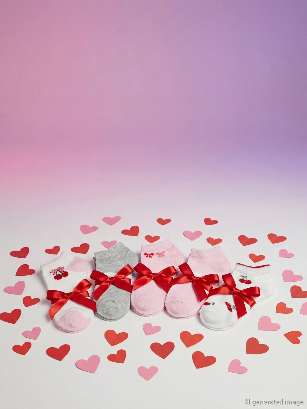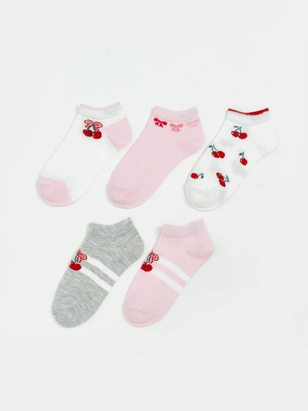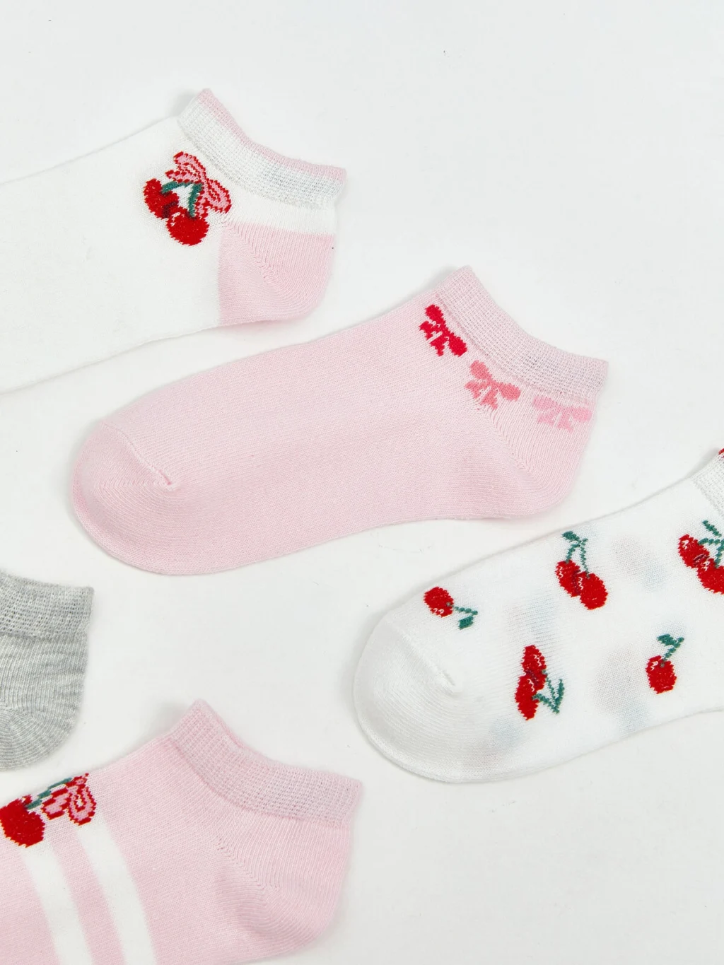 Kız çocuk için beşli patik çorap seti; kiraz, fiyonk ve çizgi desenli farklı tasarımlardan oluşur. Bilek kısmı ribanalıdır.