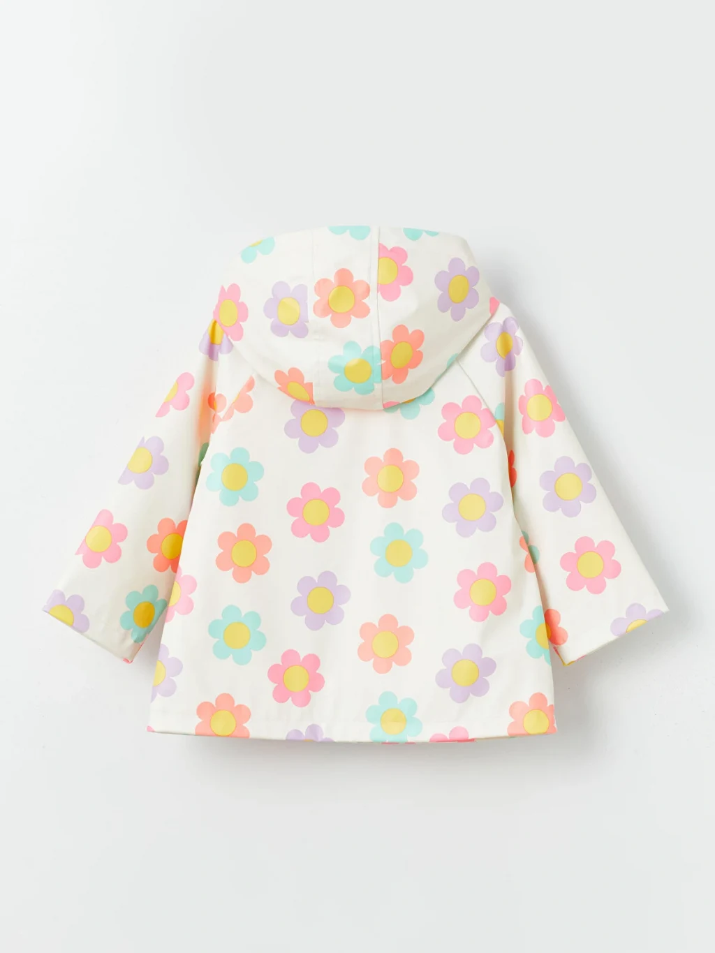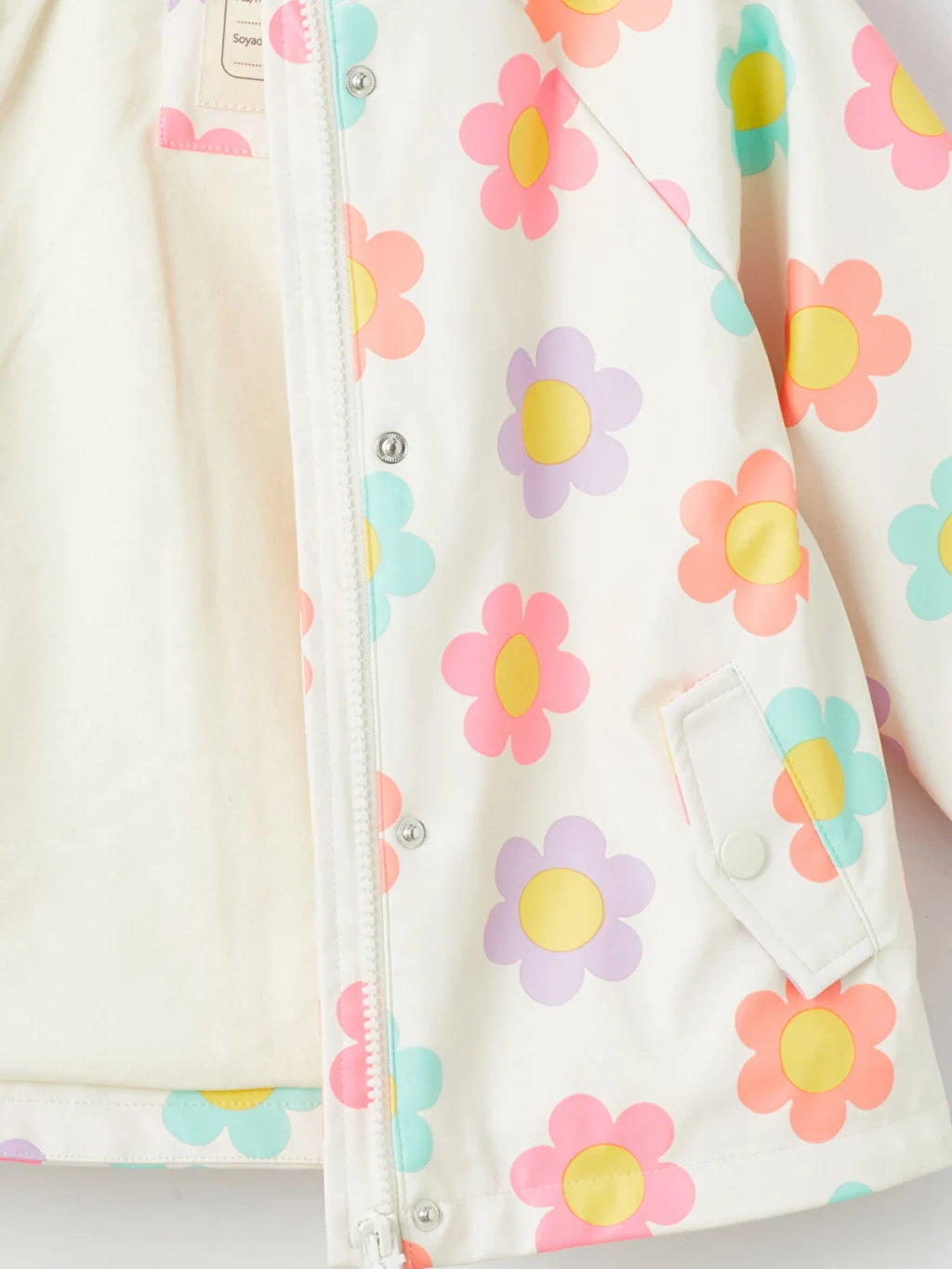 Kapüşonlu çiçekli uzun kollu yağmurluk, yağmurlu havalarda bebeğinizi korumak için fermuar ve çıtçıt kapamalı olarak tasarlanmıştır. Fermuar, çene koruması sayesinde cildi tahriş etmez.