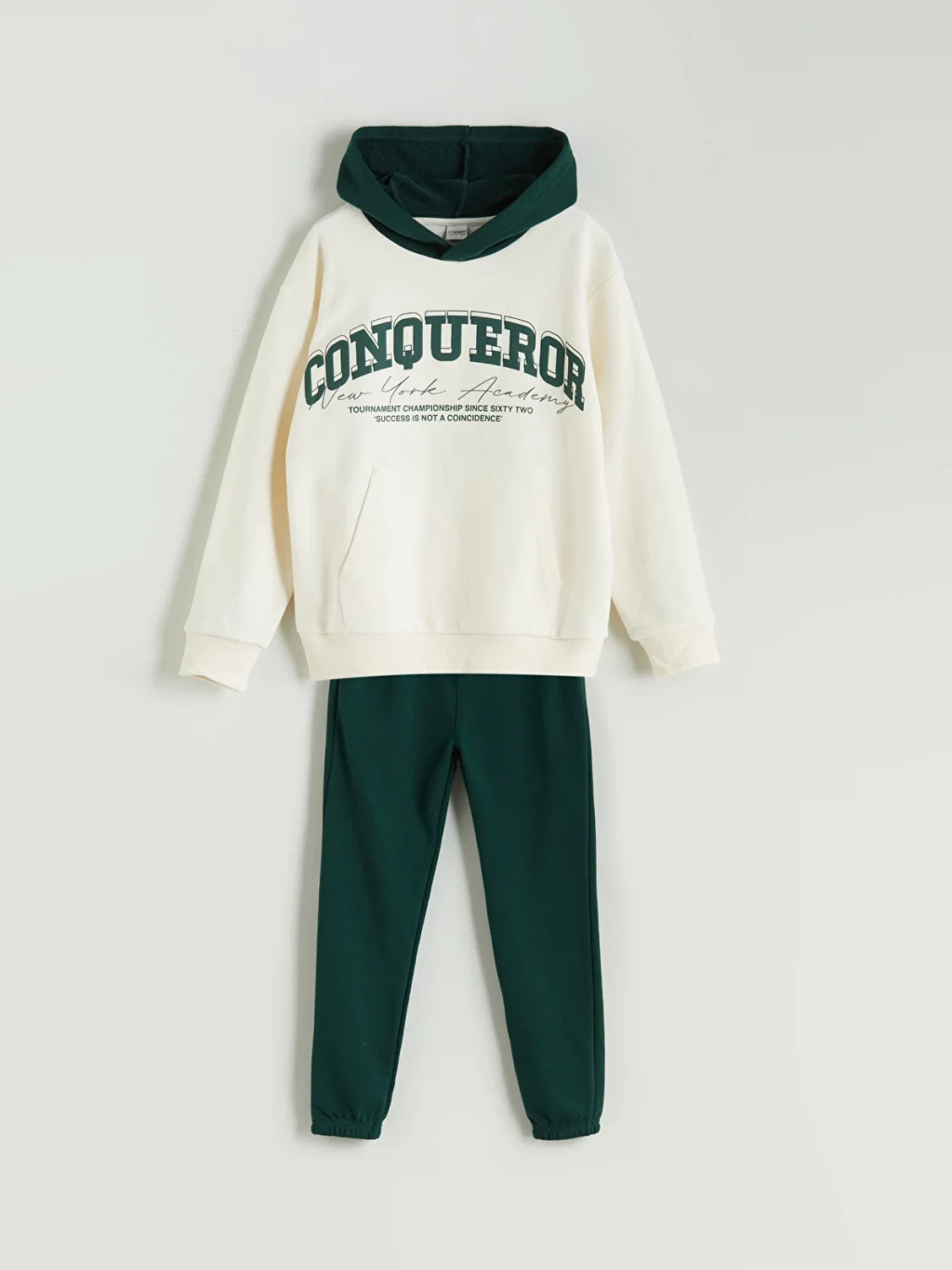 Baskılı erkek çocuk eşofman takımı, 3 iplik kumaştan üretilmiştir. Üstü kapüşonlu ve cepli, altı lastiklidir.