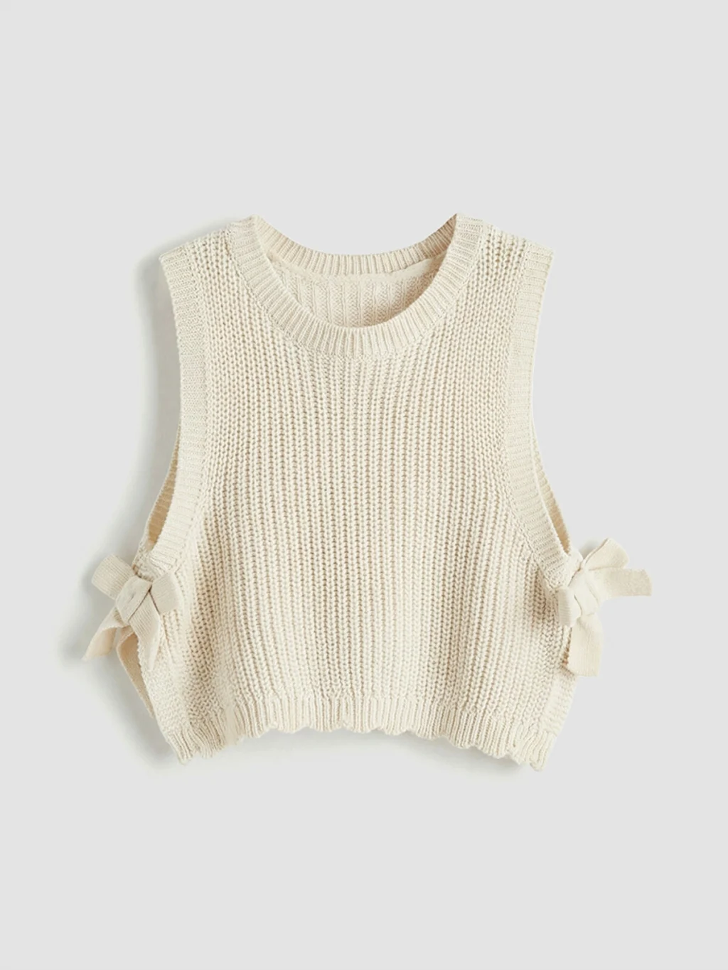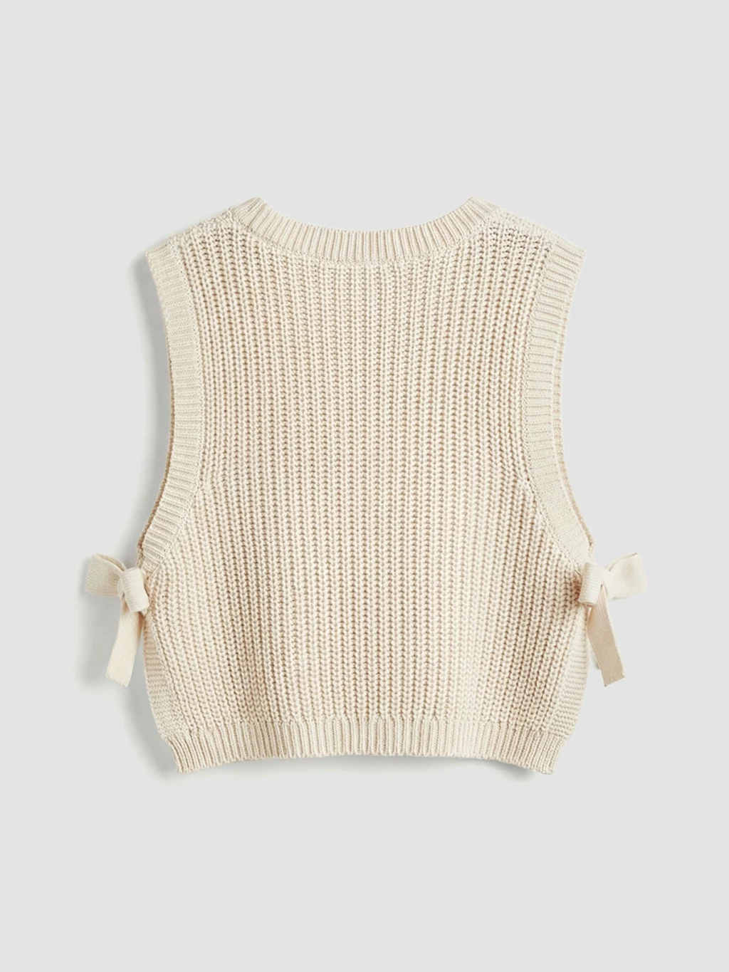 Triko kumaştan üretilmiş, bisiklet yakalı ve kolsuz kız bebek süveter, yanlarında bağlama detaylarına sahiptir.