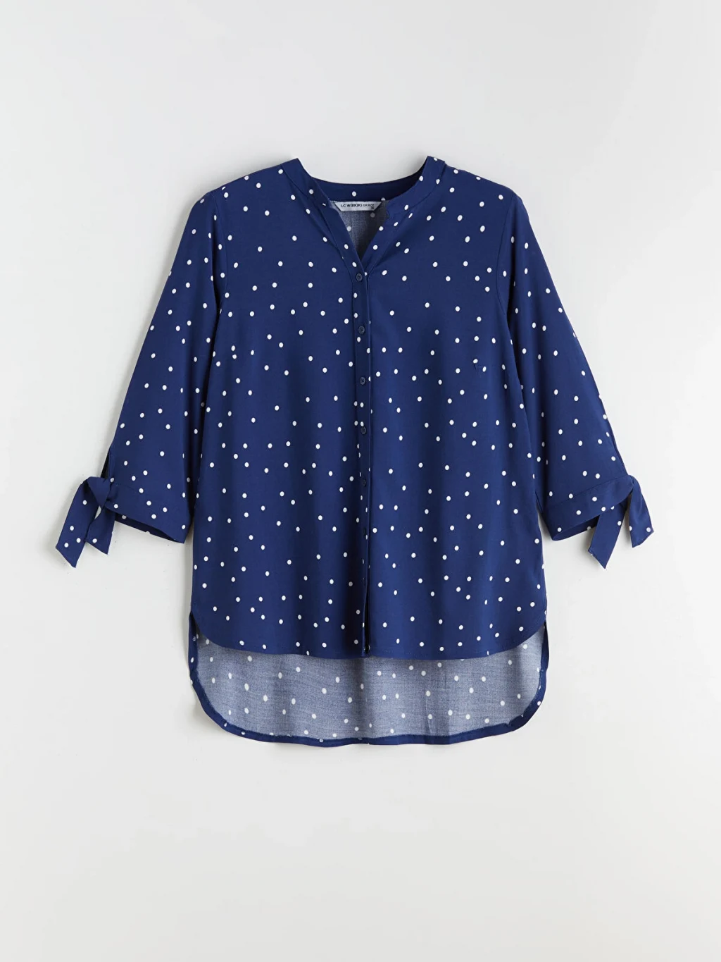 Puantiyeli, kaçık yaka kadın bluz, önden düğme kapamalıdır. Kol uçları bağlama detaylı olup, arkası daha uzundur.