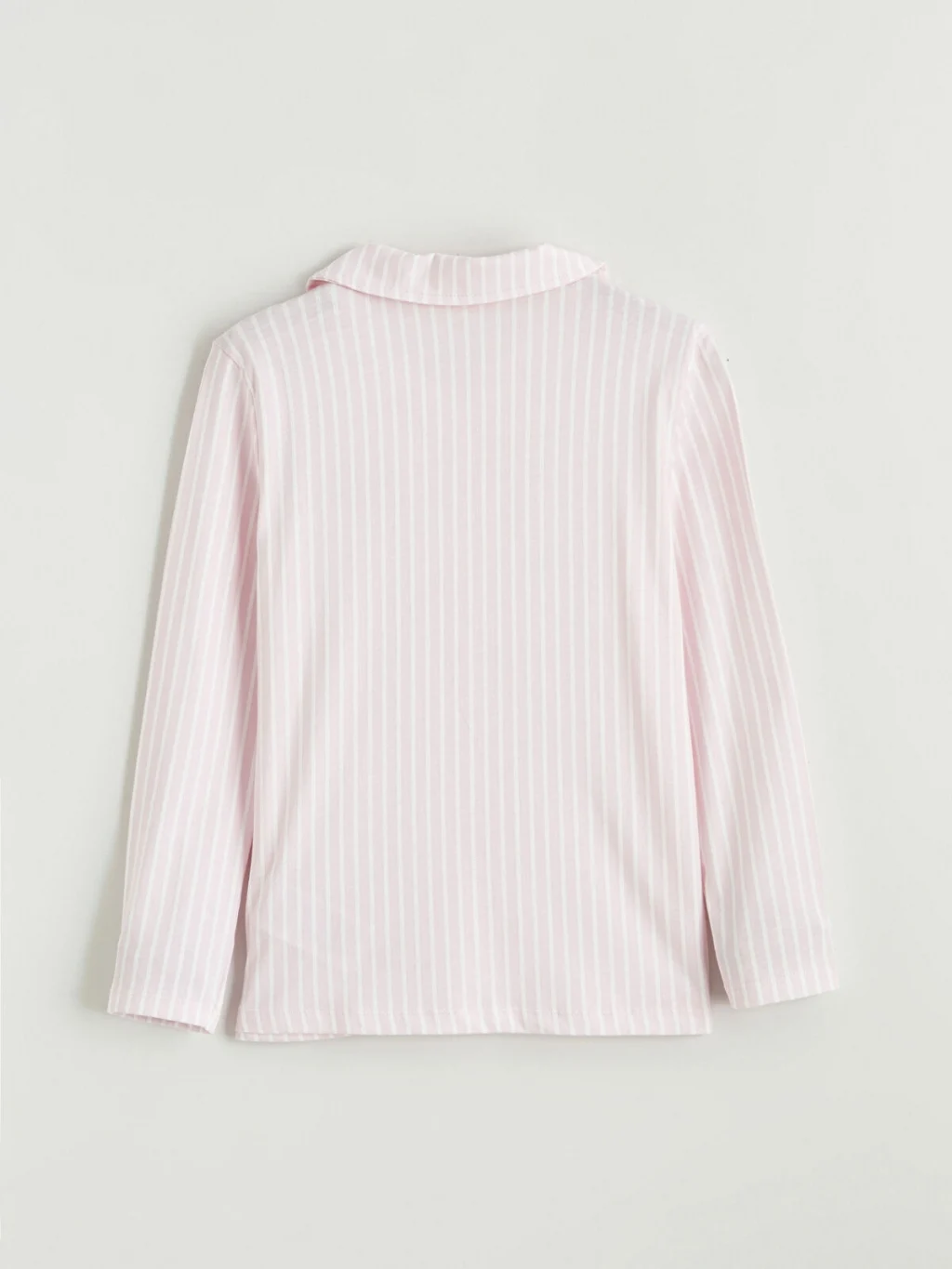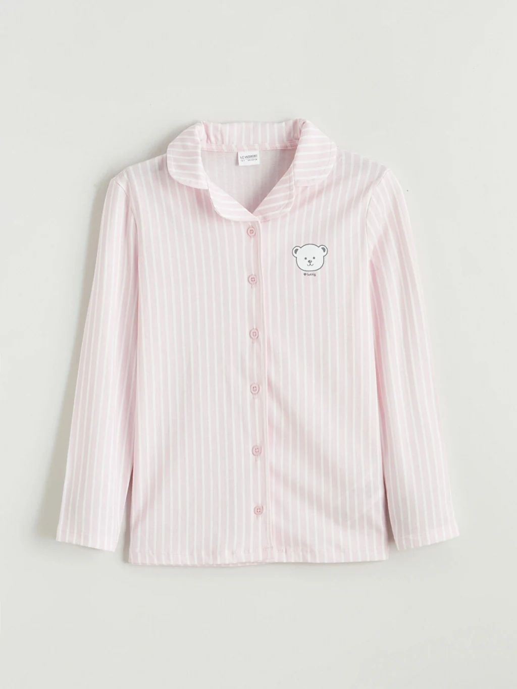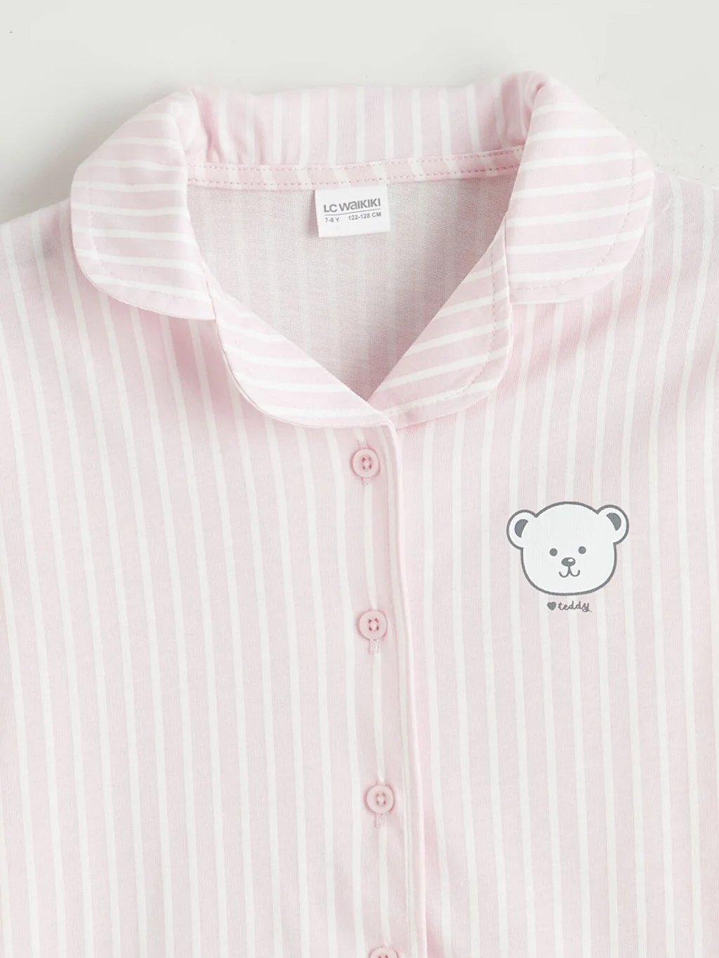 Kız çocuk pijama takımı, %100 pamuklu penye kumaştan üretilmiştir. Gömlek yakalı, uzun kollu, önden düğme kapamalı üst ve pijama altından oluşur.