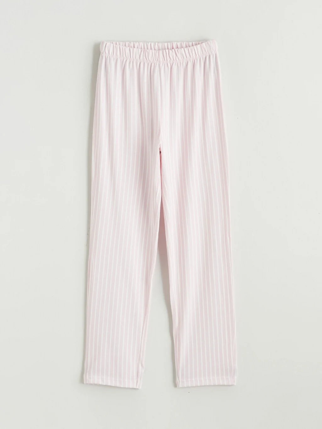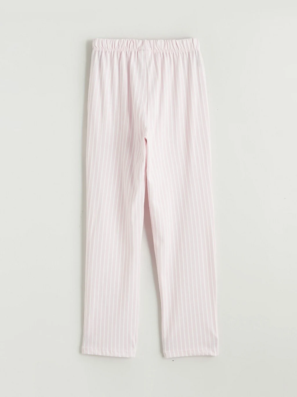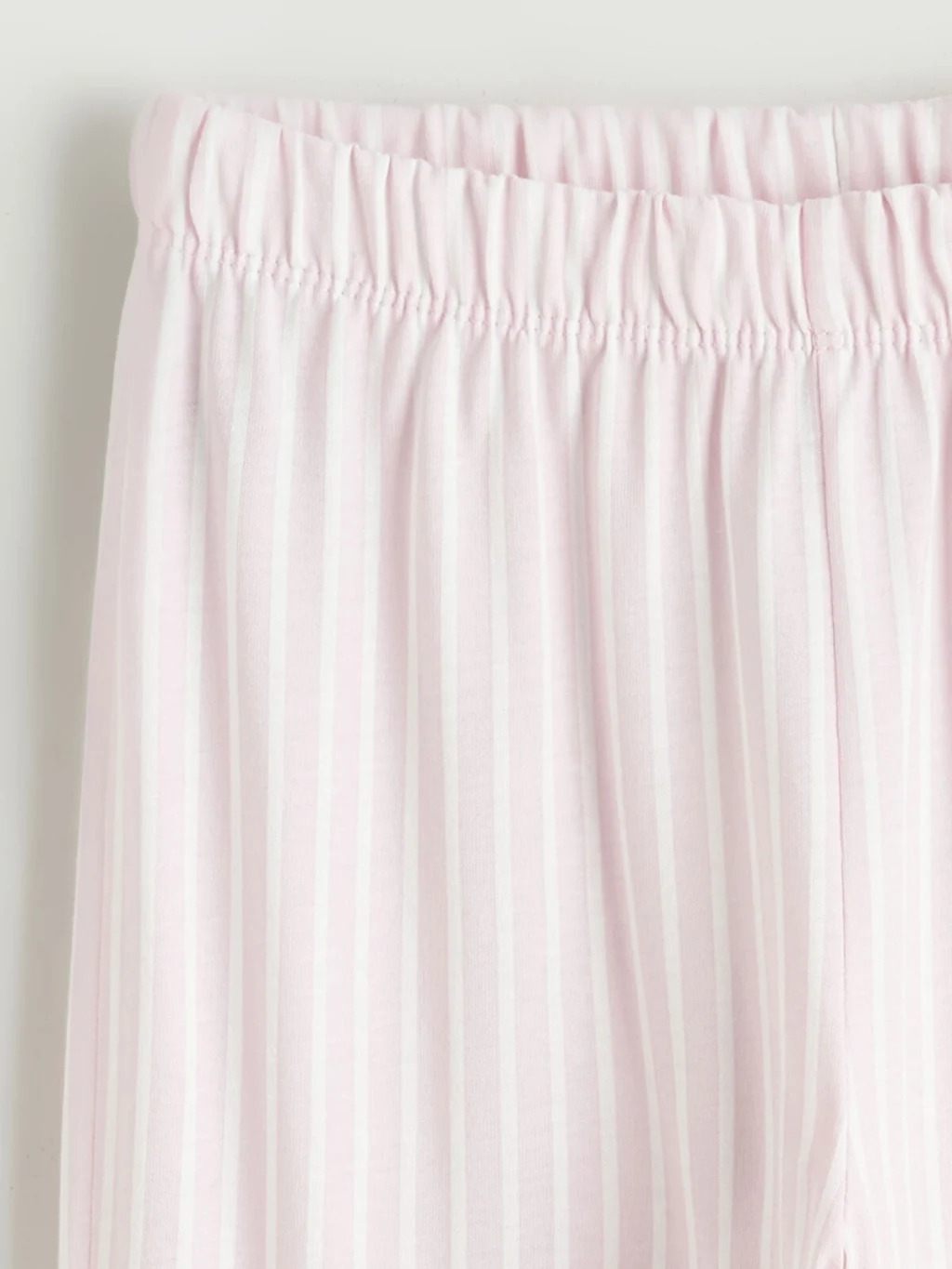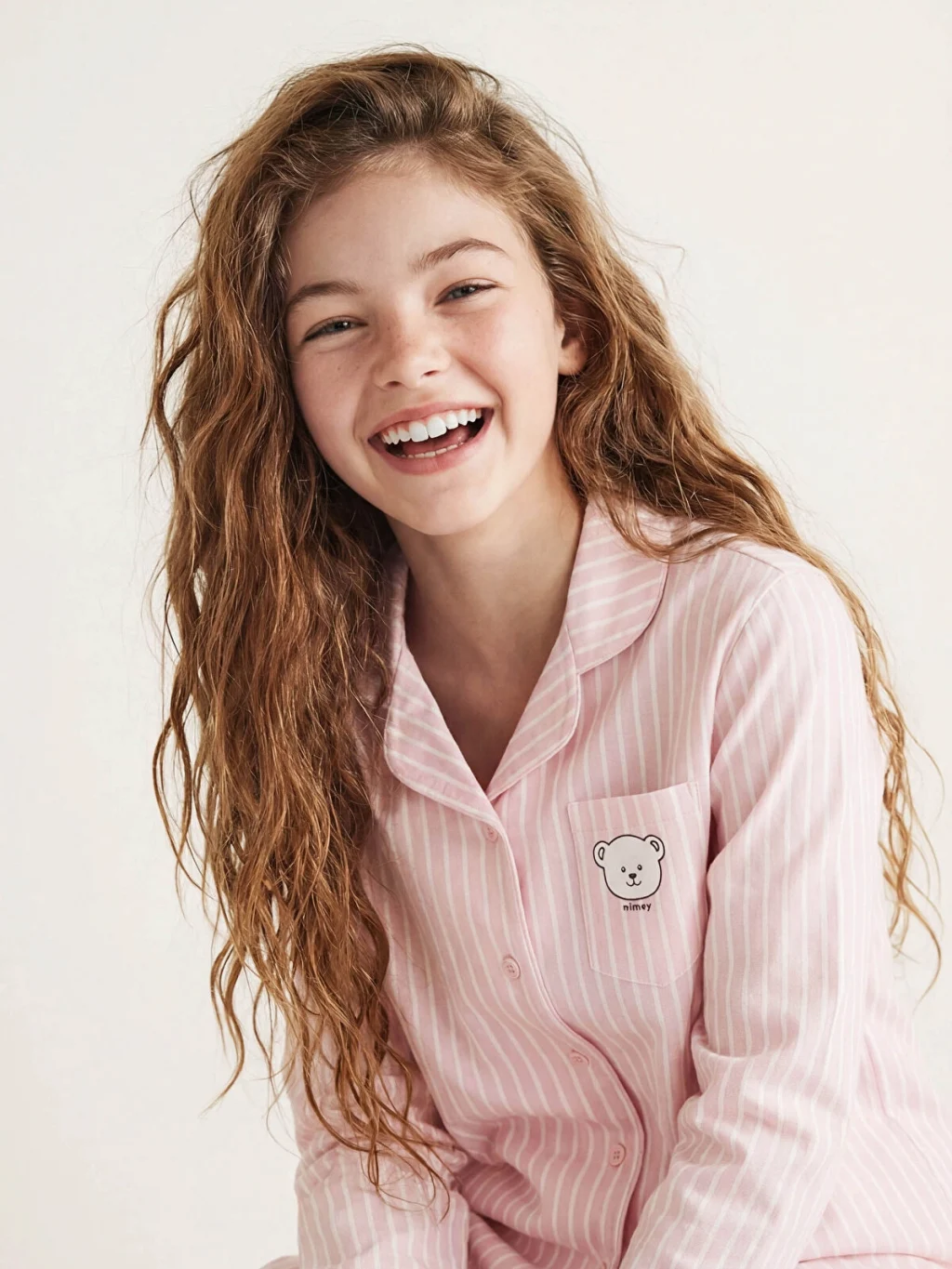 Kız çocuk pijama takımı, %100 pamuklu penye kumaştan üretilmiştir. Gömlek yakalı, uzun kollu, önden düğme kapamalı üst ve pijama altından oluşur.