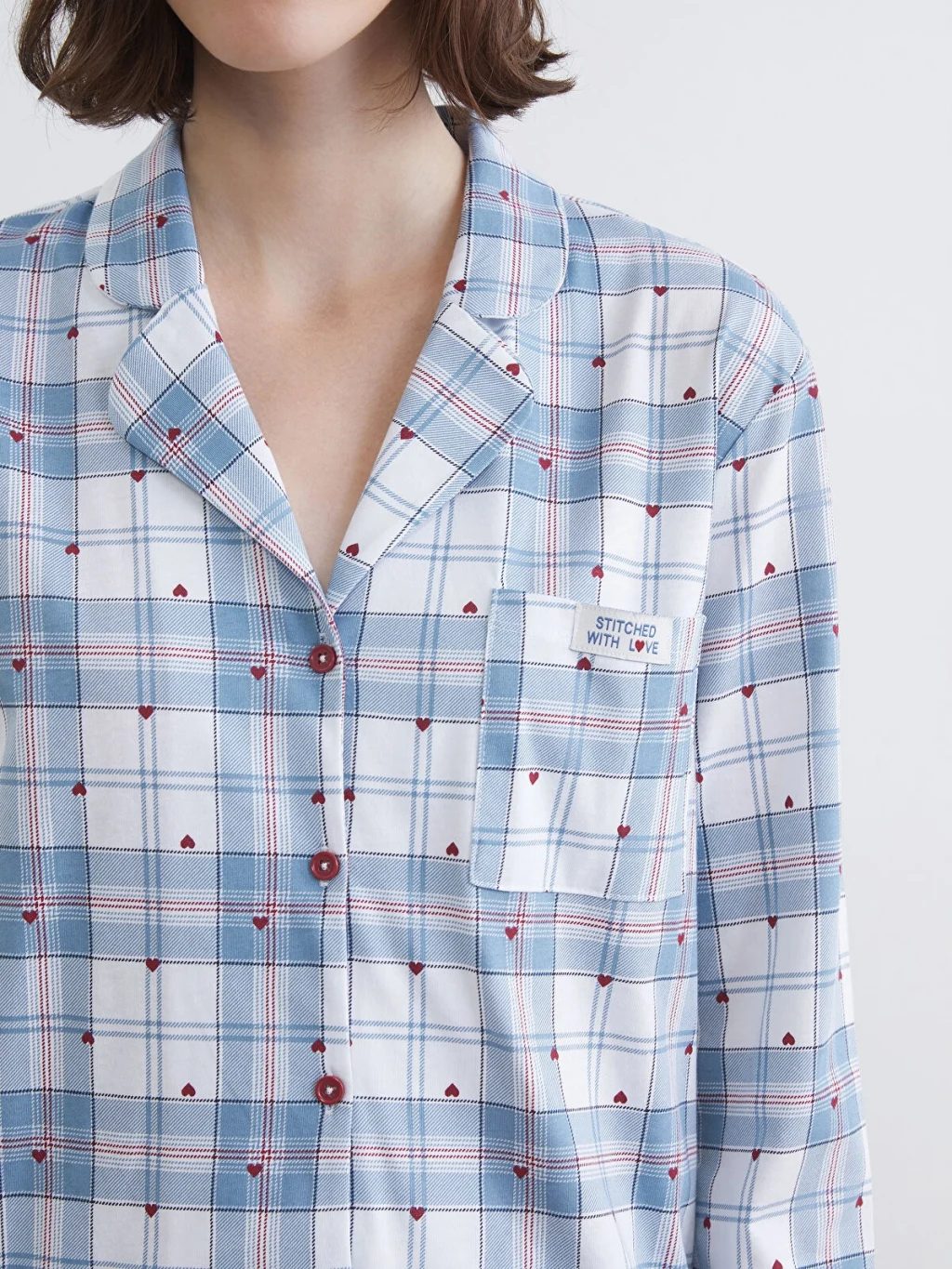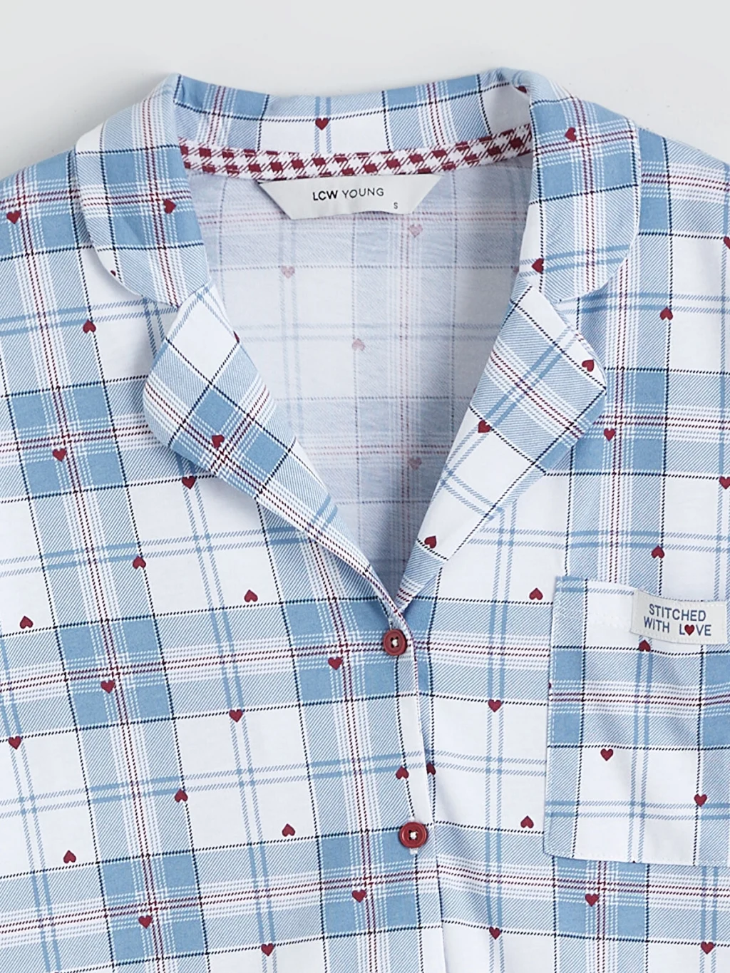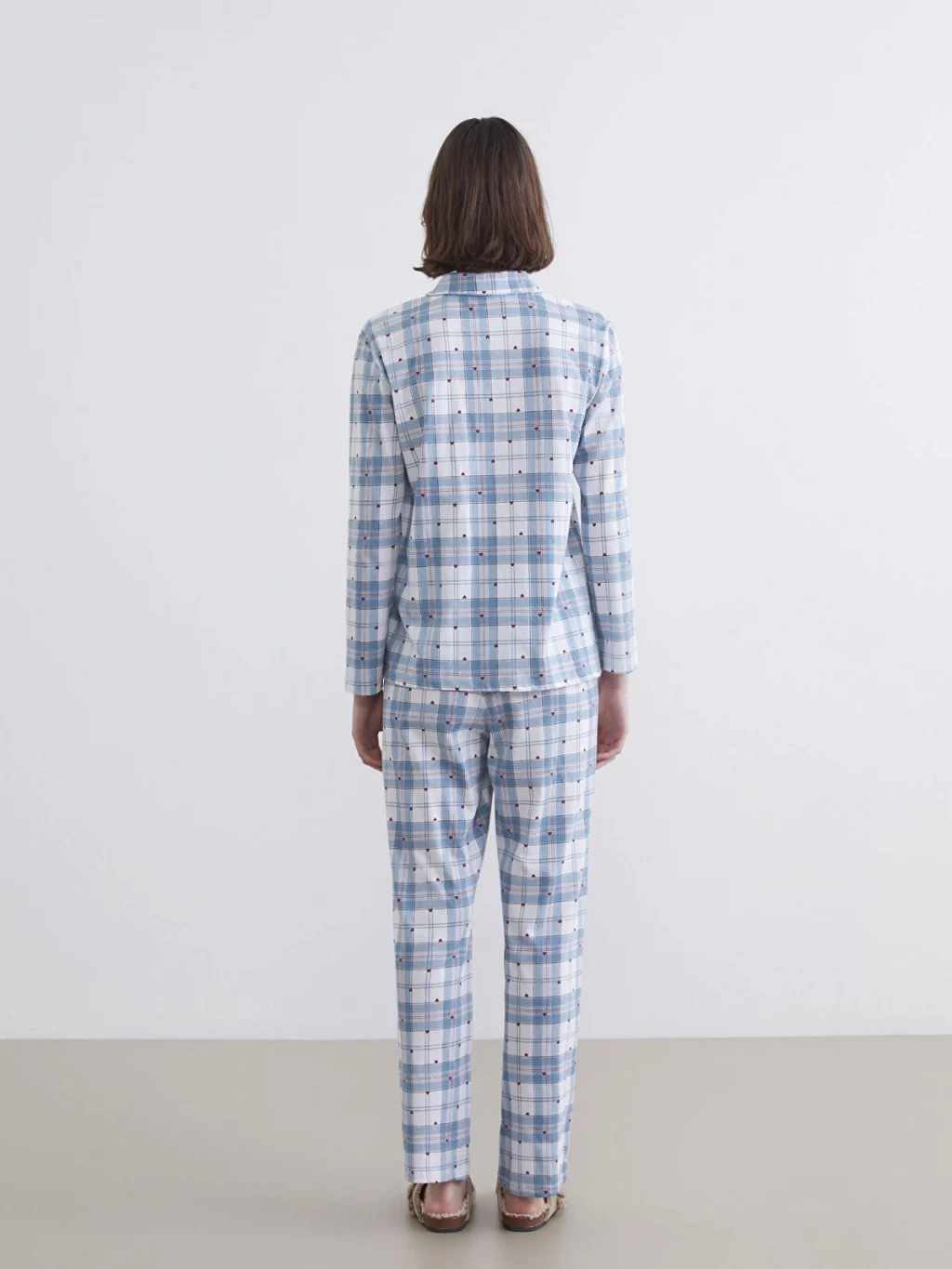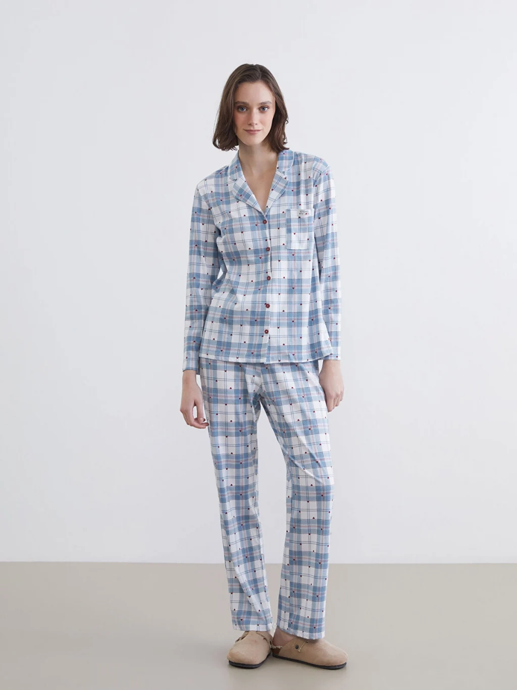 Gömlek yaka kadın pijama takımı, %100 pamuklu kumaştan üretilmiştir. Düğme kapamalı pijama üstü ve beli lastikli pijama altından oluşur.