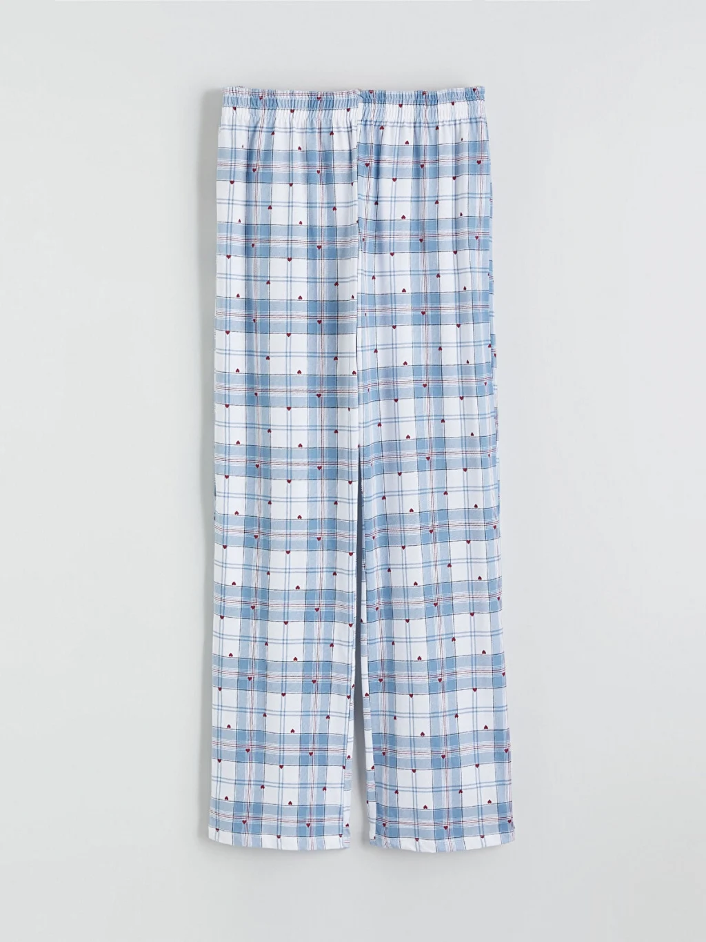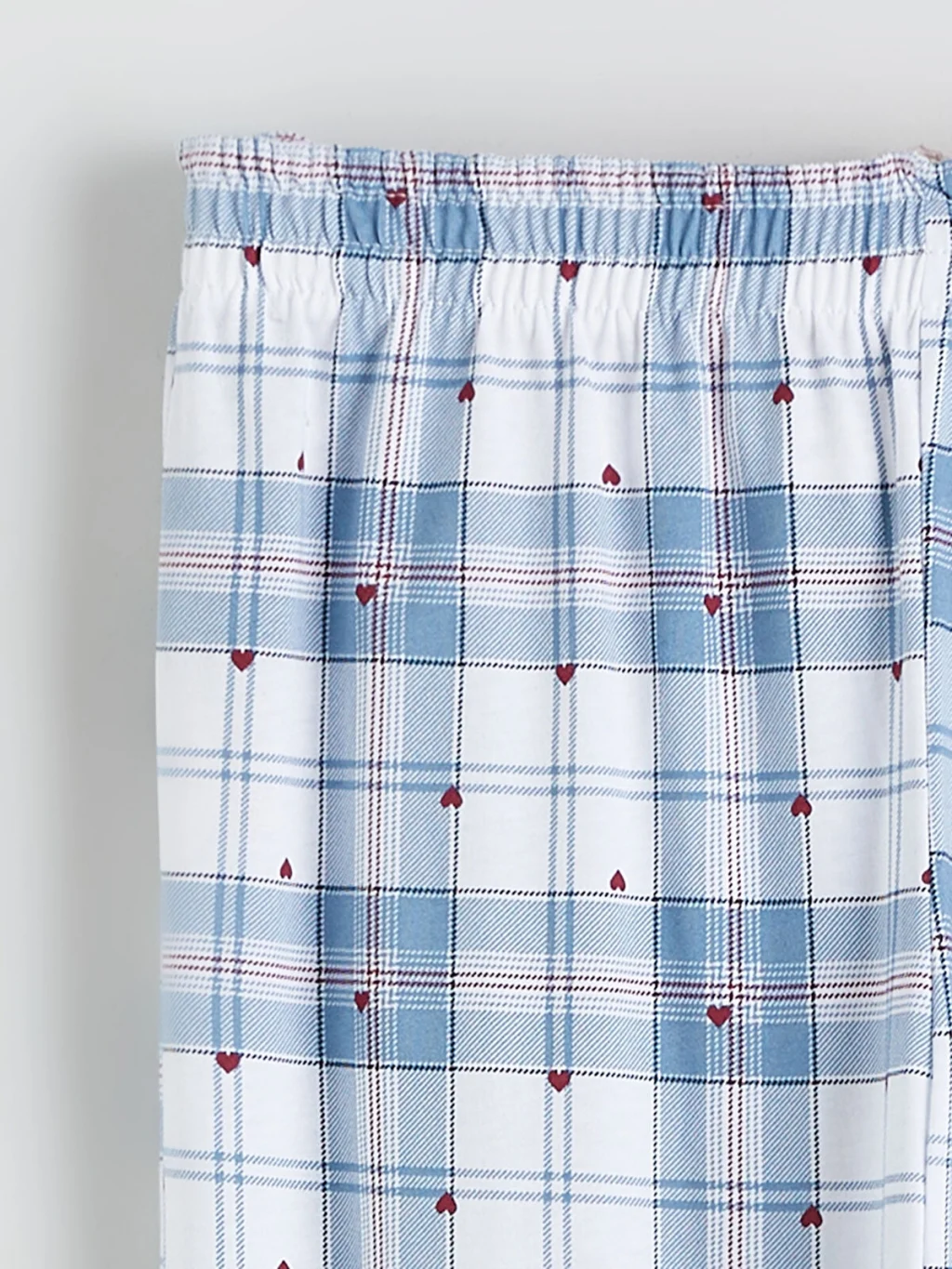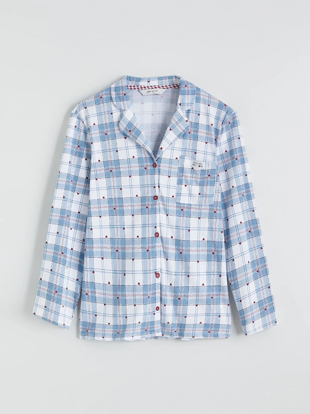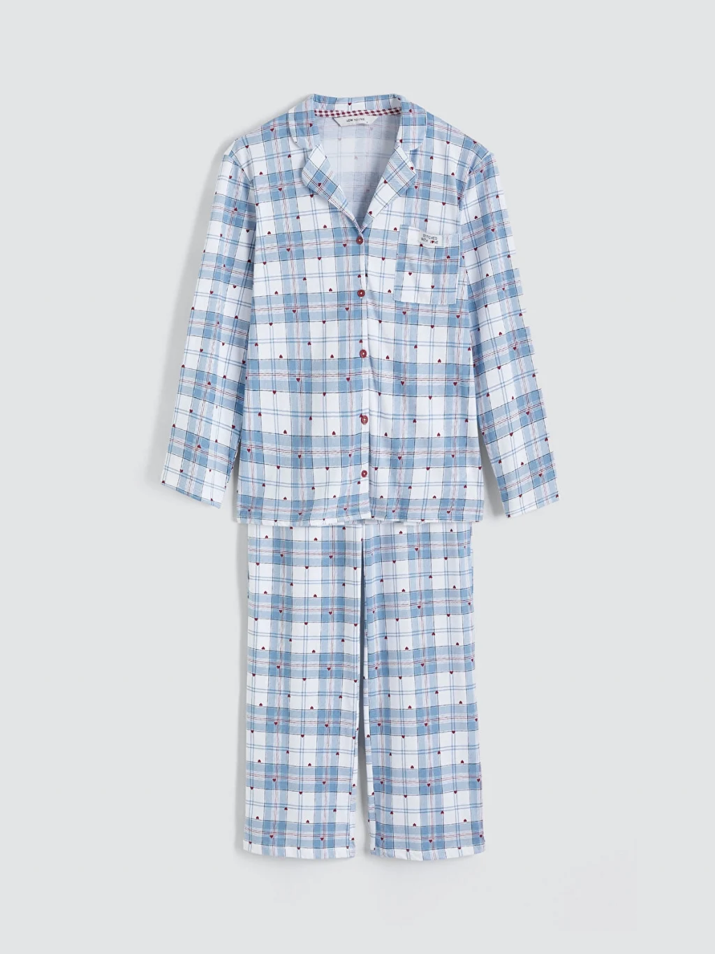 Gömlek yaka kadın pijama takımı, %100 pamuklu kumaştan üretilmiştir. Düğme kapamalı pijama üstü ve beli lastikli pijama altından oluşur.