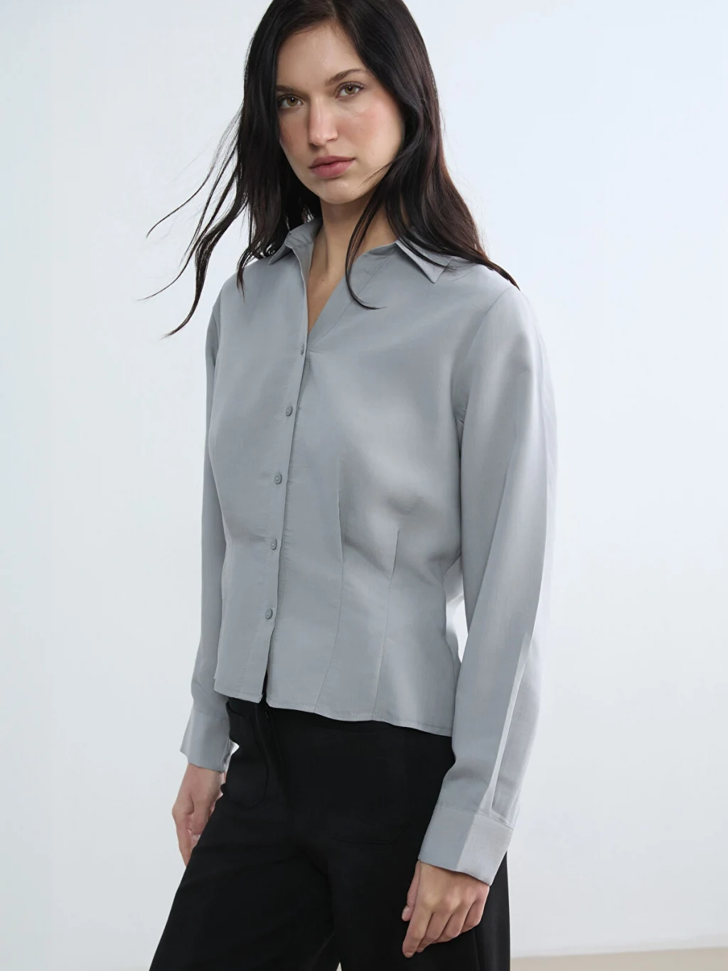 Kadın gömlek, uzun kollu ve manşetlidir. Vücuda oturan bir kesime sahip olup, önden düğmelidir ve yakalıdır.
