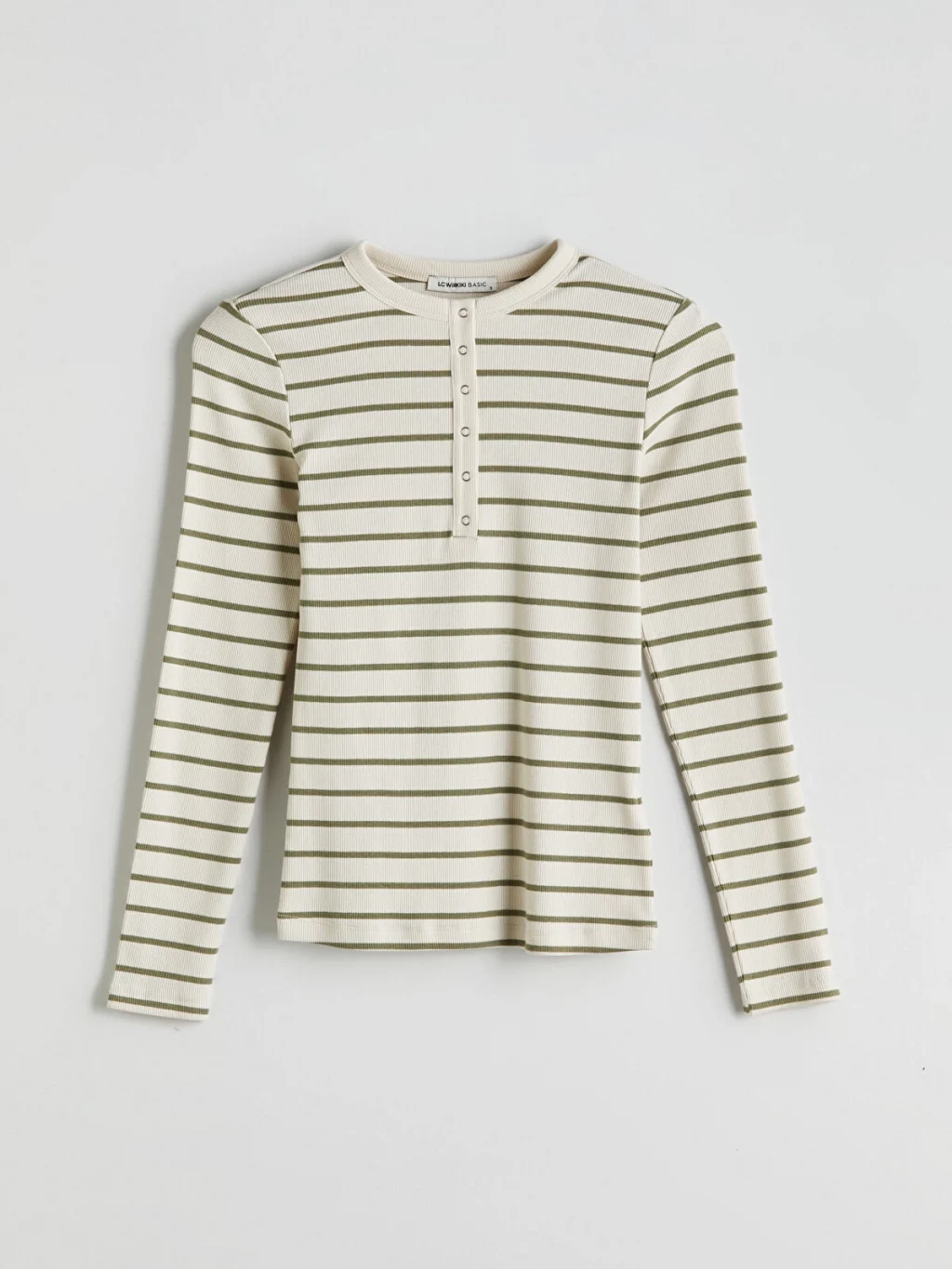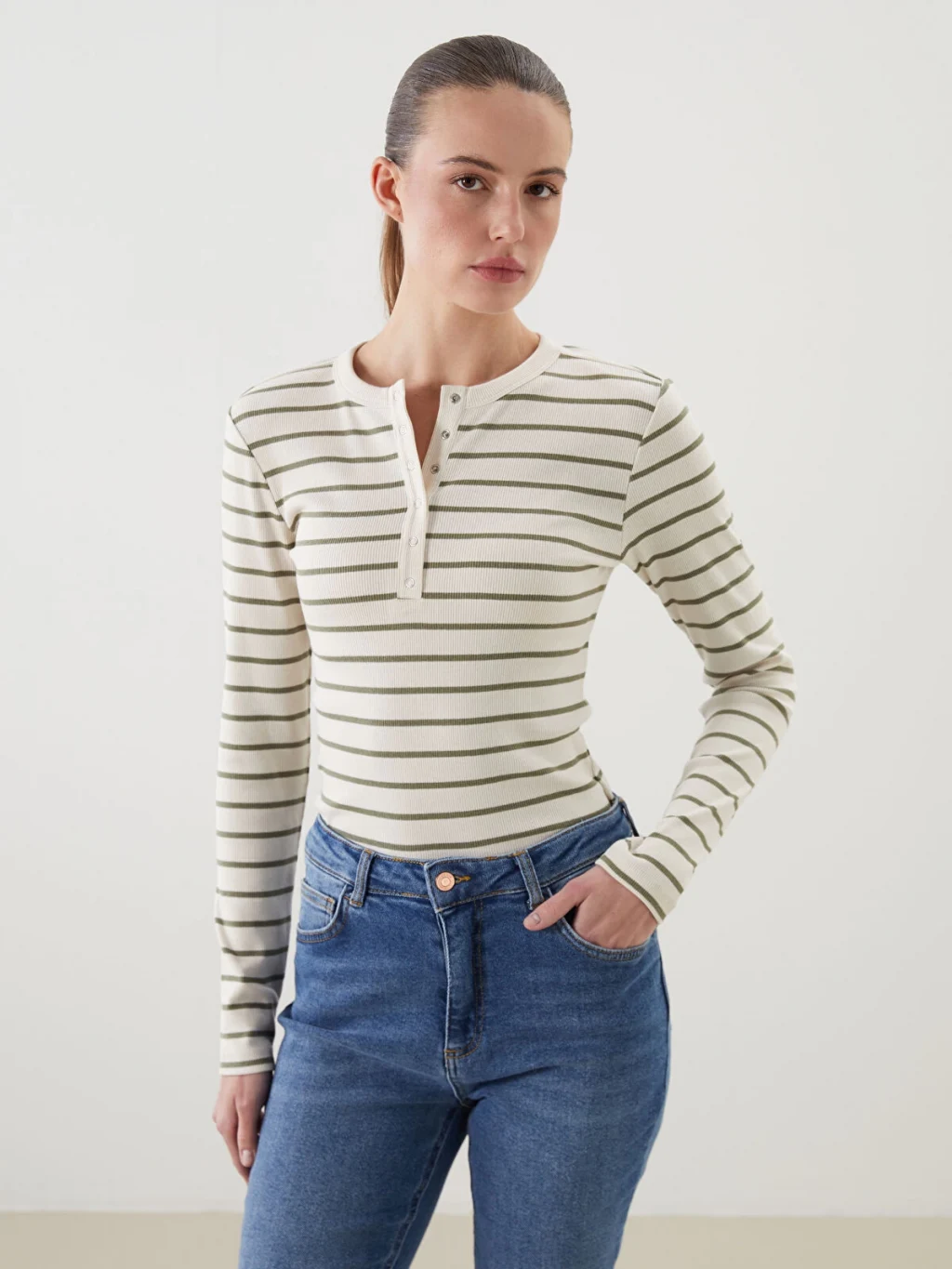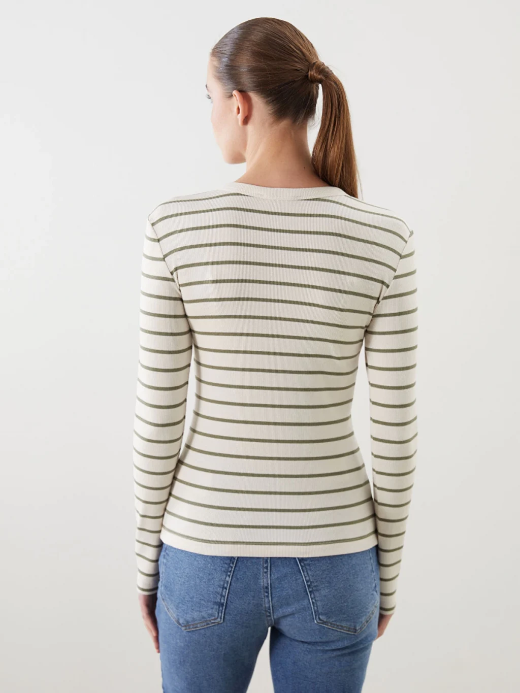 Bisiklet yaka çizgili uzun kollu kadın body, kaşkorse kumaştan üretilmiştir. Yakası çıtçıtlı ve vücudu saran tasarıma sahiptir.