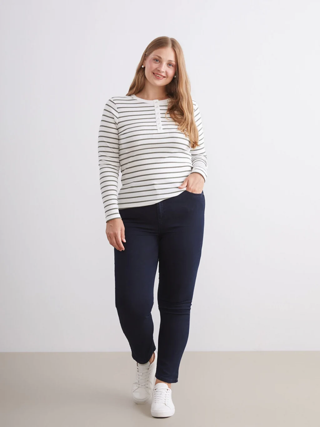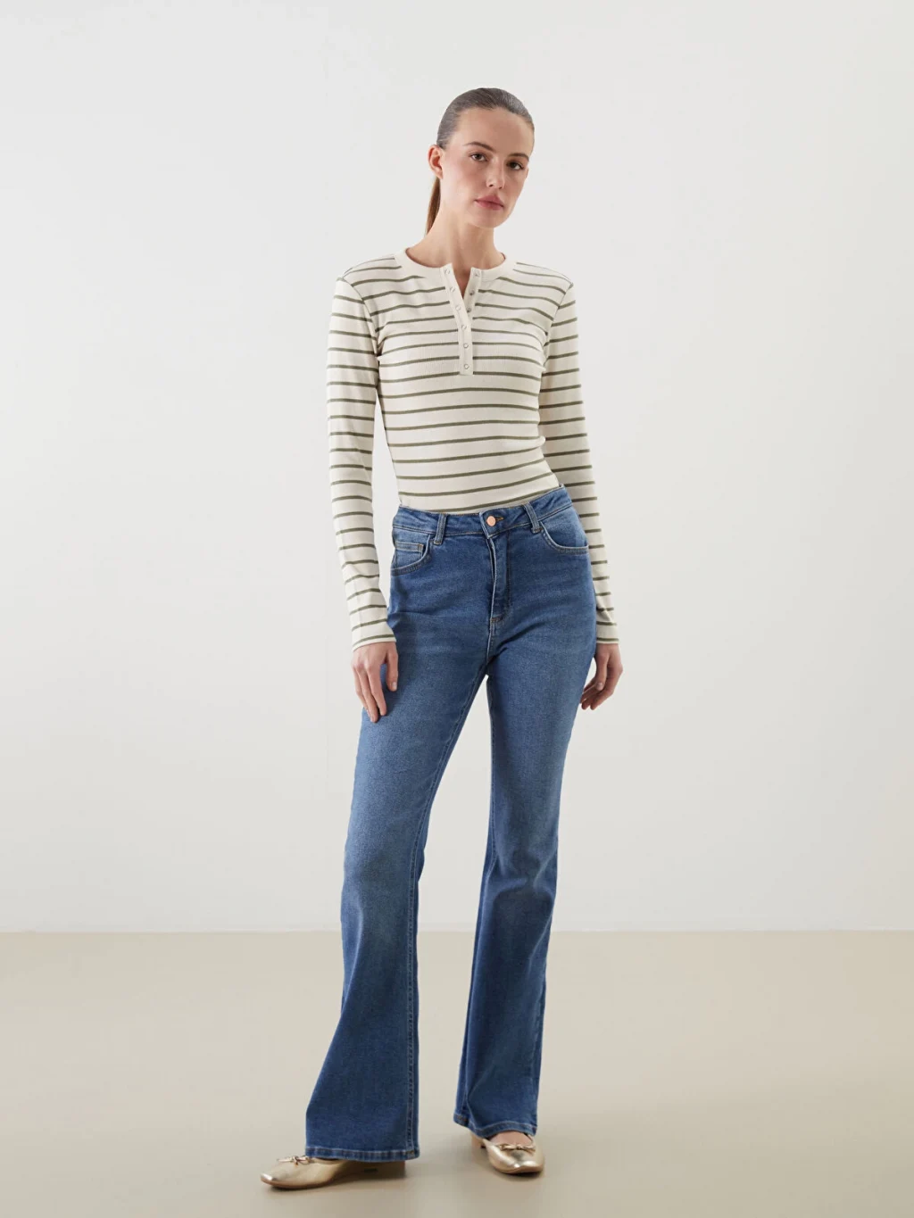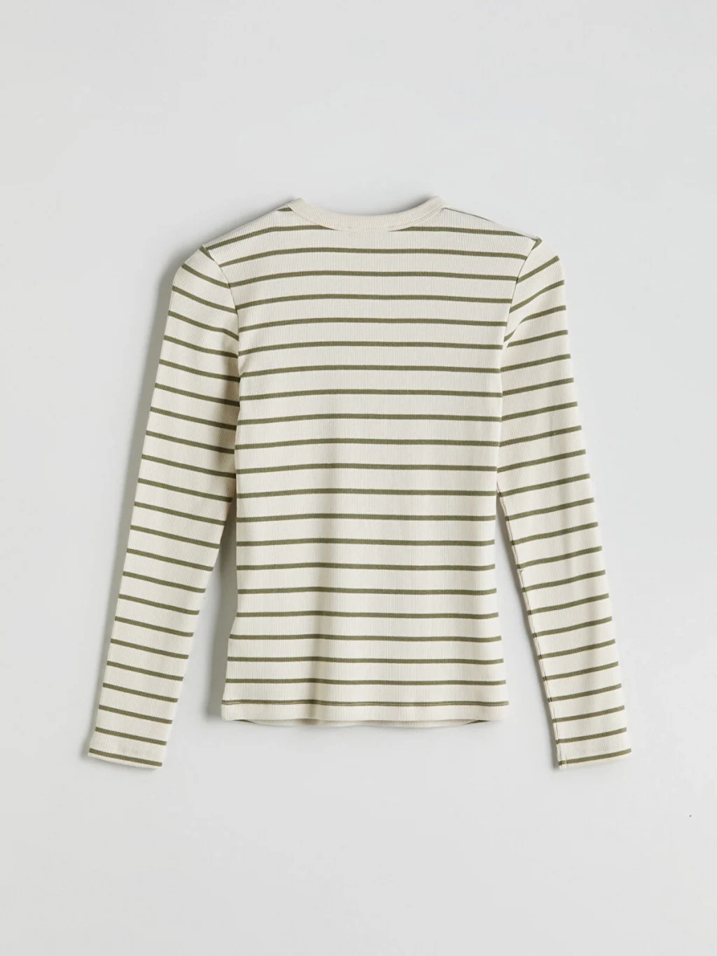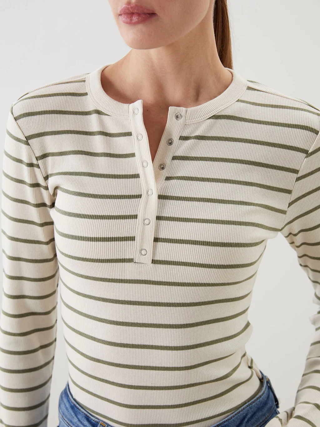 Bisiklet yaka çizgili uzun kollu kadın body, kaşkorse kumaştan üretilmiştir. Yakası çıtçıtlı ve vücudu saran tasarıma sahiptir.