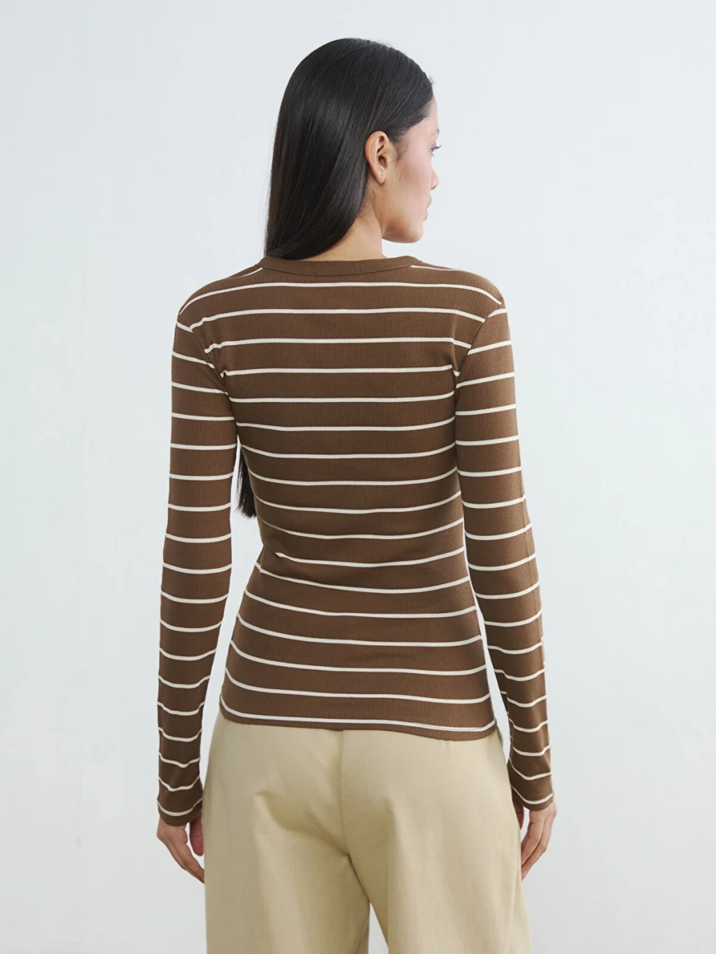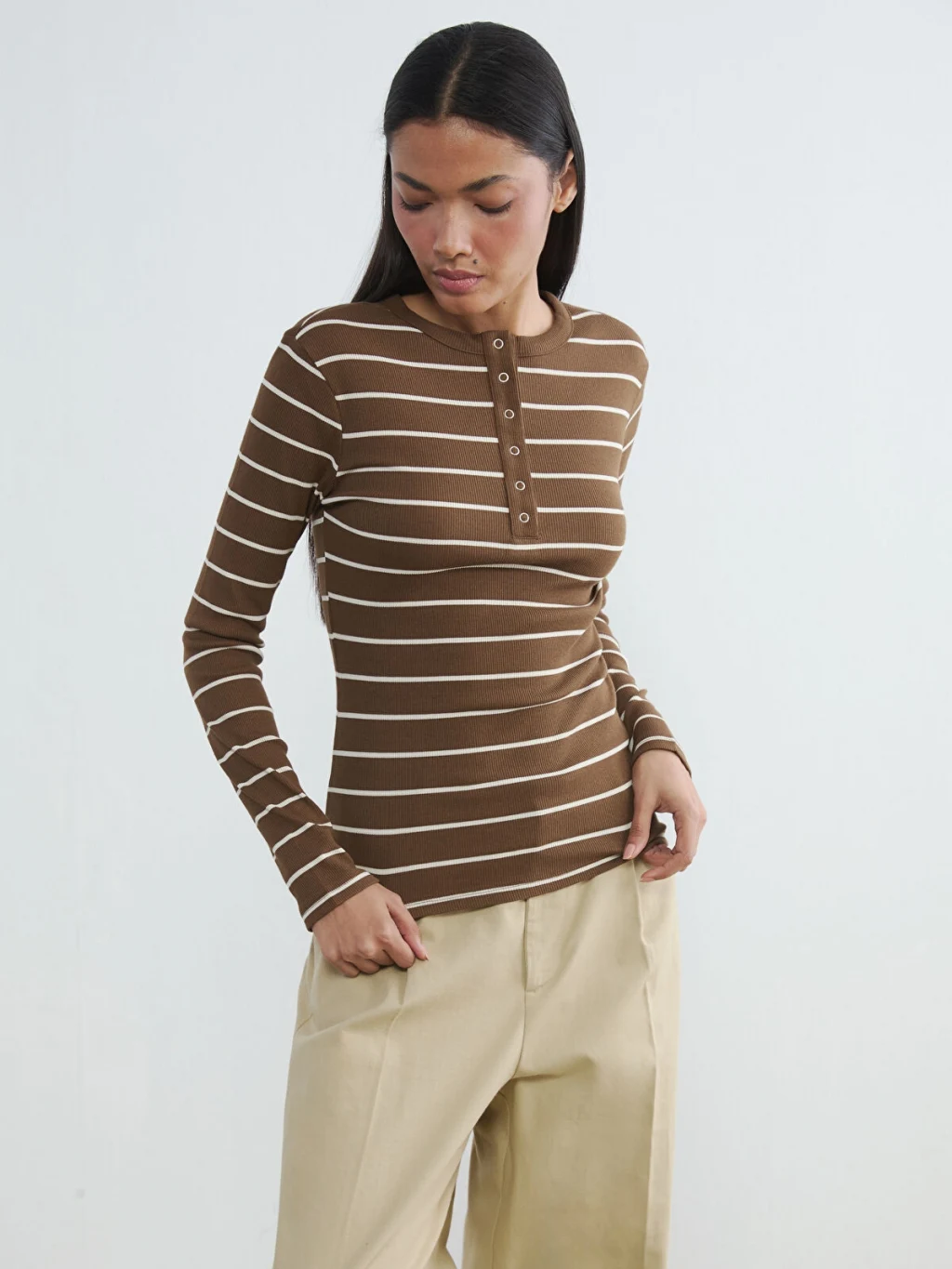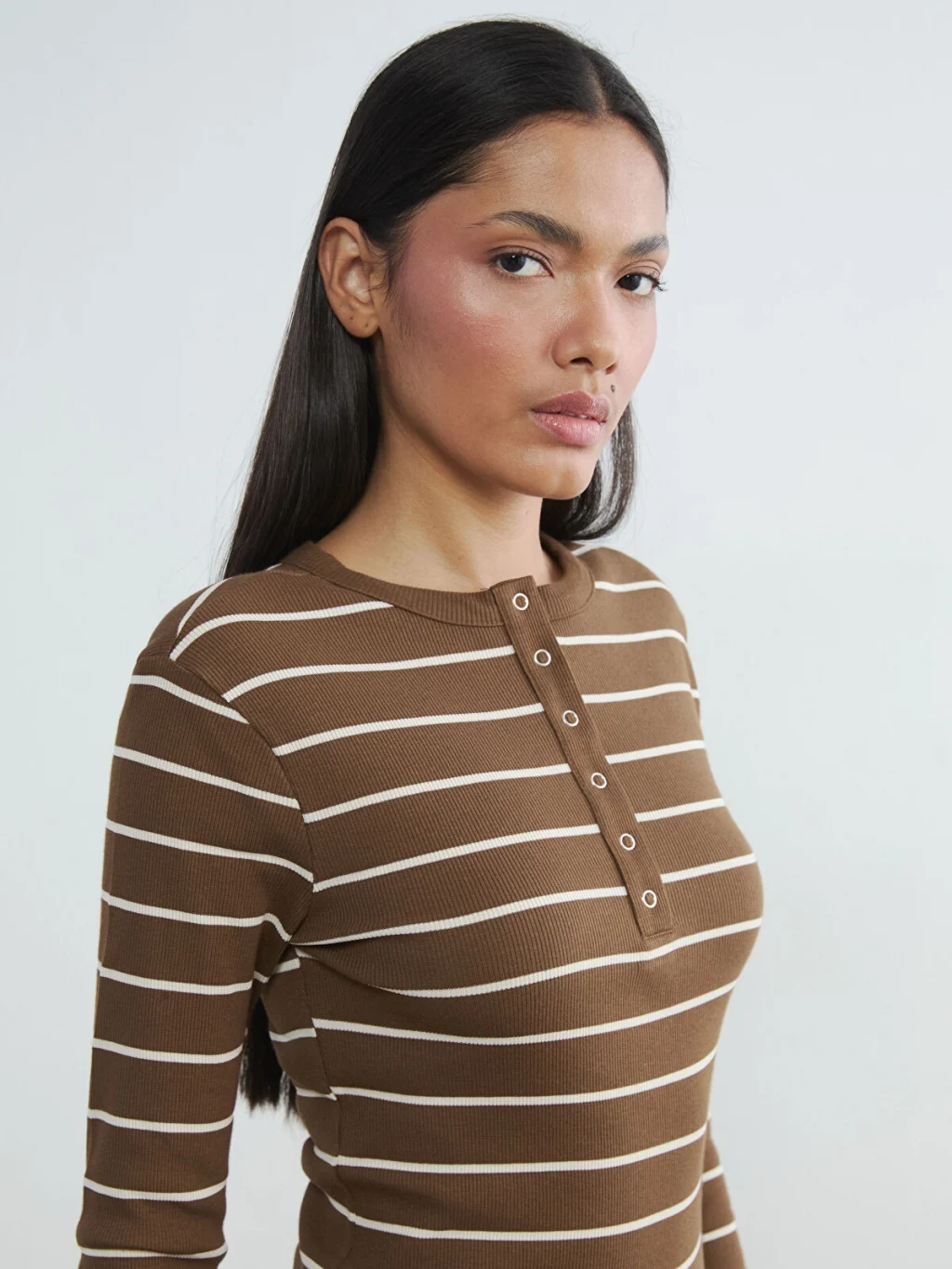 Bisiklet yaka ve uzun kollu kadın body, çizgili desene sahiptir. Ön kısmında düğme kapama detayı bulunur.