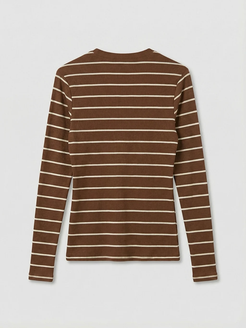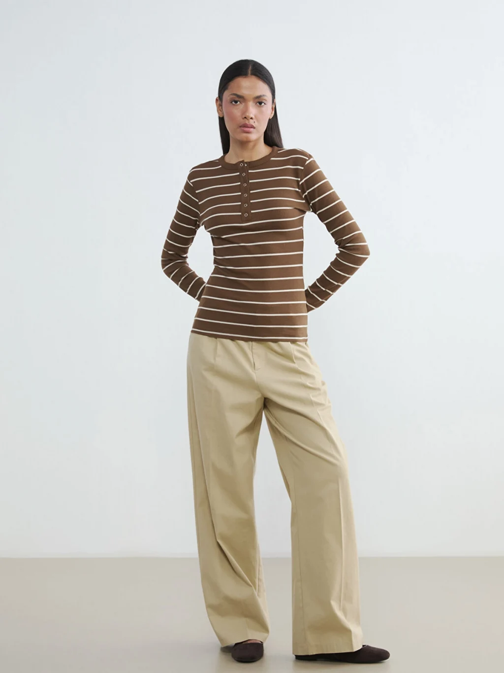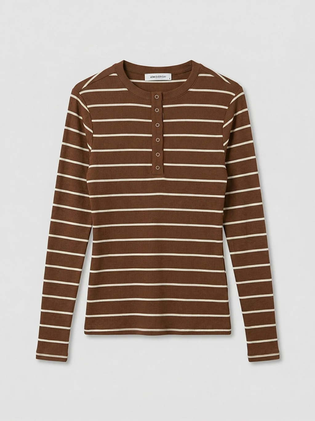 Bisiklet yaka ve uzun kollu kadın body, çizgili desene sahiptir. Ön kısmında düğme kapama detayı bulunur.