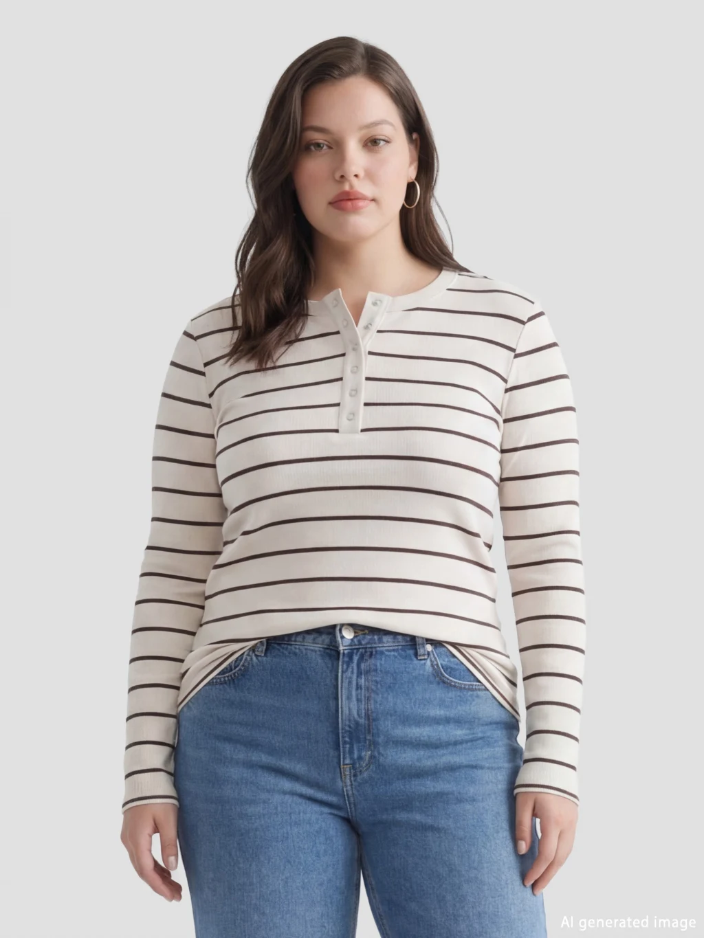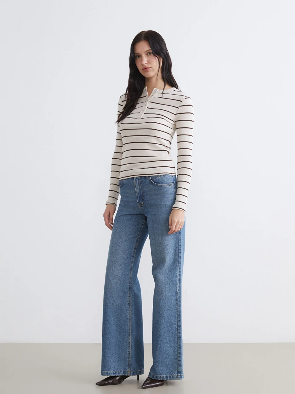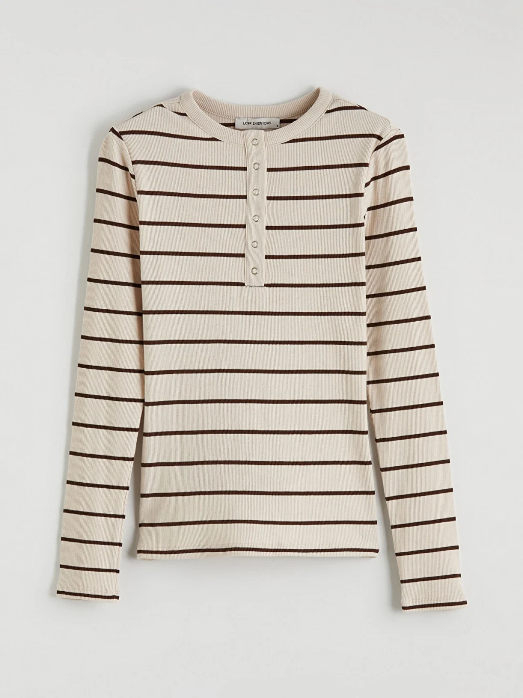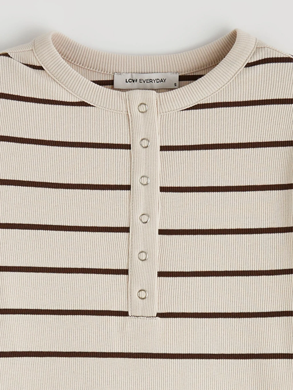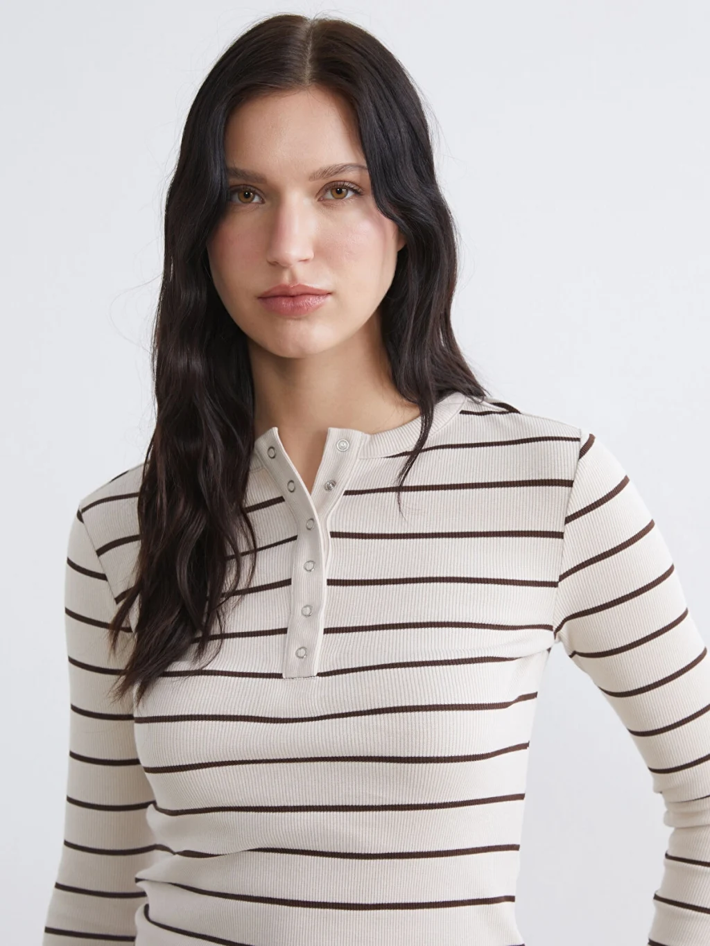 Bisiklet yaka ve uzun kollu kadın body, çizgili desene sahiptir. Ön kısmında düğme kapama detayı bulunur.