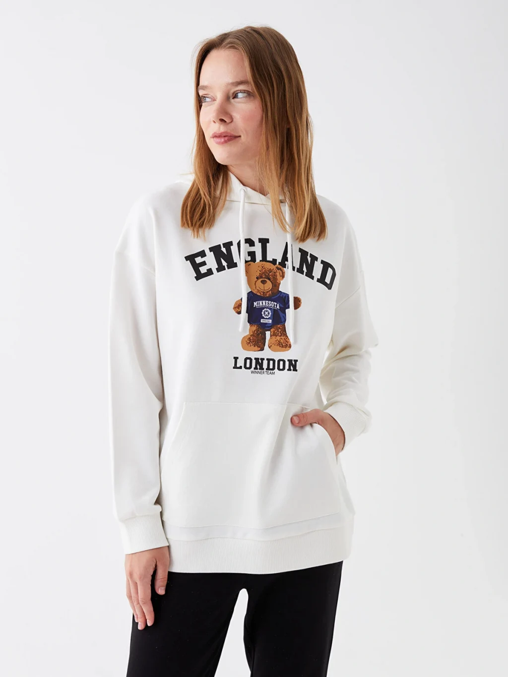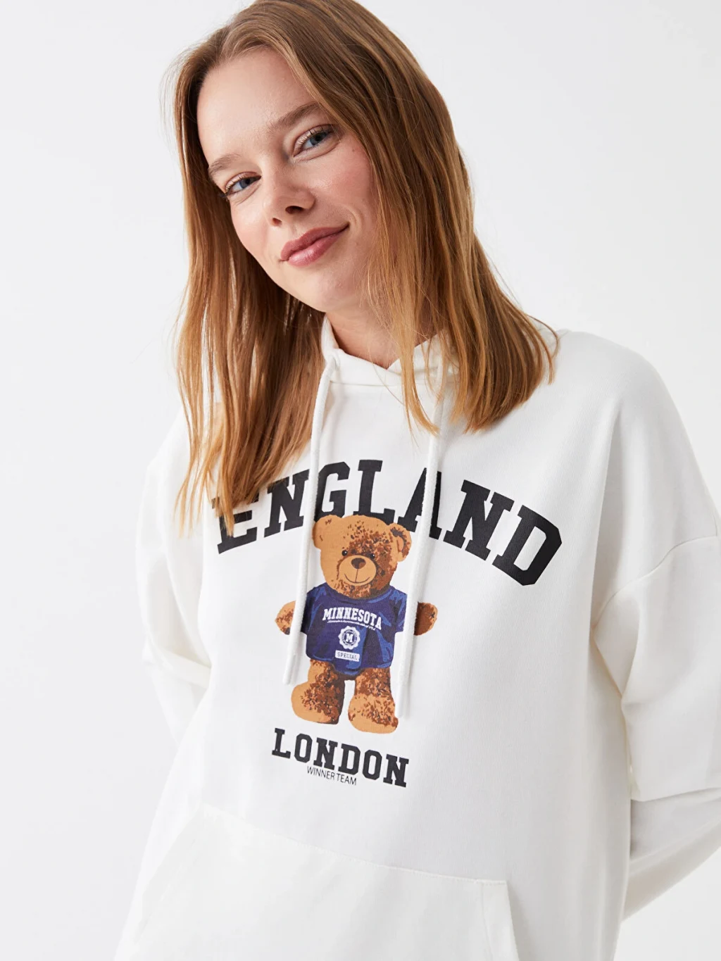 Baskılı uzun kollu kadın hoodie, bağcıklı sabit kapüşon detayı ile dikkat çekiyor. 3 iplik kumaşa sahip kapüşonlu sweatshirt, hem yumuşaklık hem de dayanıklılık sunarak, sıcak ve konforlu bir kullanım deneyimi sağlar.