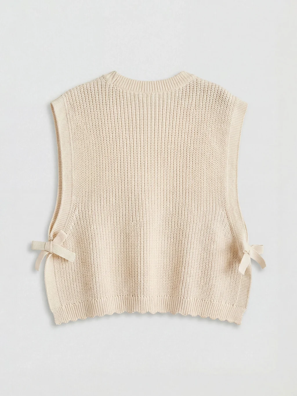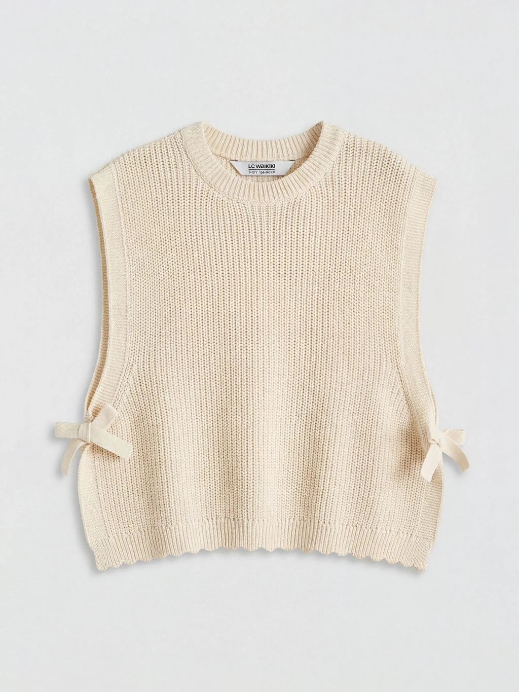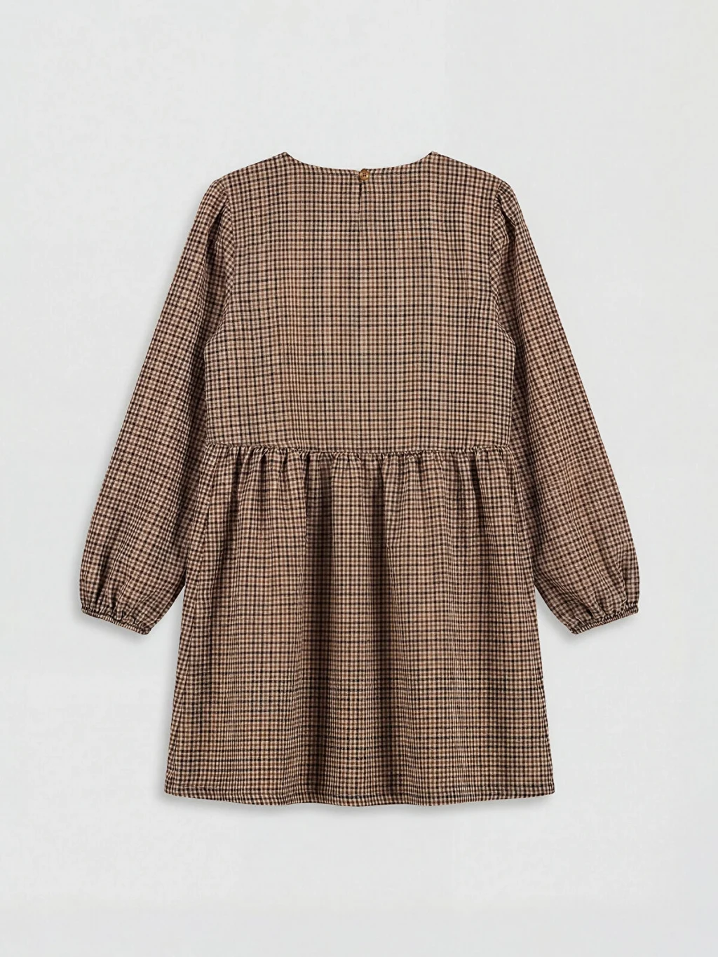 Bisiklet yakalı ve uzun kollu kız çocuk elbise, kareli desenlidir. Üzerinde yanları fiyonk detaylı triko süveter bulunur.