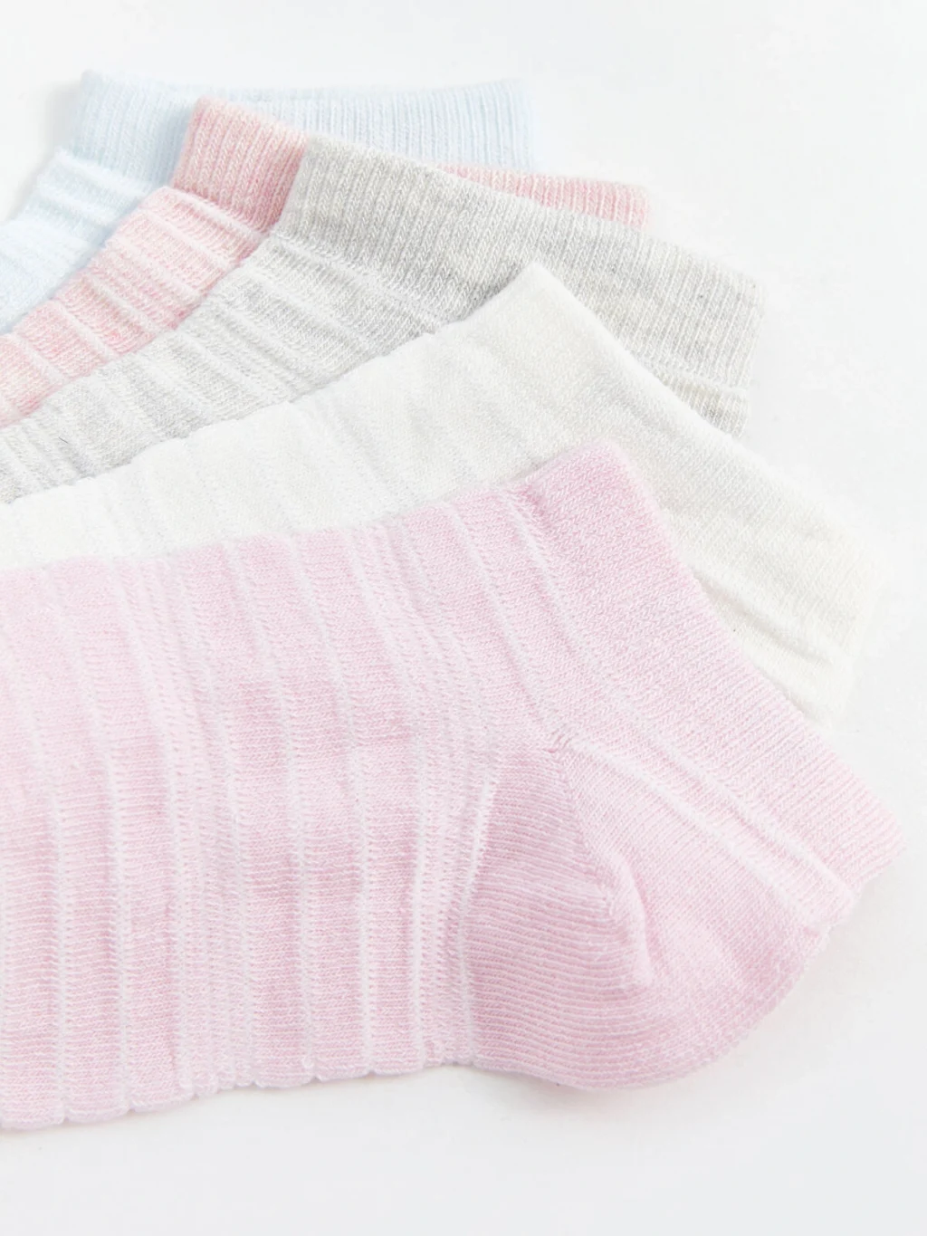Pamuk karışımlı elyaftan üretilen patik çoraplar, yumuşak ve konforlu bir dokuya sahiptir. Çizgili tasarımıyla tarz bir görünüm sunar ve 5 çift patik çoraptan oluşmaktadır.