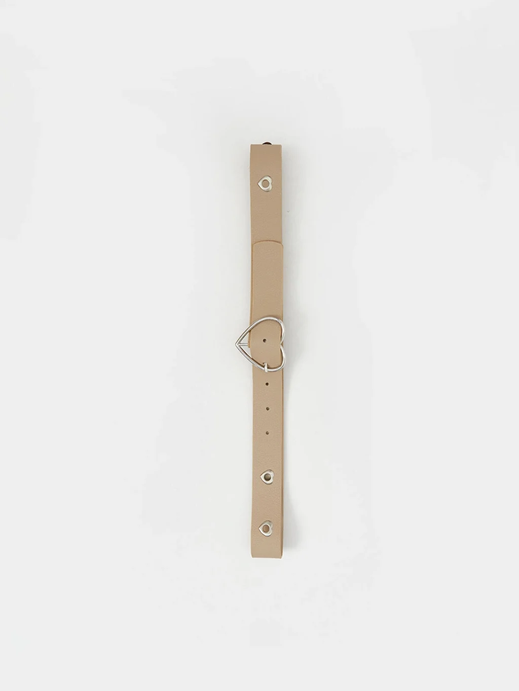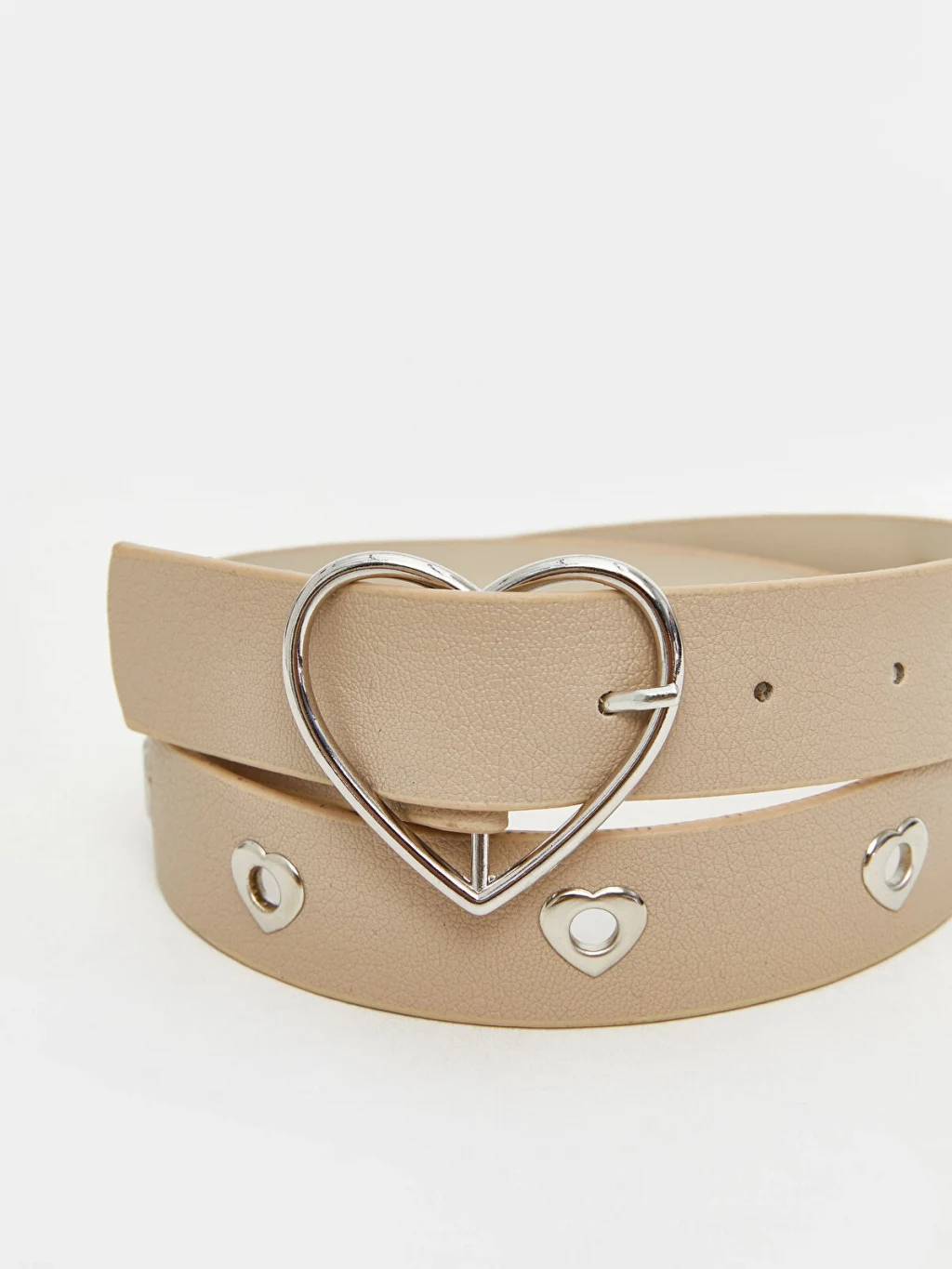 Kız çocuk kemer, kalp şeklinde tokaya ve kalp şeklinde metal kuşgözü detaylarına sahiptir.