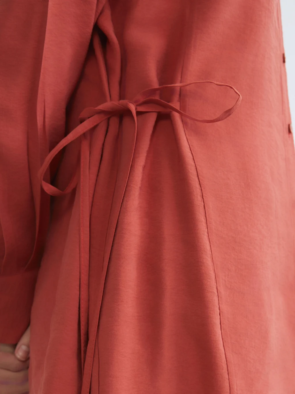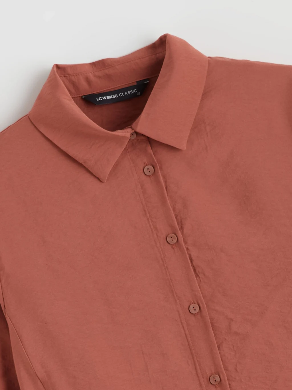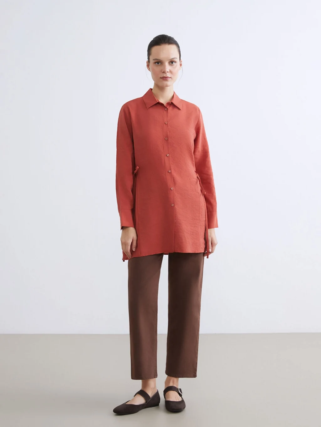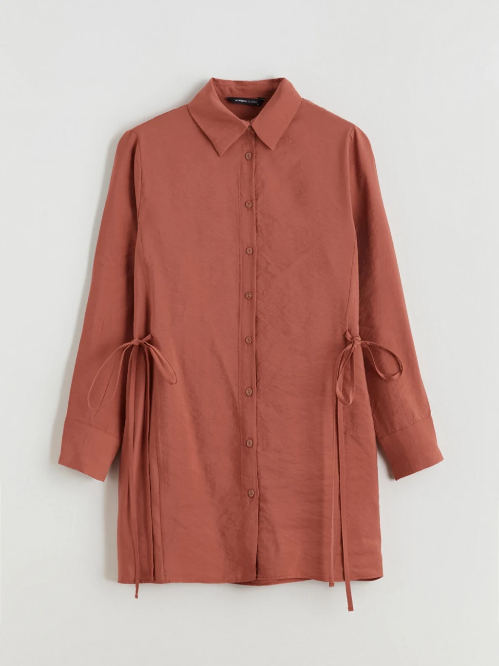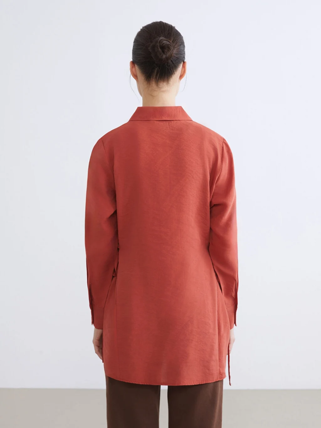 Gömlek yaka, uzun kollu kadın tunik, önden düğme kapamalıdır. Yanları büzgülü ve bağlama detaylıdır.