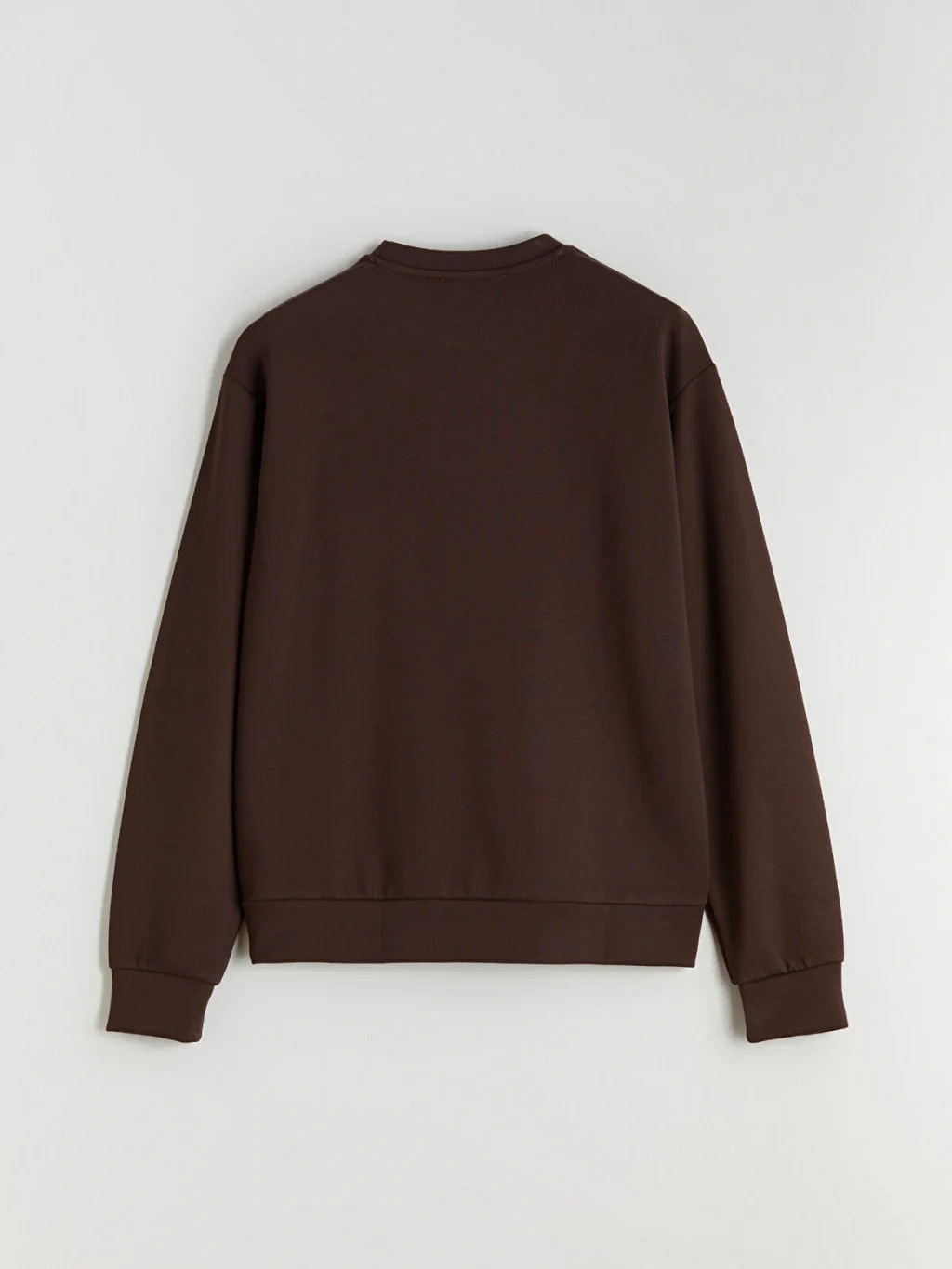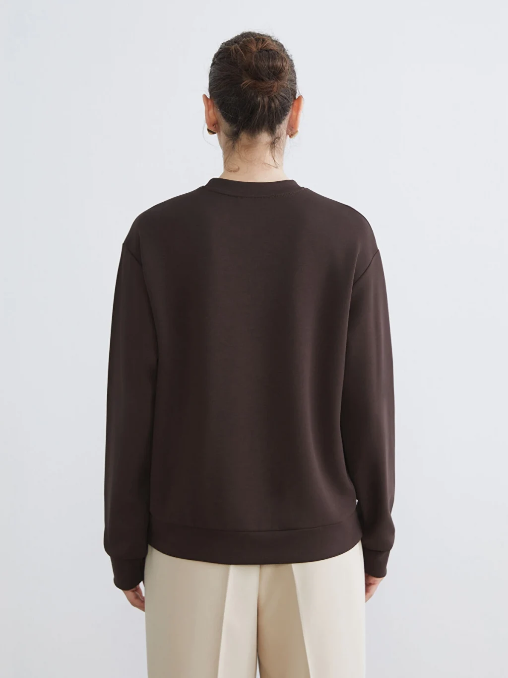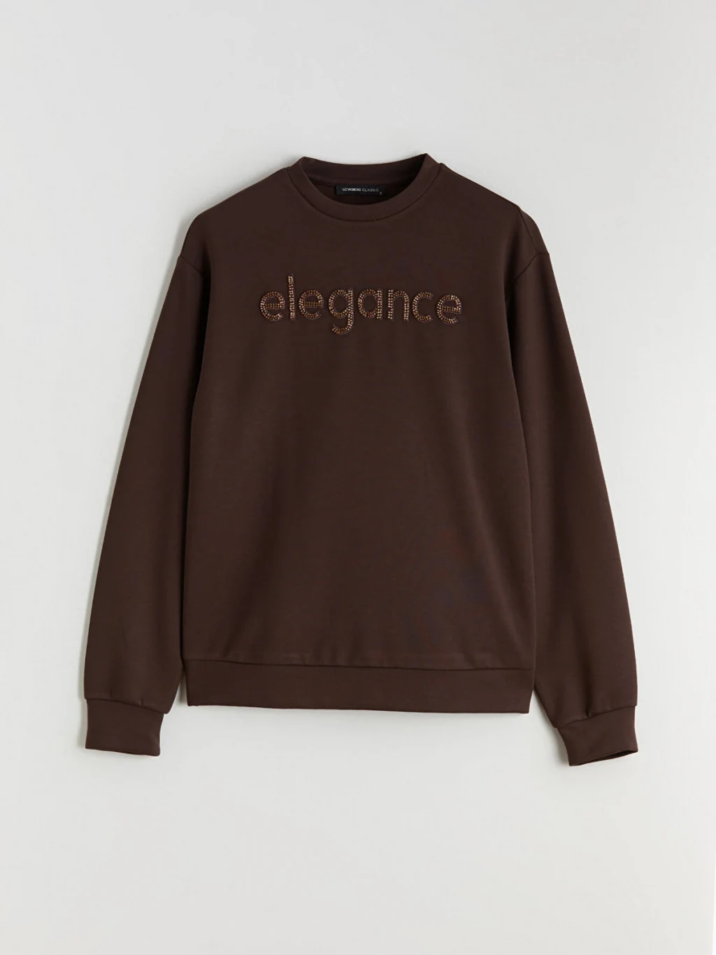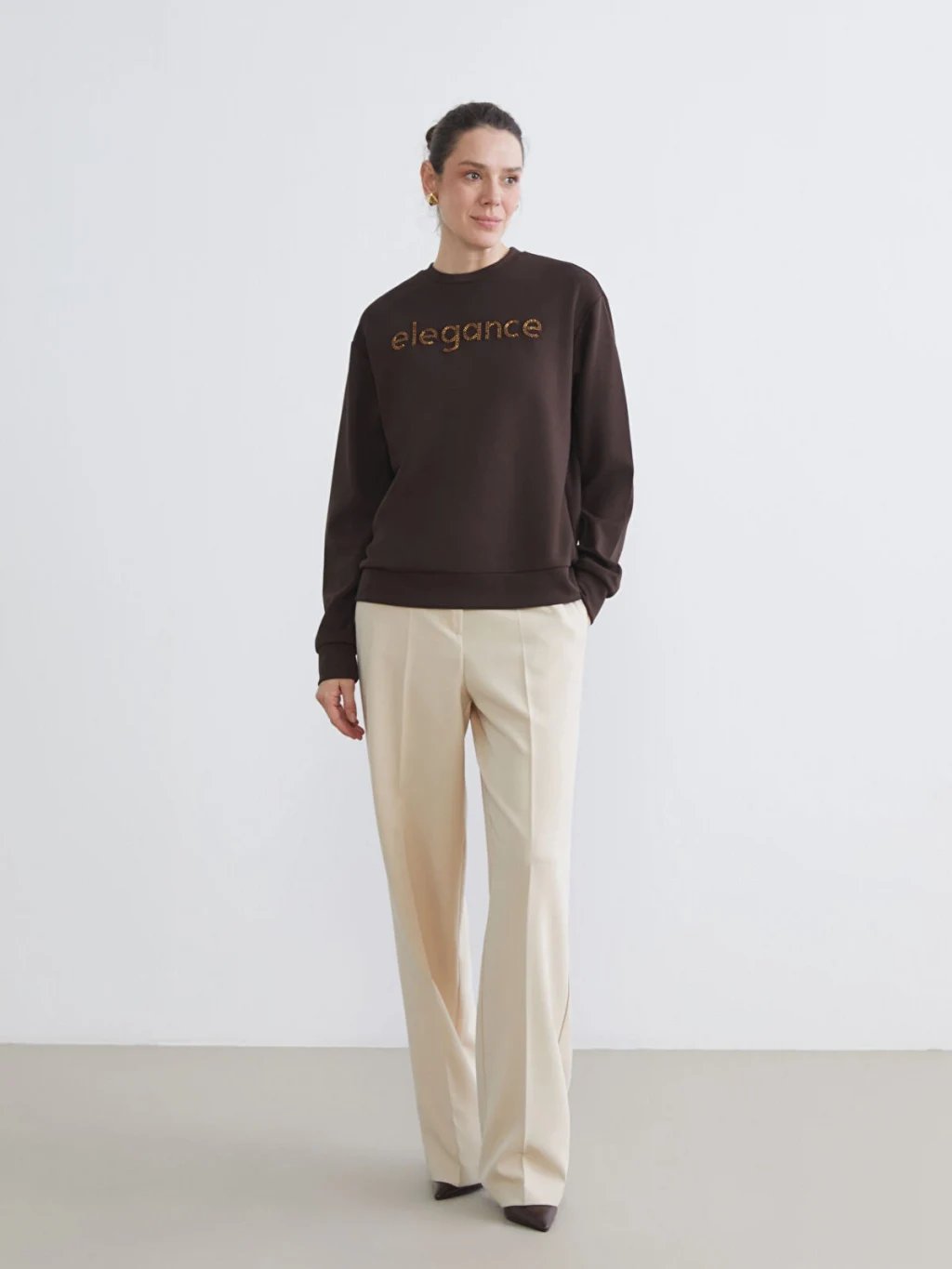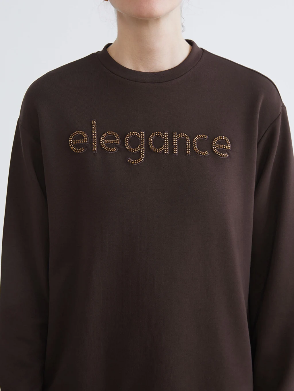 Bisiklet yaka, uzun kollu kadın sweatshirt, dalgıç kumaştan üretilmiştir. Önü taş işlemeli yazı detaylıdır, kol uçları ve etek ucu ribanalıdır.