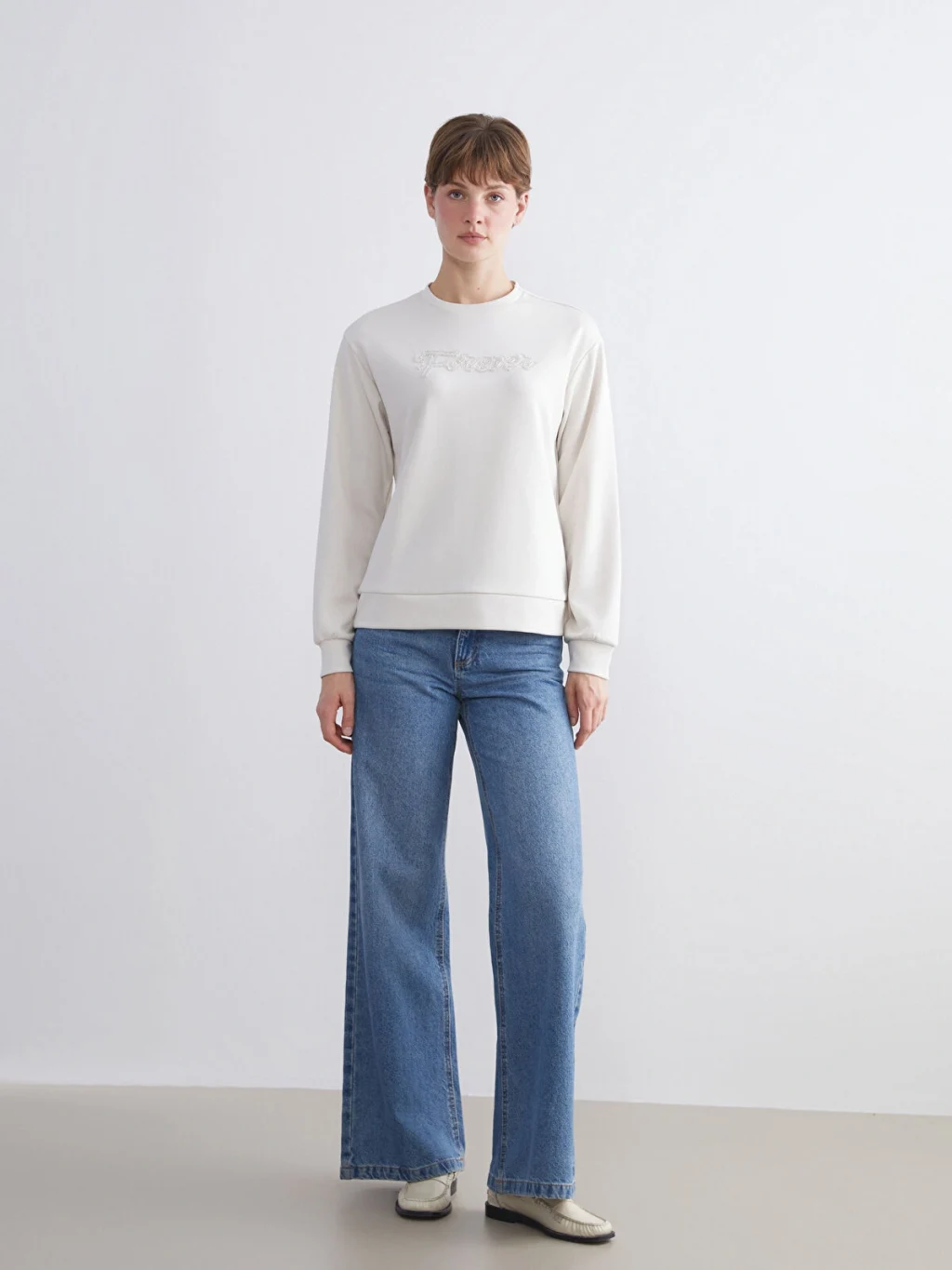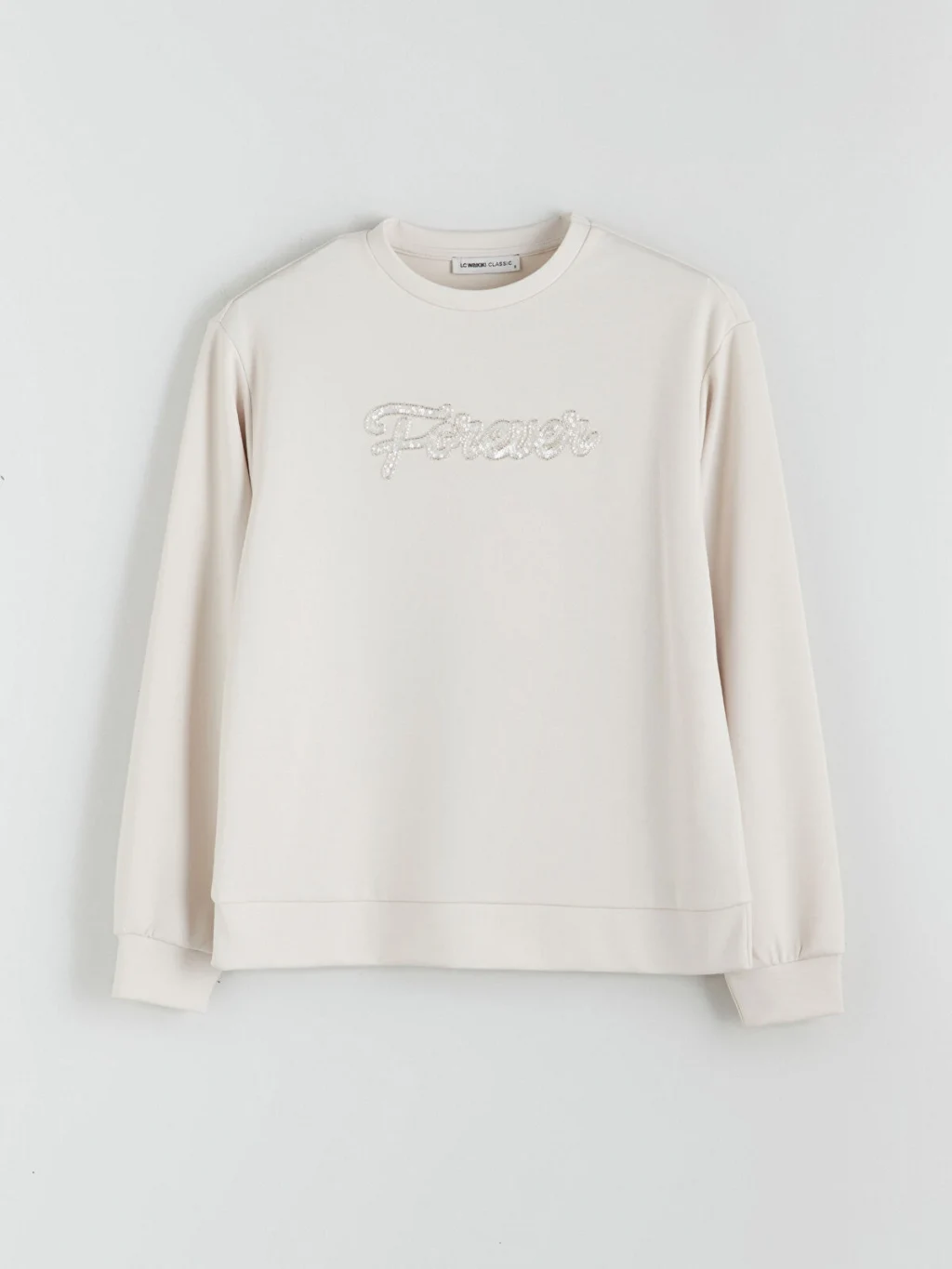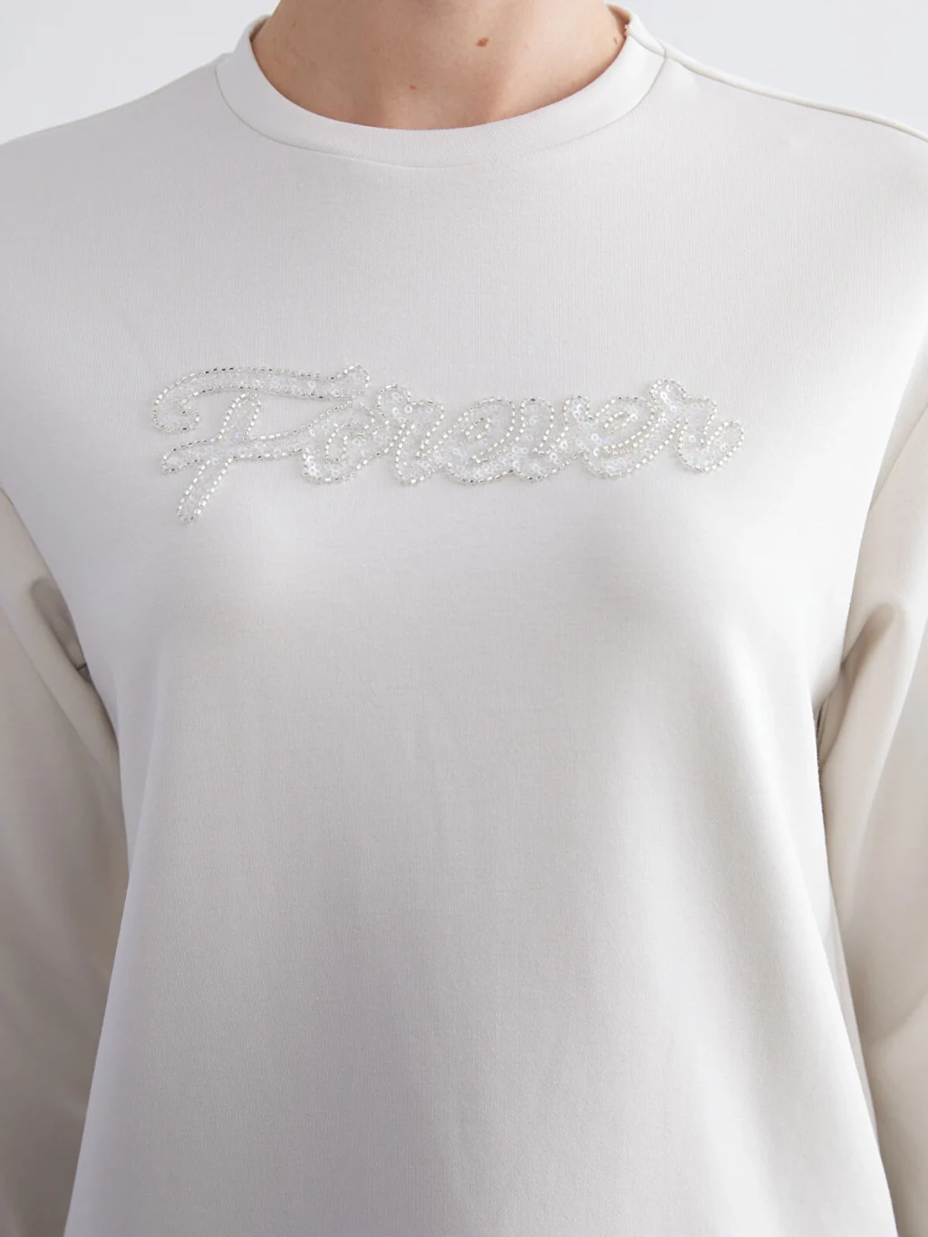 Bisiklet yaka ve uzun kollu kadın sweatshirt, dalgıç kumaştan üretilmiştir. Önü taş işlemeli yazı detaylı olup, kol ve etek ucu ribanalıdır.