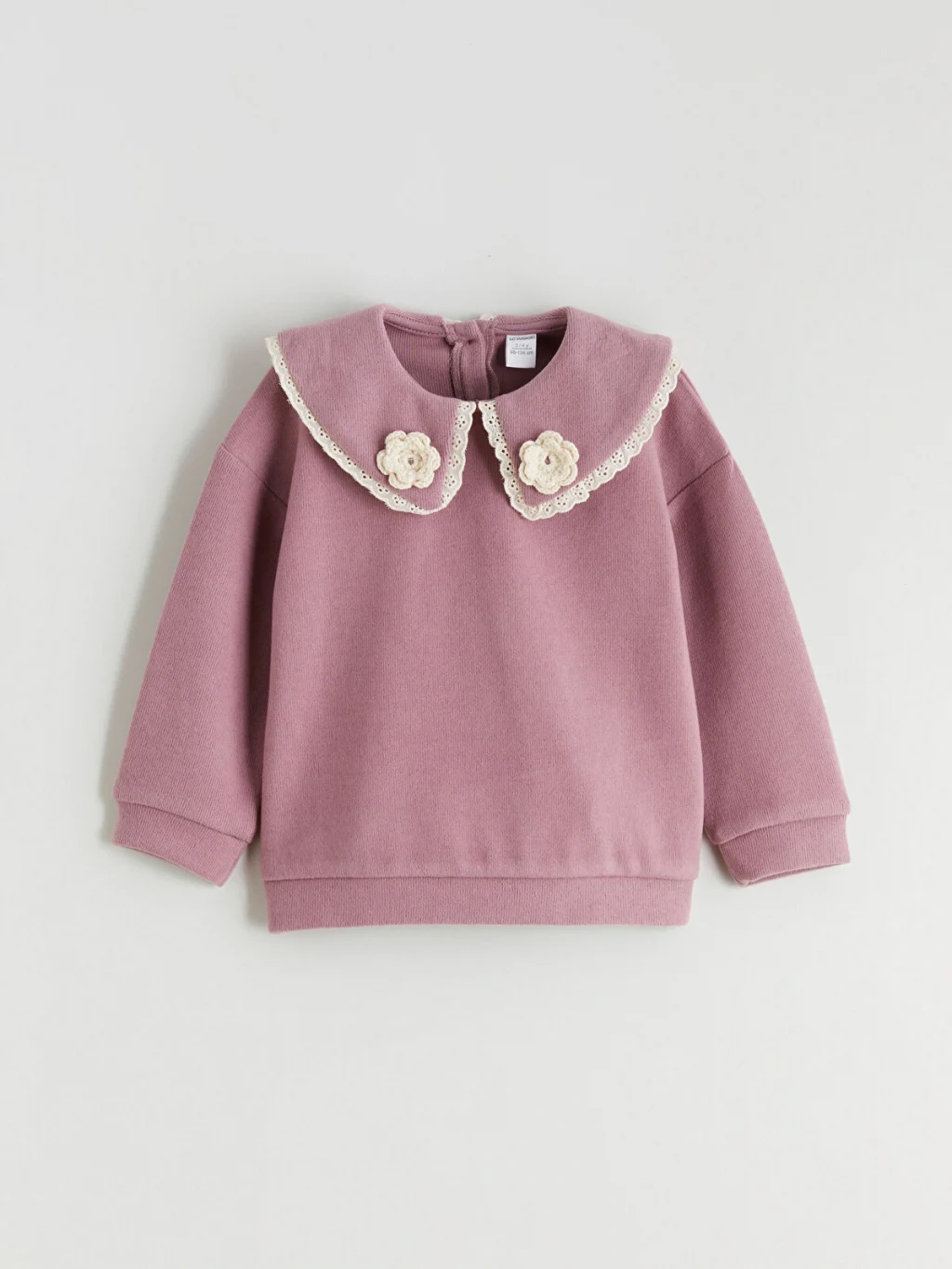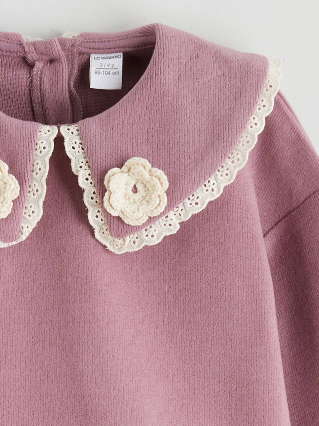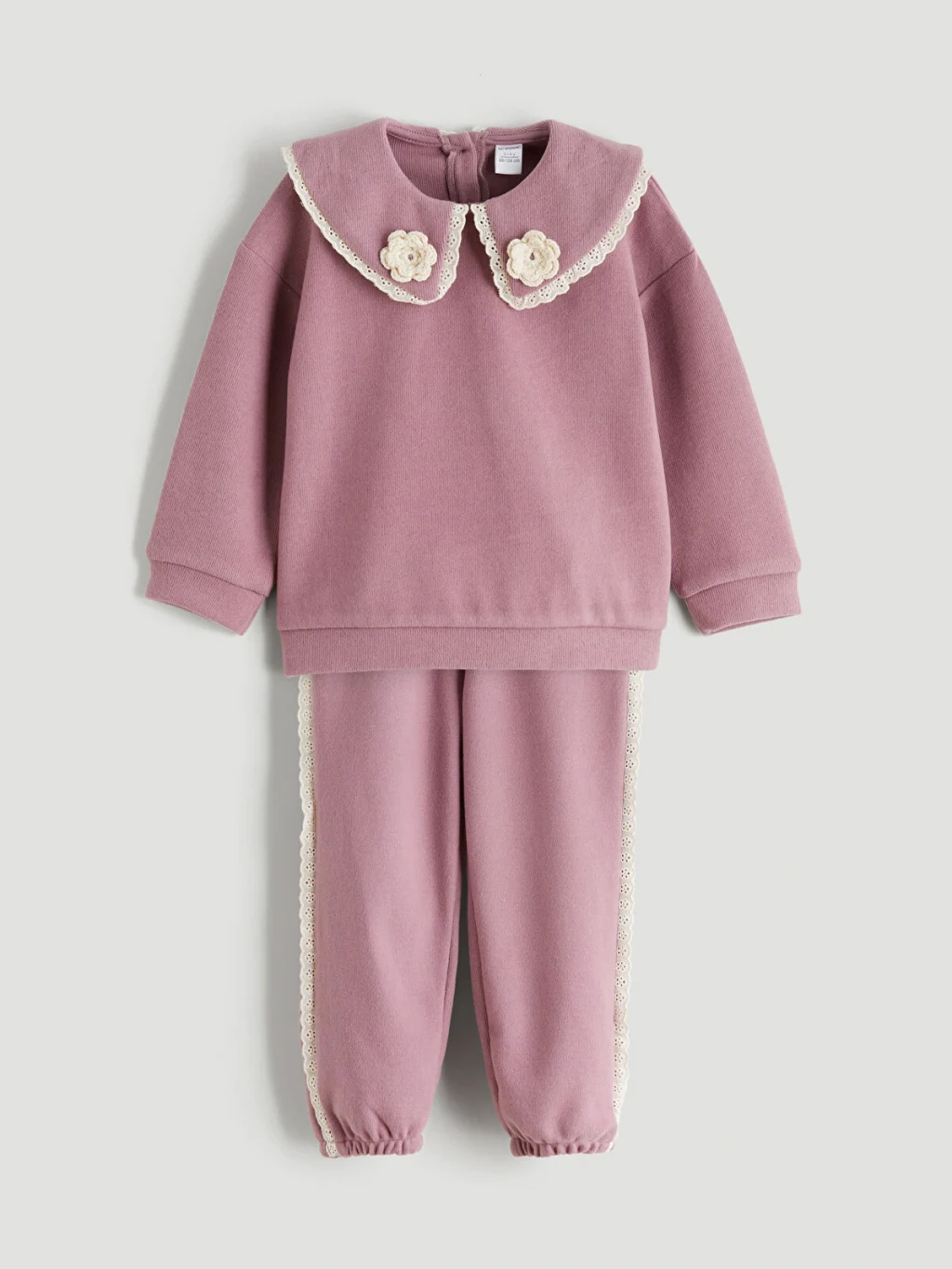Kız çocuk takım, dantel detaylı ve çiçek aplikeli bebe yakalı sweatshirt ile yanları dantel şeritli, paçaları lastikli eşofman altından oluşur.