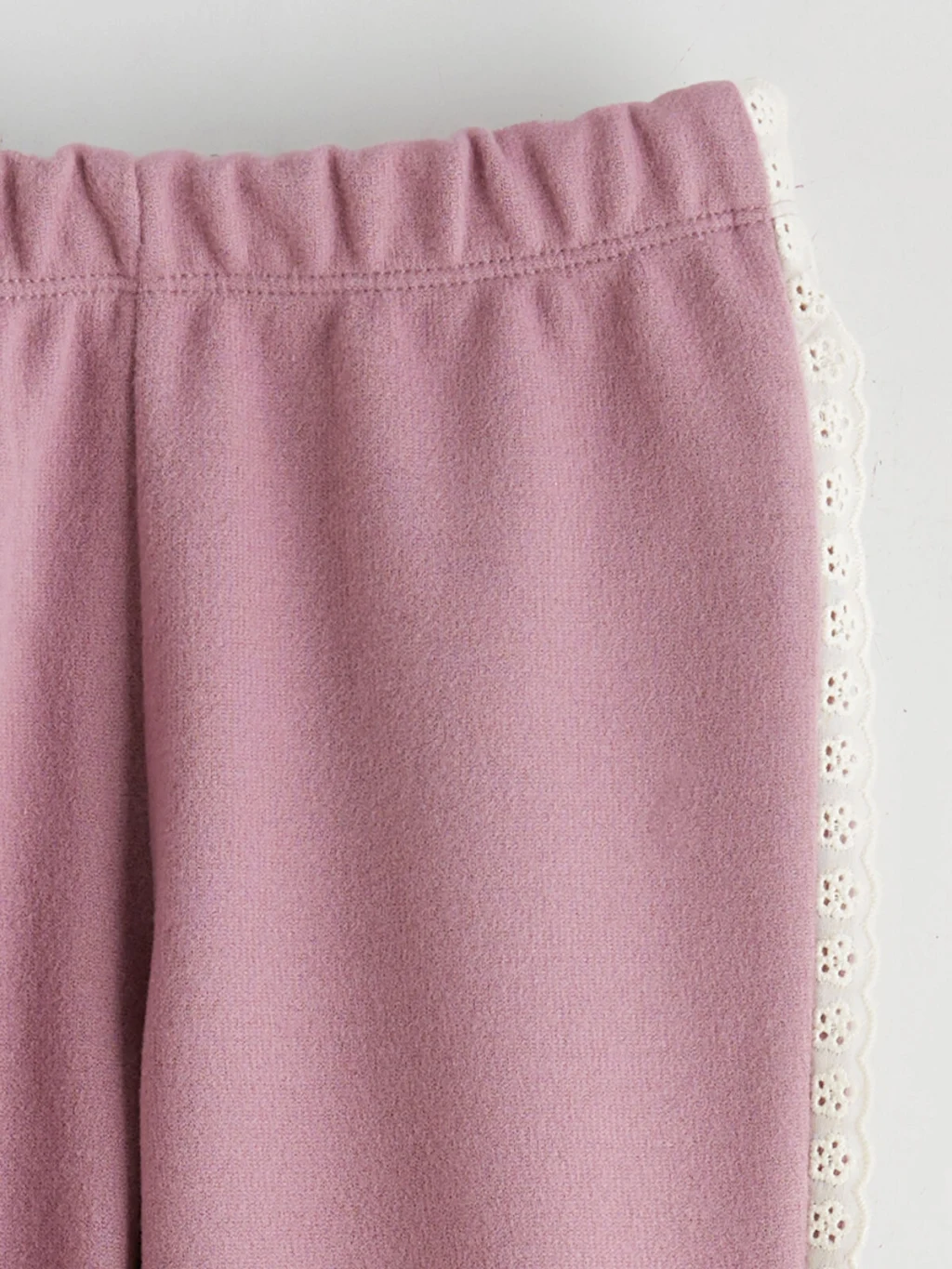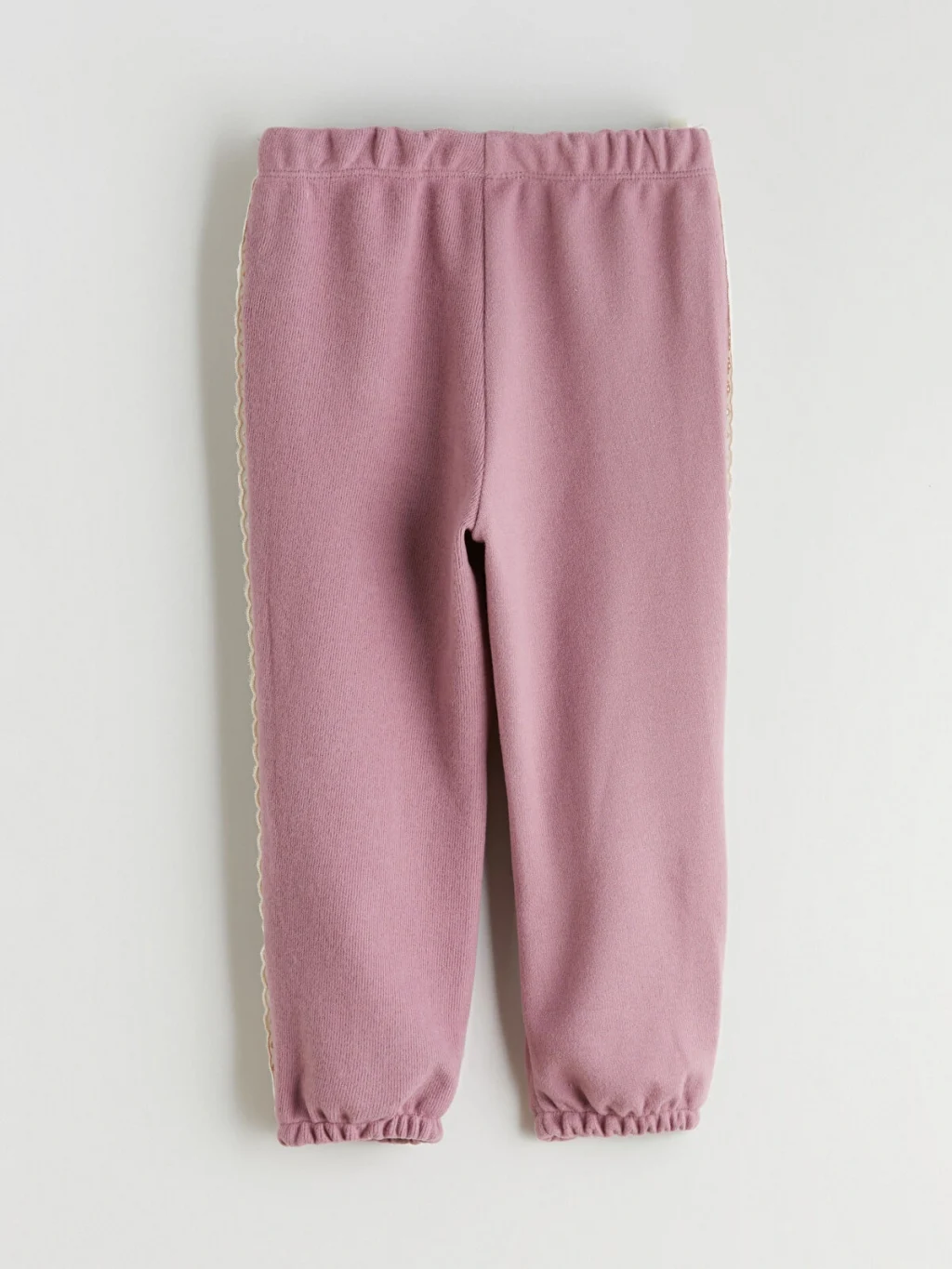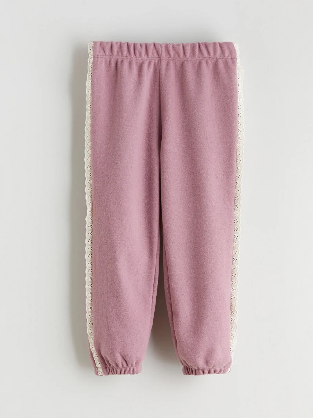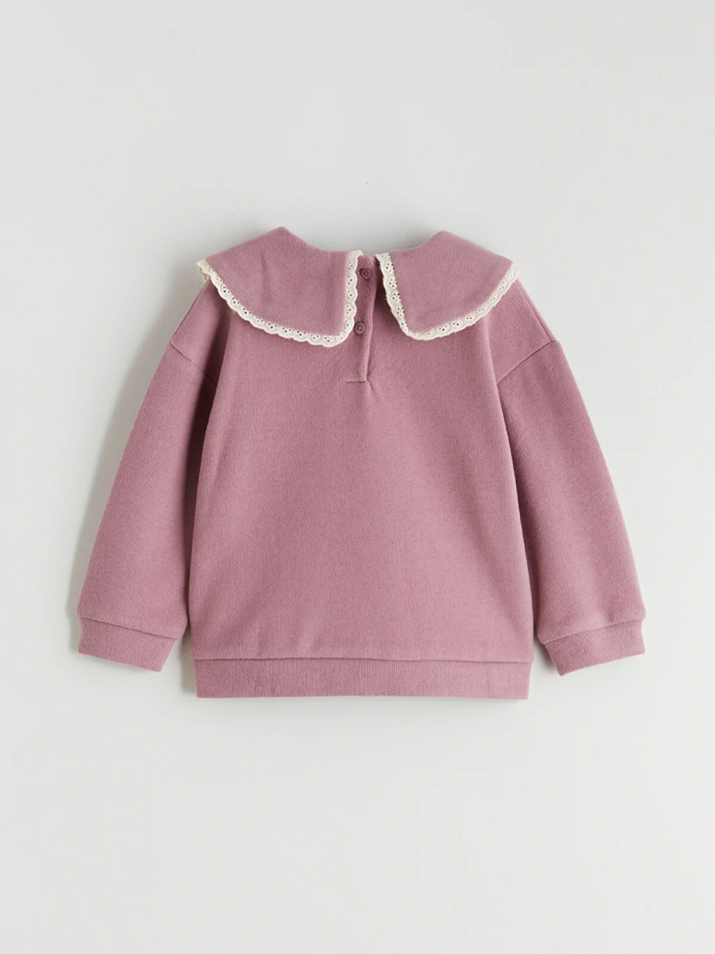 Kız çocuk takım, dantel detaylı ve çiçek aplikeli bebe yakalı sweatshirt ile yanları dantel şeritli, paçaları lastikli eşofman altından oluşur.