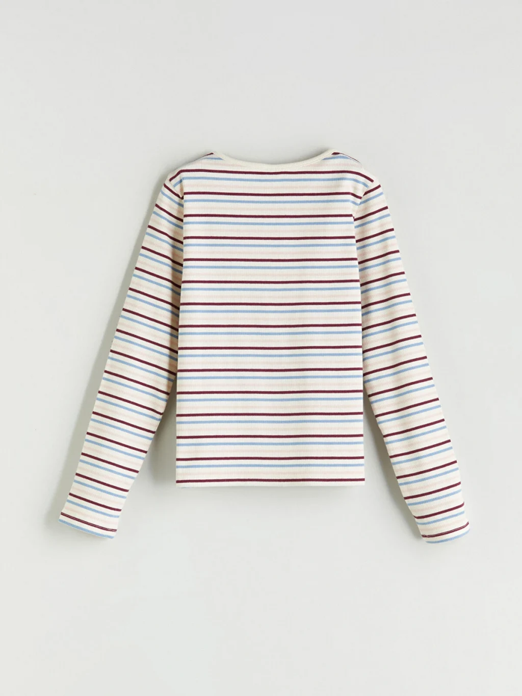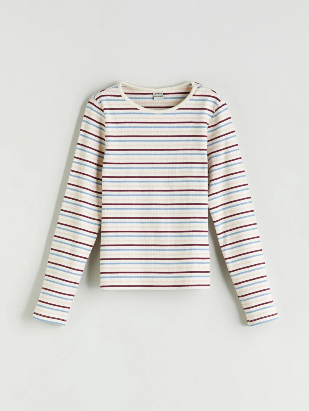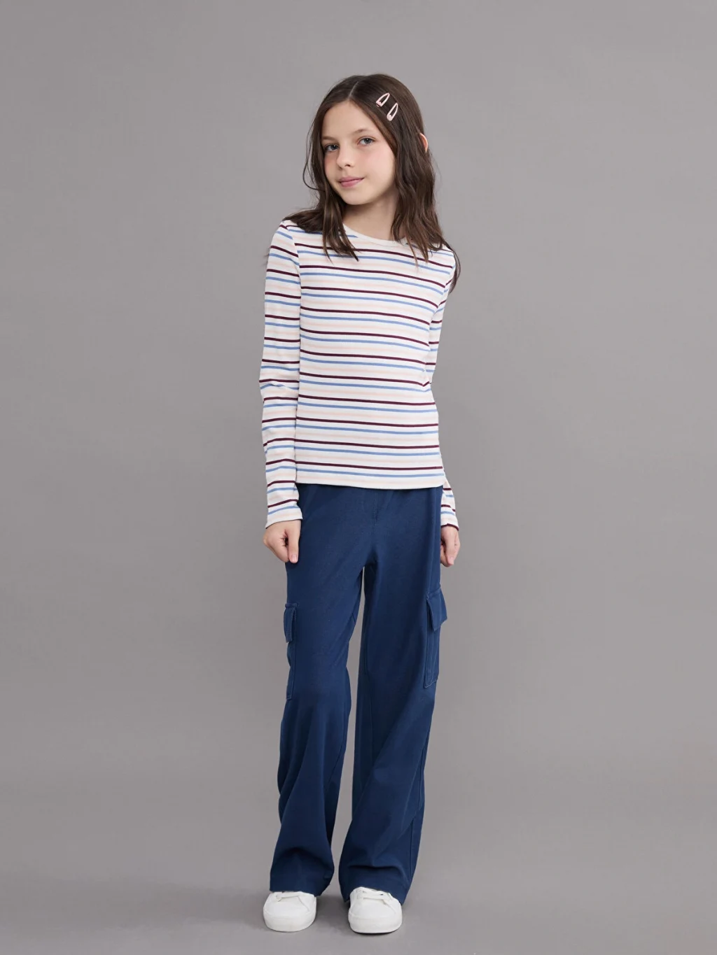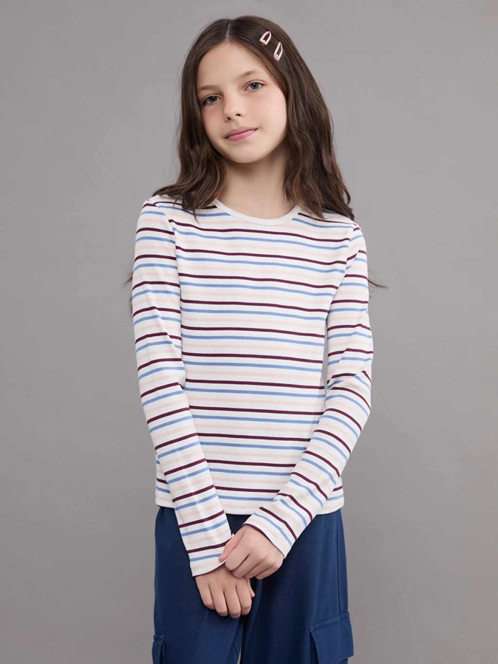 Bisiklet yaka çizgili tişört, kaşkorse kumaştan üretilmiştir. Uzun kolludur.