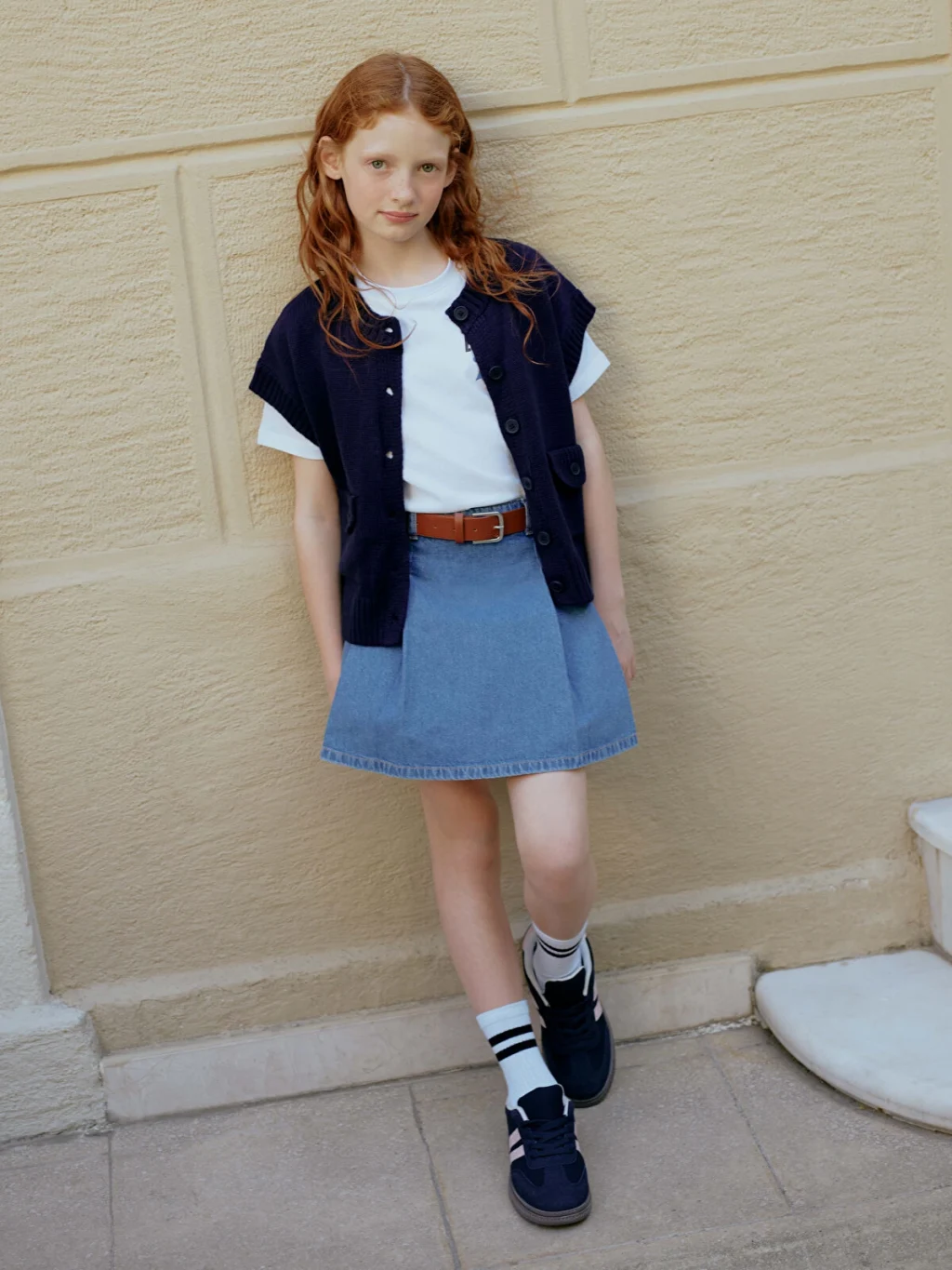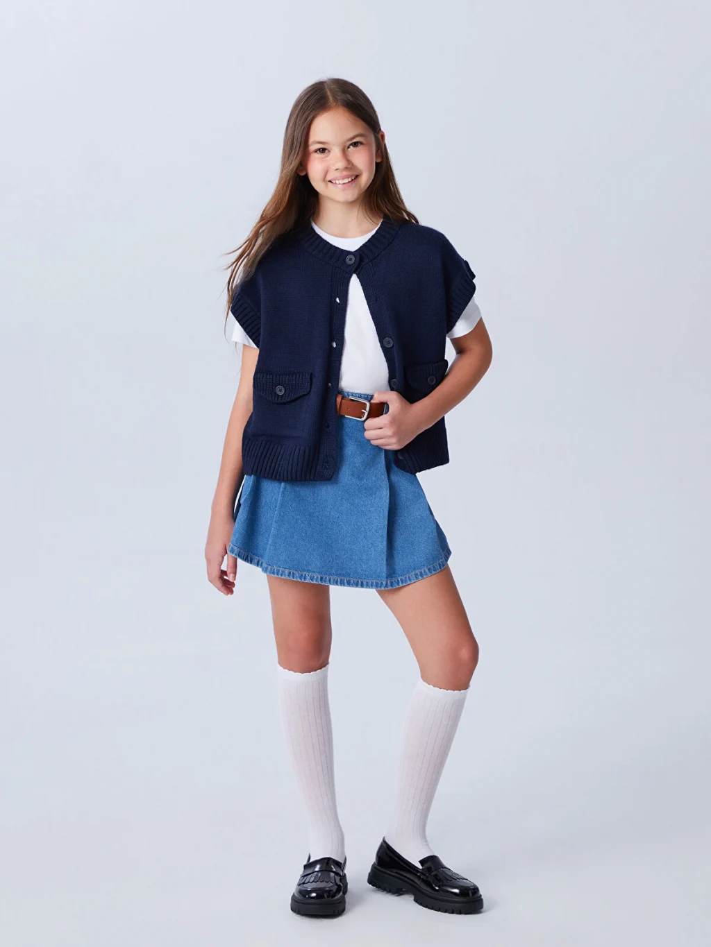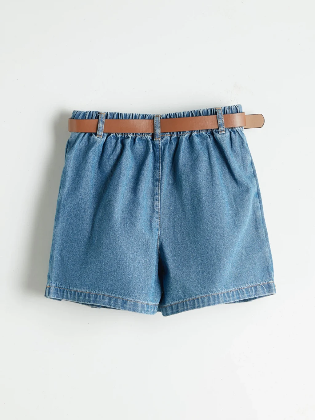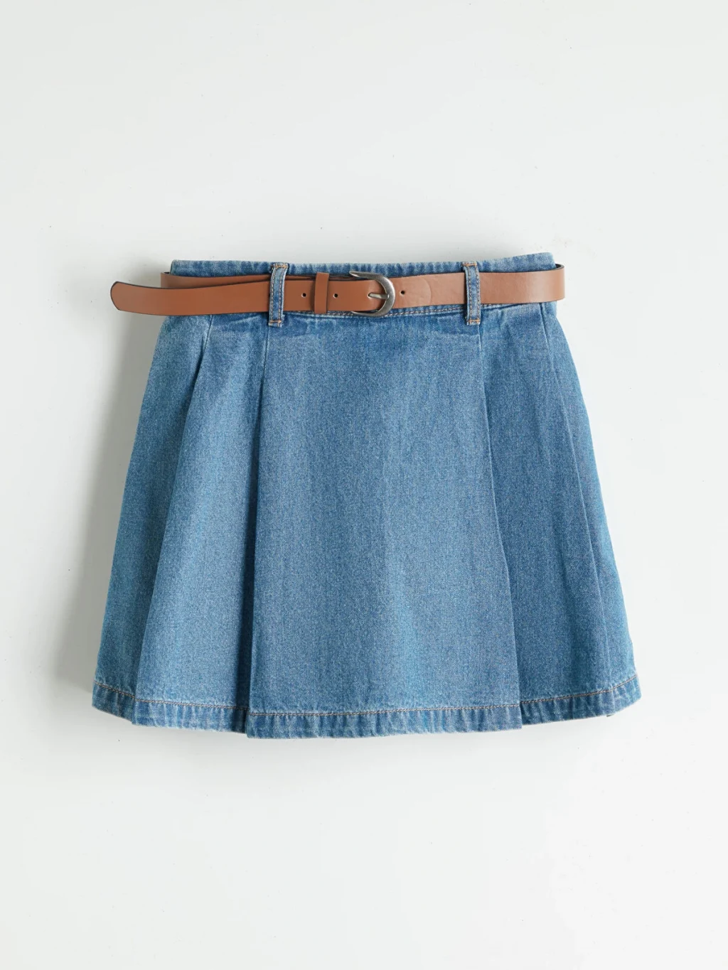 Kız çocuk şort etek, denim kumaştan üretilmiştir. Pileli tasarıma sahiptir.