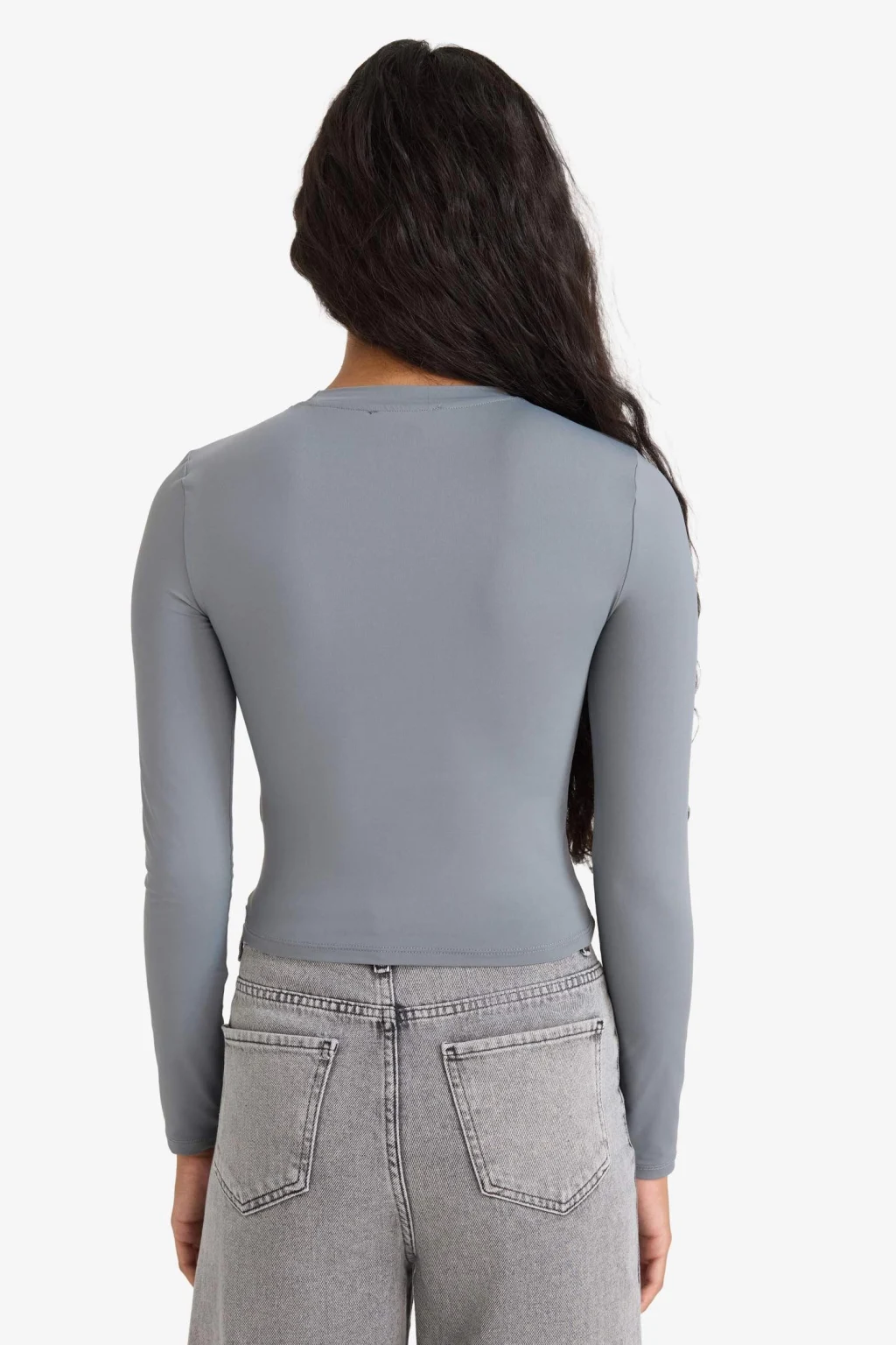 Fitted Bisiklet Yaka Uzun Kollu Tişört, vücuda oturan kesimiyle modern ve şık bir görünüm sunar. Bisiklet yakası ve yumuşak kumaşıyla günlük rahatlığınızı artırır.