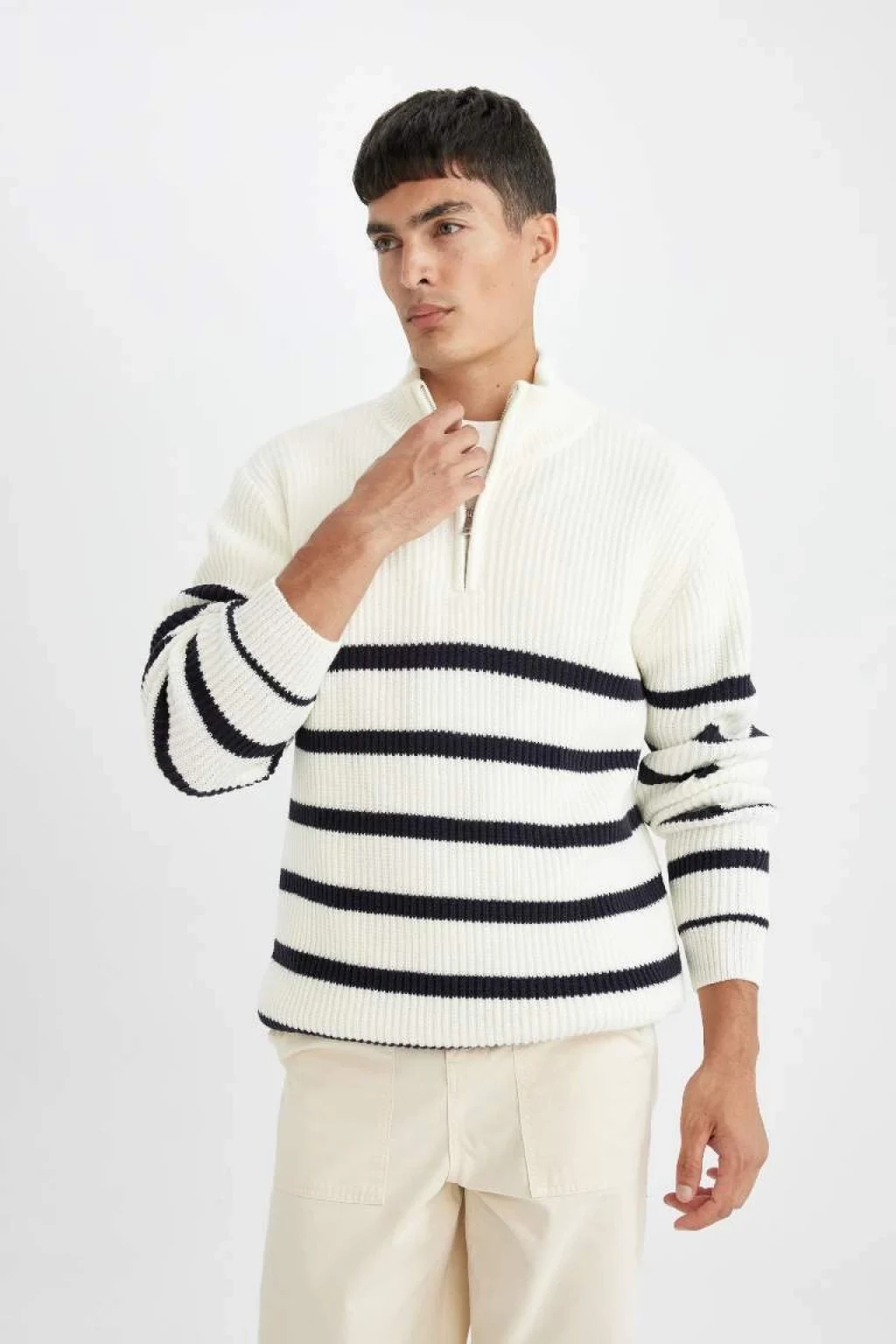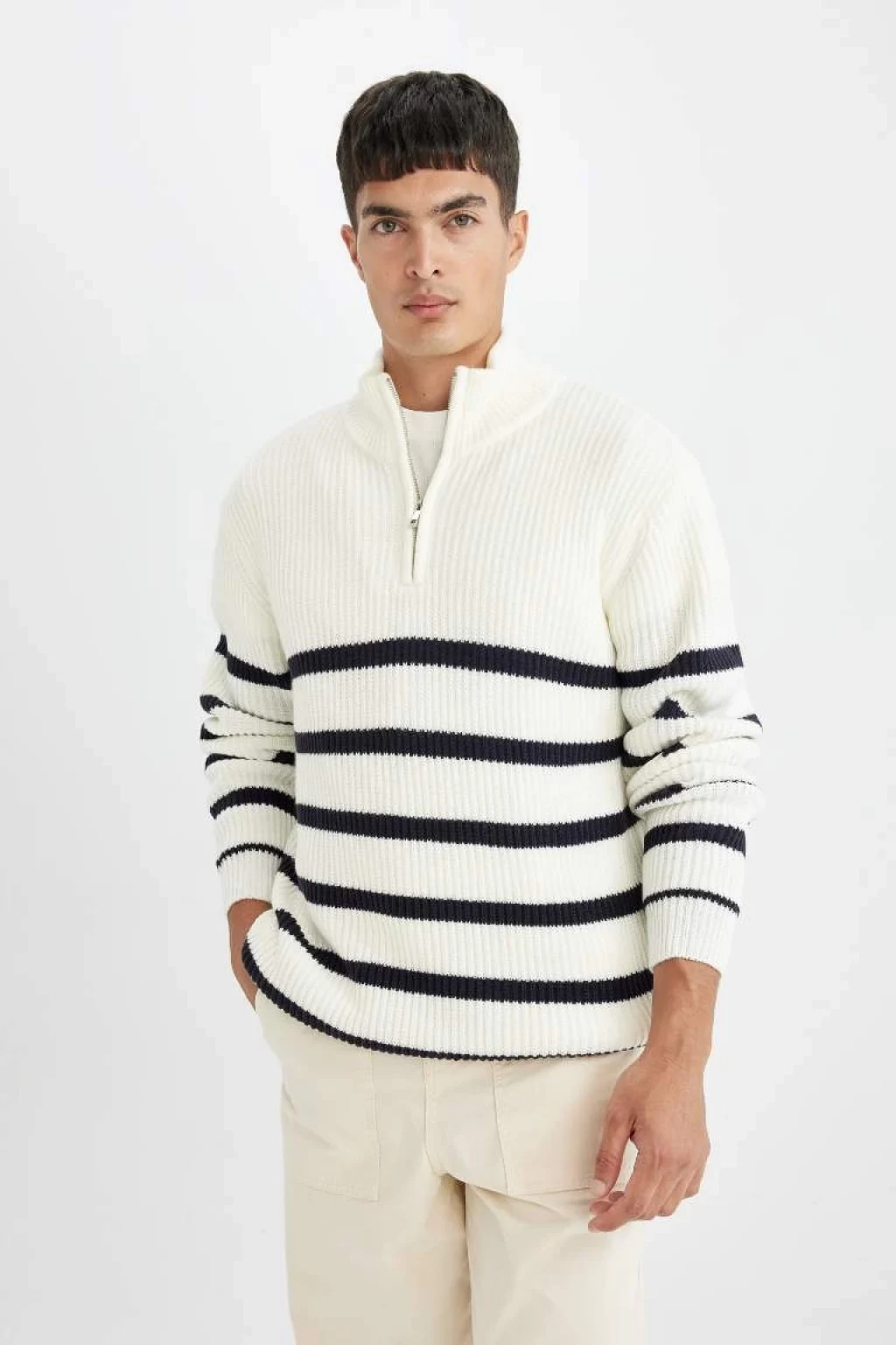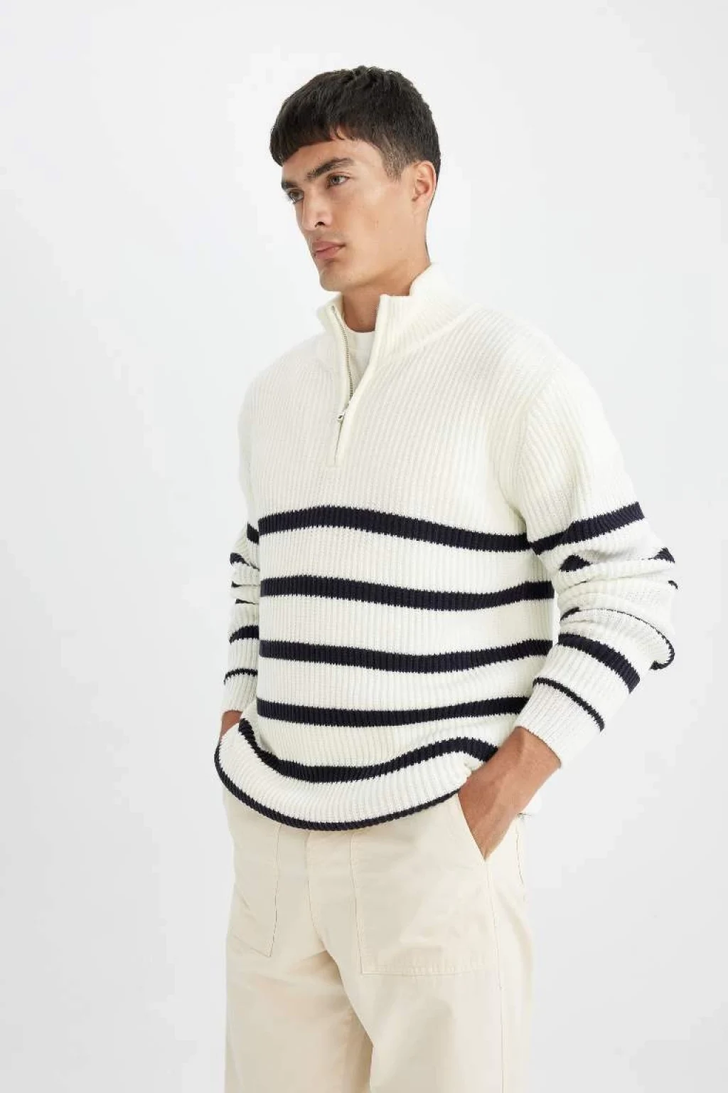 Şık ve konforlu Standart Fit Dik Yaka Yarım Fermuarlı Çizgili Triko Kazak ile tarzınızı tamamlayın. Yüksek kaliteli malzemelerle üretilmiş olan bu kazak, şıklığı ve rahatlığı bir arada sunuyor. Gardırobunuzun vazgeçilmezi olmaya aday!