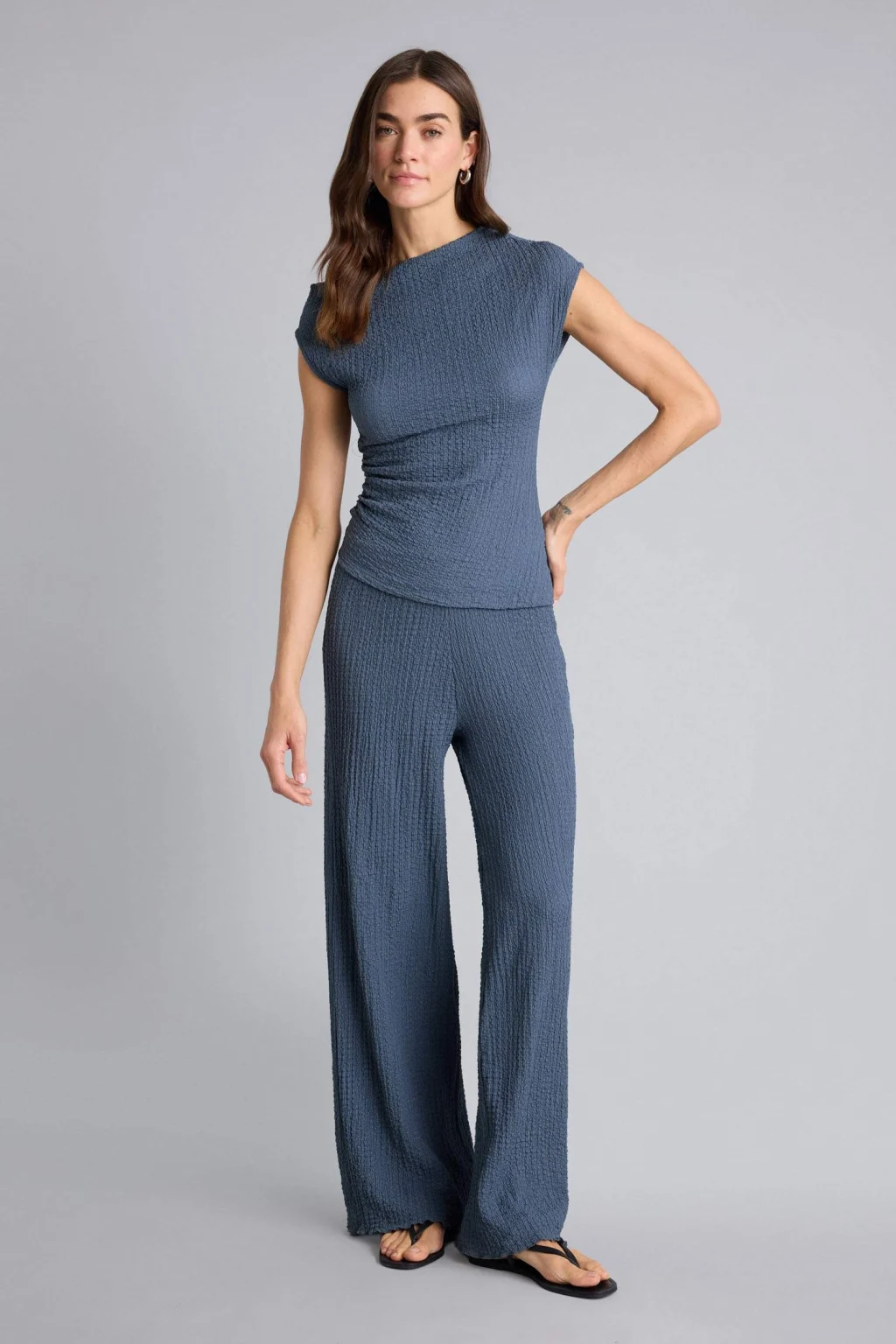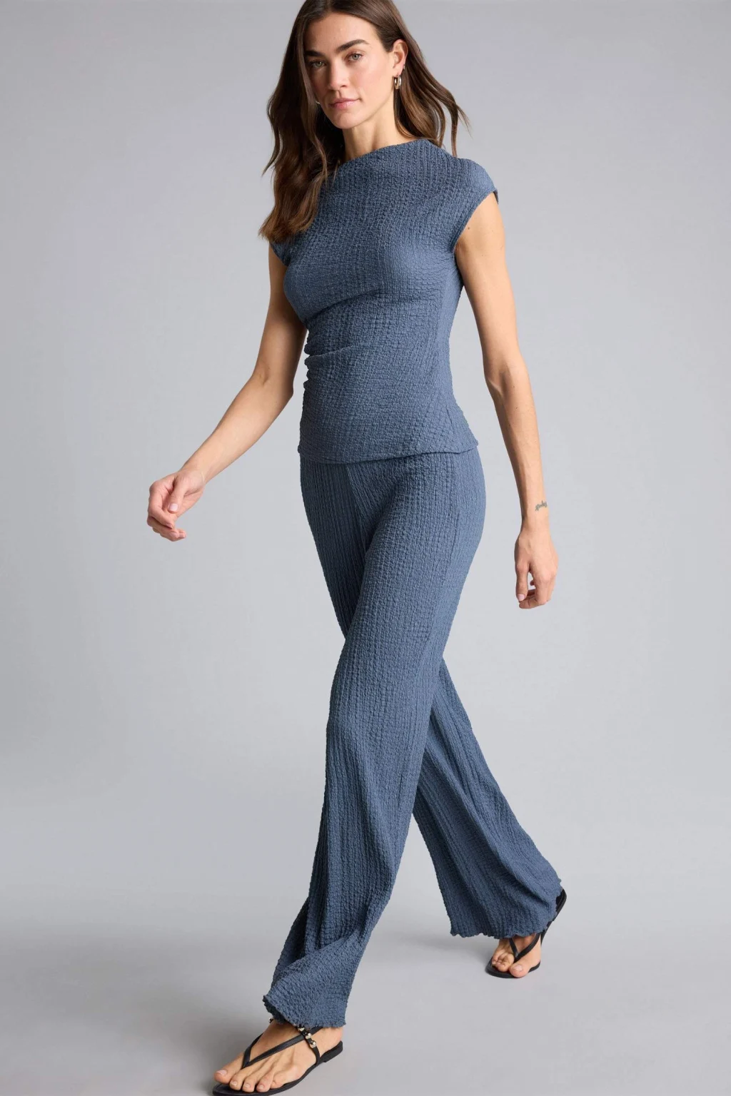 Yetişkin kadınlar için özel olarak tasarlanmış örme alt temel çeşit pantolon. İndigo rengi ve bürümcük kumaşıyla şık ve rahat bir seçenek. İlkbahar/Yaz mevsim koşullarına uygun olan geniş paça kesimiyle modern bir tarz sunuyor. Günlük kullanıma uygun olan bu pantolonla tarzınızı tamamlayın.
