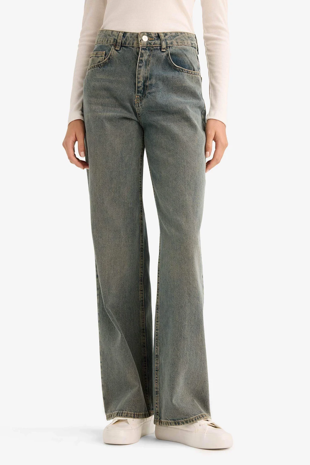 Yetişkin kadınlar için yüksek bel kot pantolon. Sürdürülebilir jean kumaştan üretilmiştir. Mavi renkte ve düz geniş kalıptadır. Uzun boy ve sonbahar/kış mevsim koşullarına uygun. Sade ve temel çeşit koleksiyonuna aittir. Yıkamalı özelliktedir.