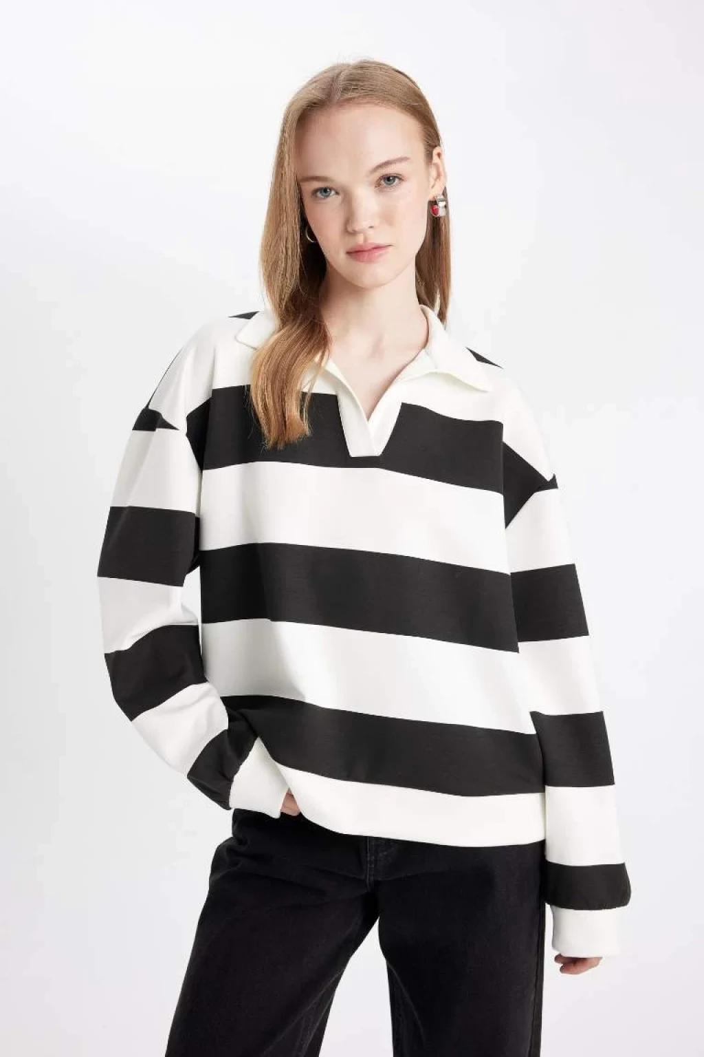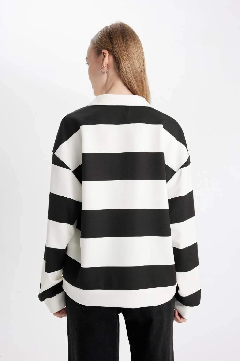 Geniş kesimli Polo Yaka Çizgili Kalın Kumaş Sweatshirt, rahat ve şık bir seçenektir. Oversize tasarımıyla öne çıkar ve kaliteli kumaşıyla uzun ömürlü kullanım sunar. Gardırobunuzun vazgeçilmezi olmaya aday bu sweatshirt, her tarza kolayca uyum sağlar. Şıklığı ve konforu bir arada arayanlar için ideal bir tercihtir.