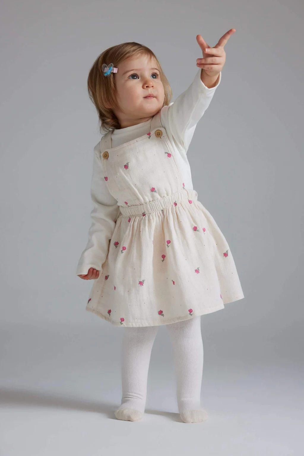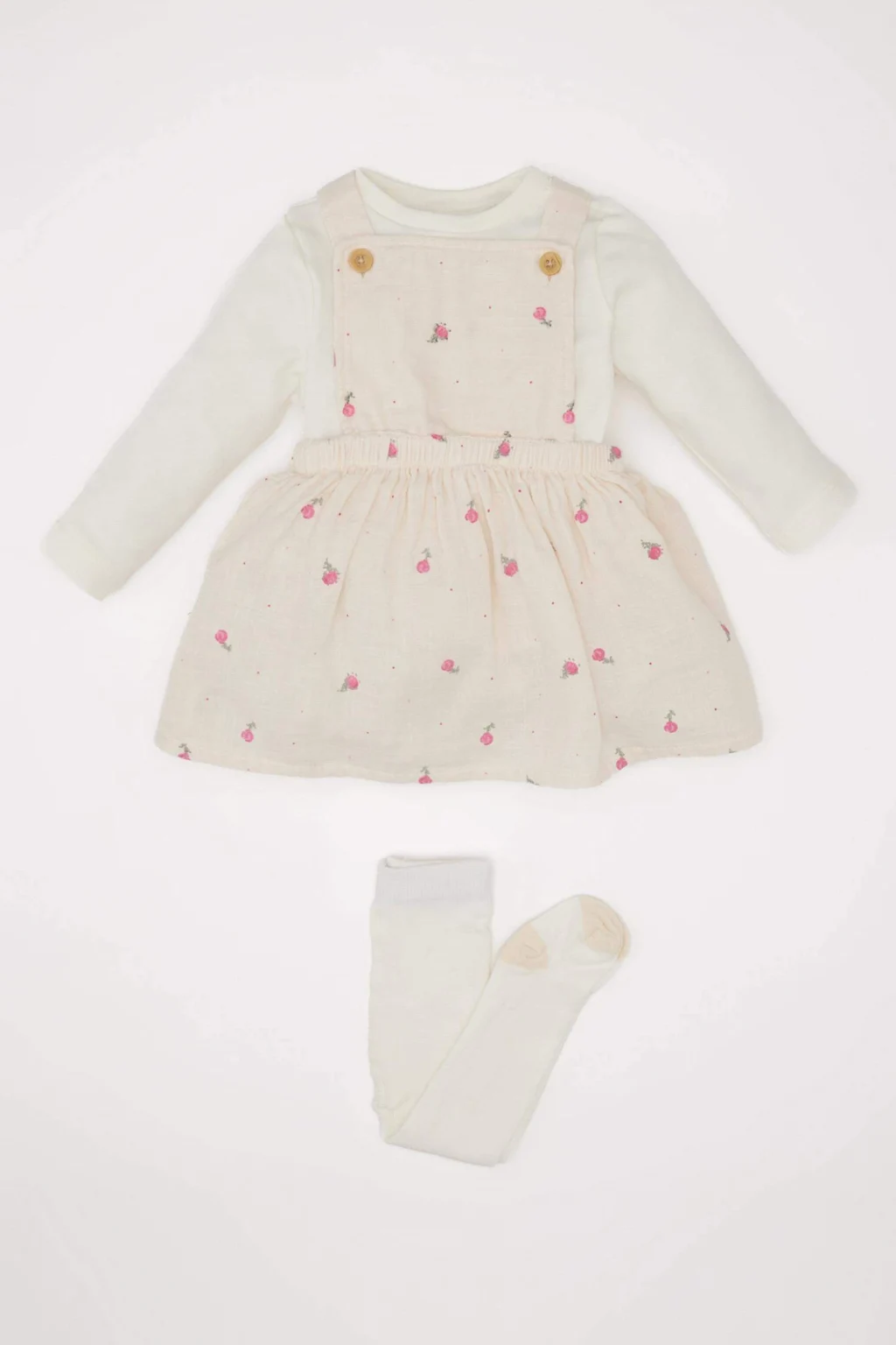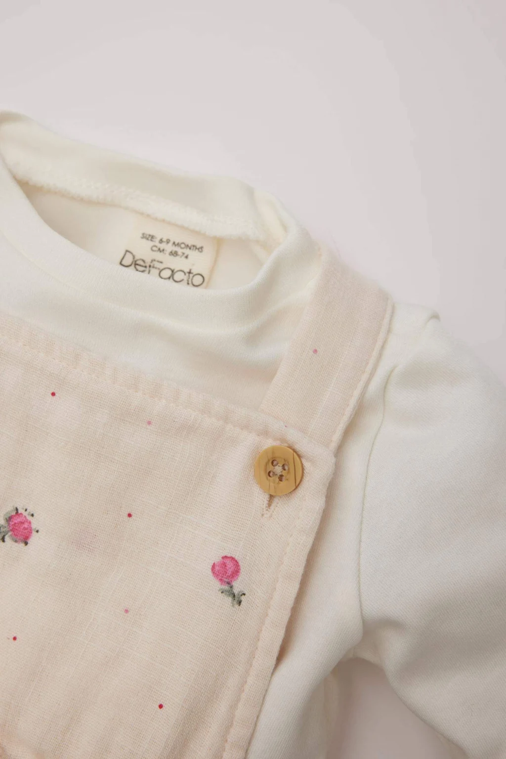 Kız bebekler için zarif bir seçenek olan bu 3'lü takım, müslin çiçekli uzun kollu tişört, salopet elbise ve külotlu çoraptan oluşuyor. Yumuşak ve rahat kumaşı ile bebeğinizin cildine nazikçe dokunur, şık tasarımı ise ona şıklık katarken rahat hareket etmesini sağlar.
