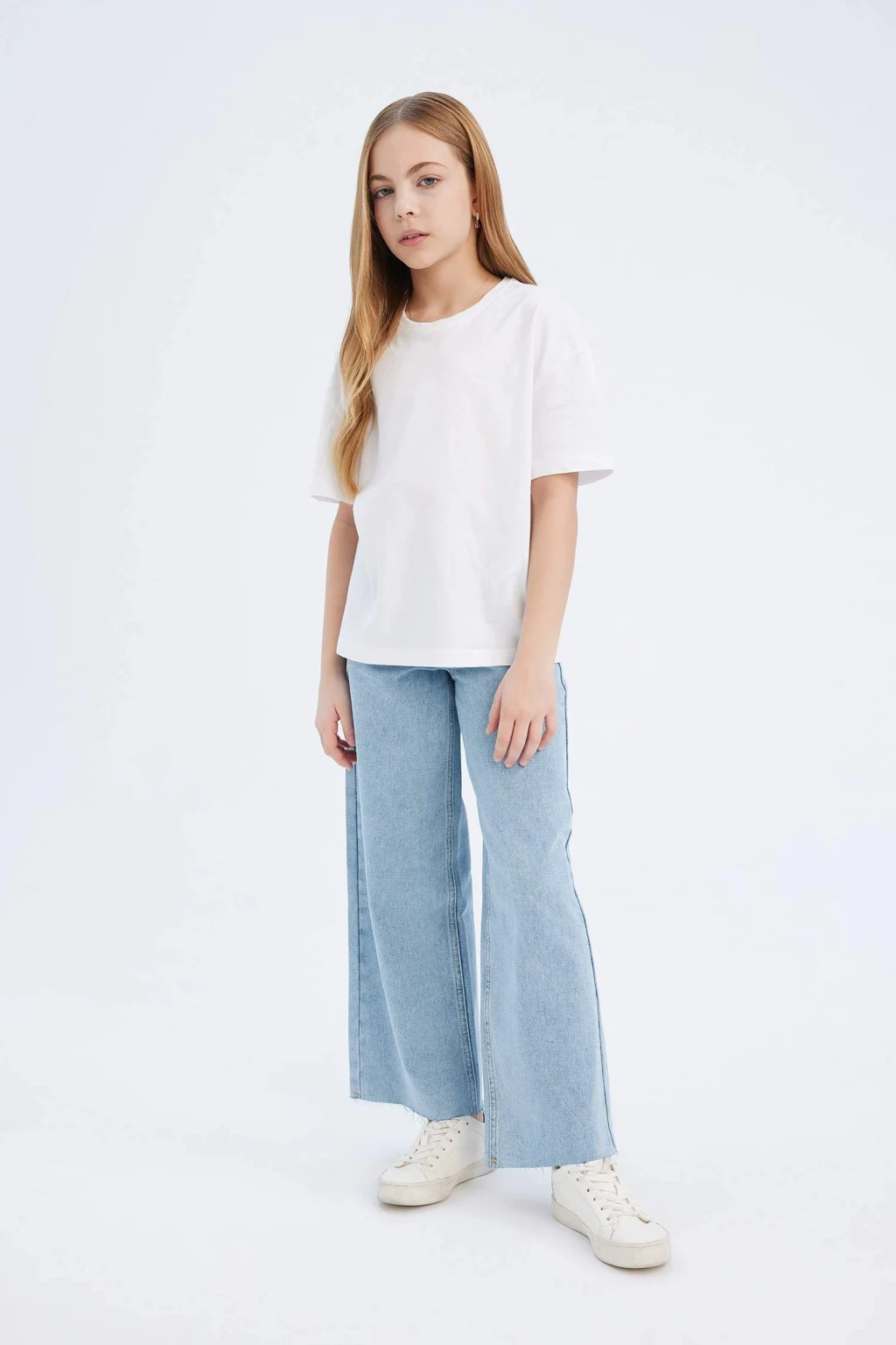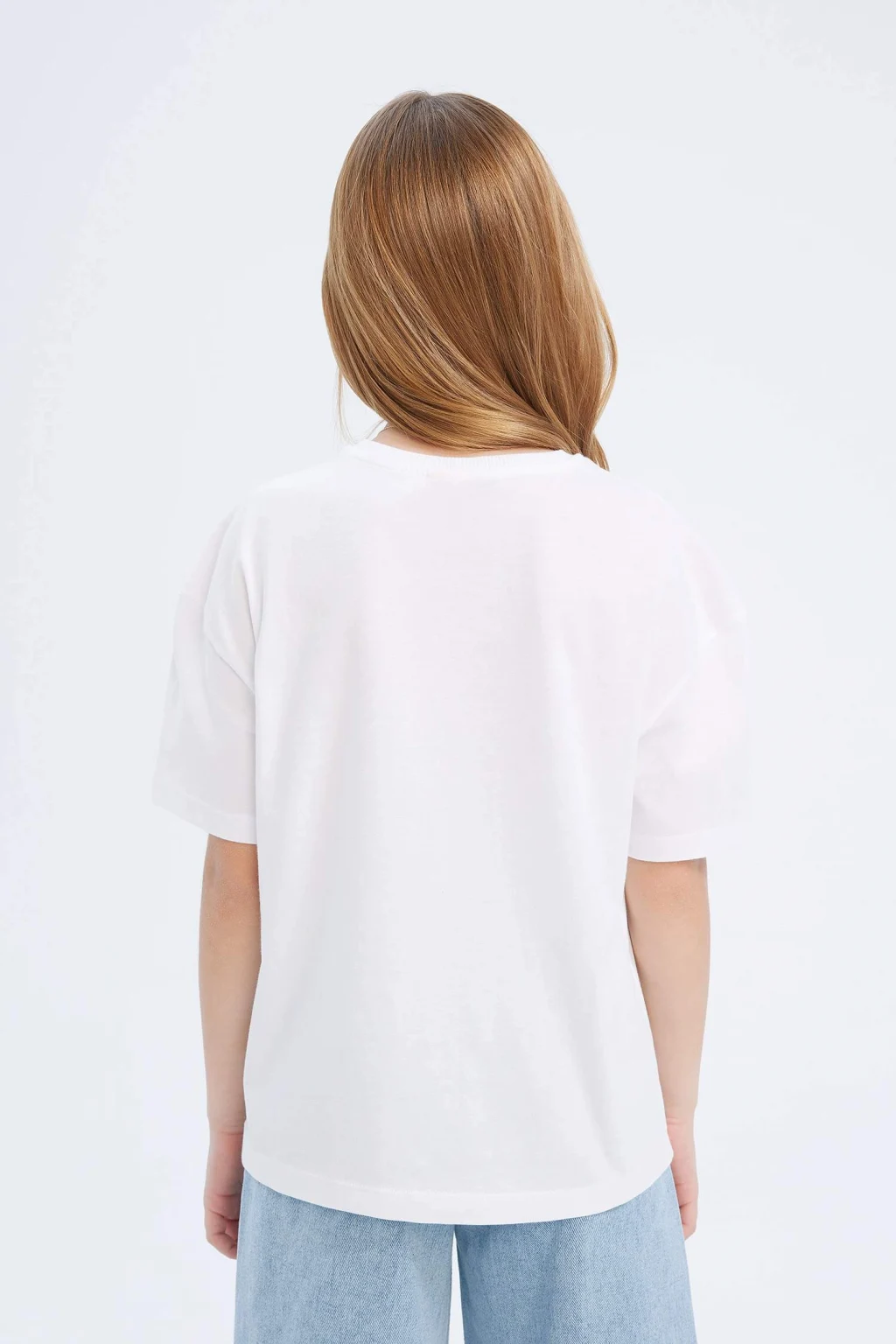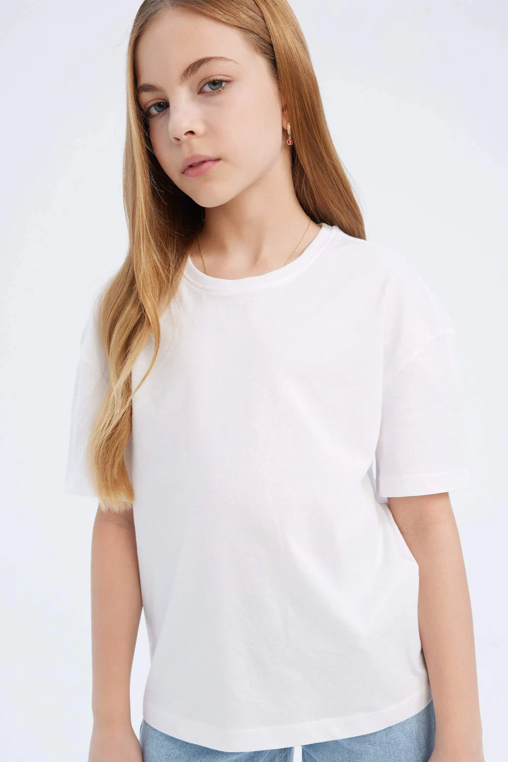 Defacto D9099A8WT34 Beyaz Relax Fit Bisiklet Yaka Basic Düz Kısa Kollu Tişört Kız Çocuk