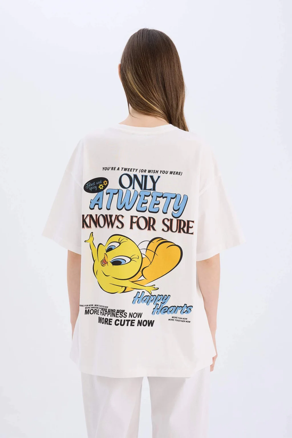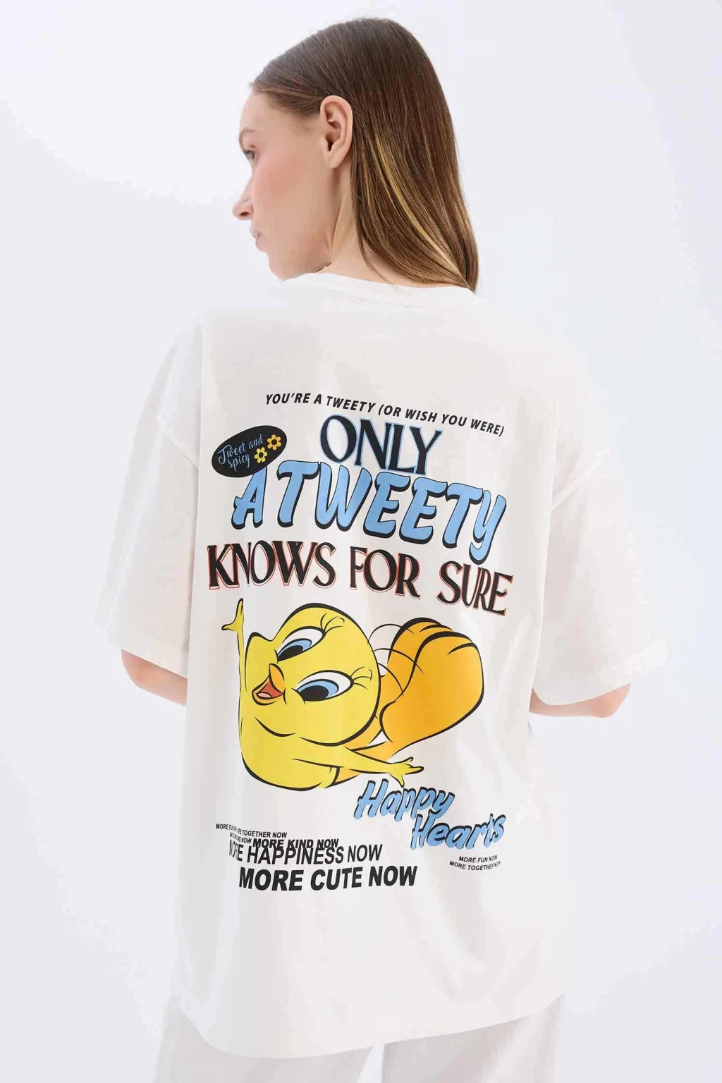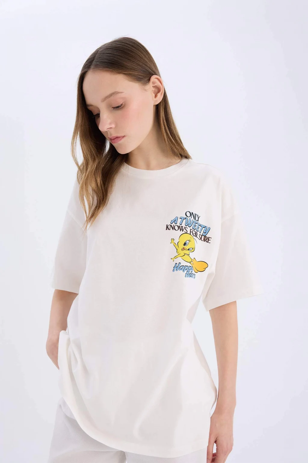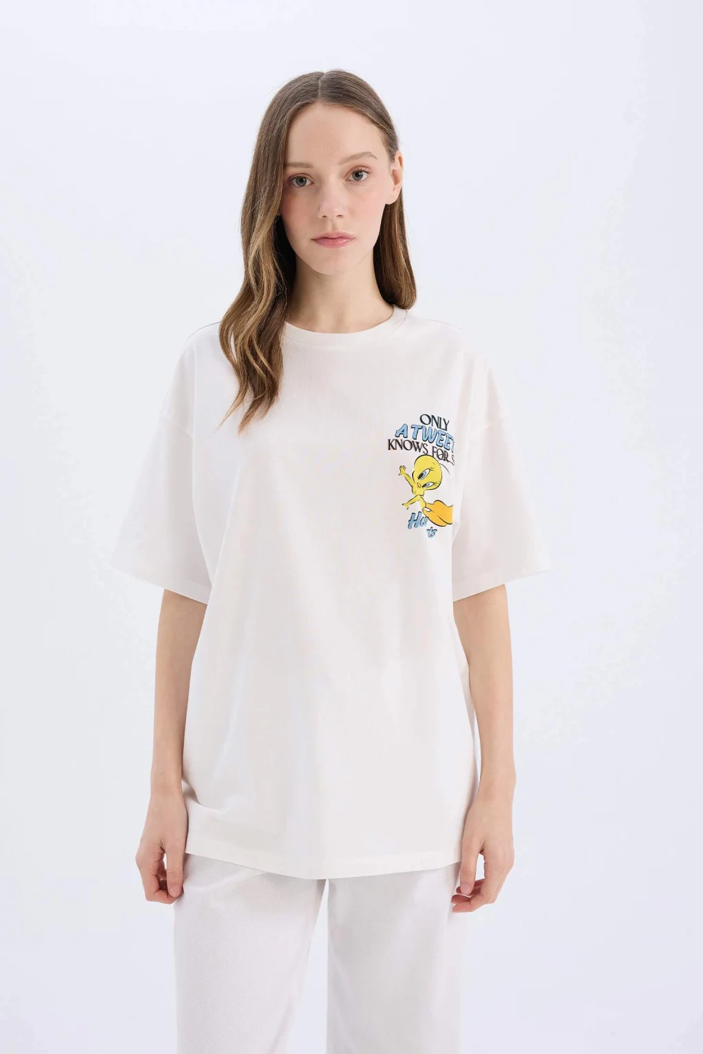 Yetişkin kadınlar için Coool markasının Looney Tunes lisansıyla tasarlanmış beyaz baskılı oversize geniş kalıplı kısa kollu tişört. Sürdürülebilir malzemelerden üretilmiş ve ilkbahar/yaz mevsimine uygun. Bisiklet yaka detayıyla şıklığınıza şıklık katacak olan bu örme tişört, gardırobunuzun vazgeçilmezi olmaya aday.