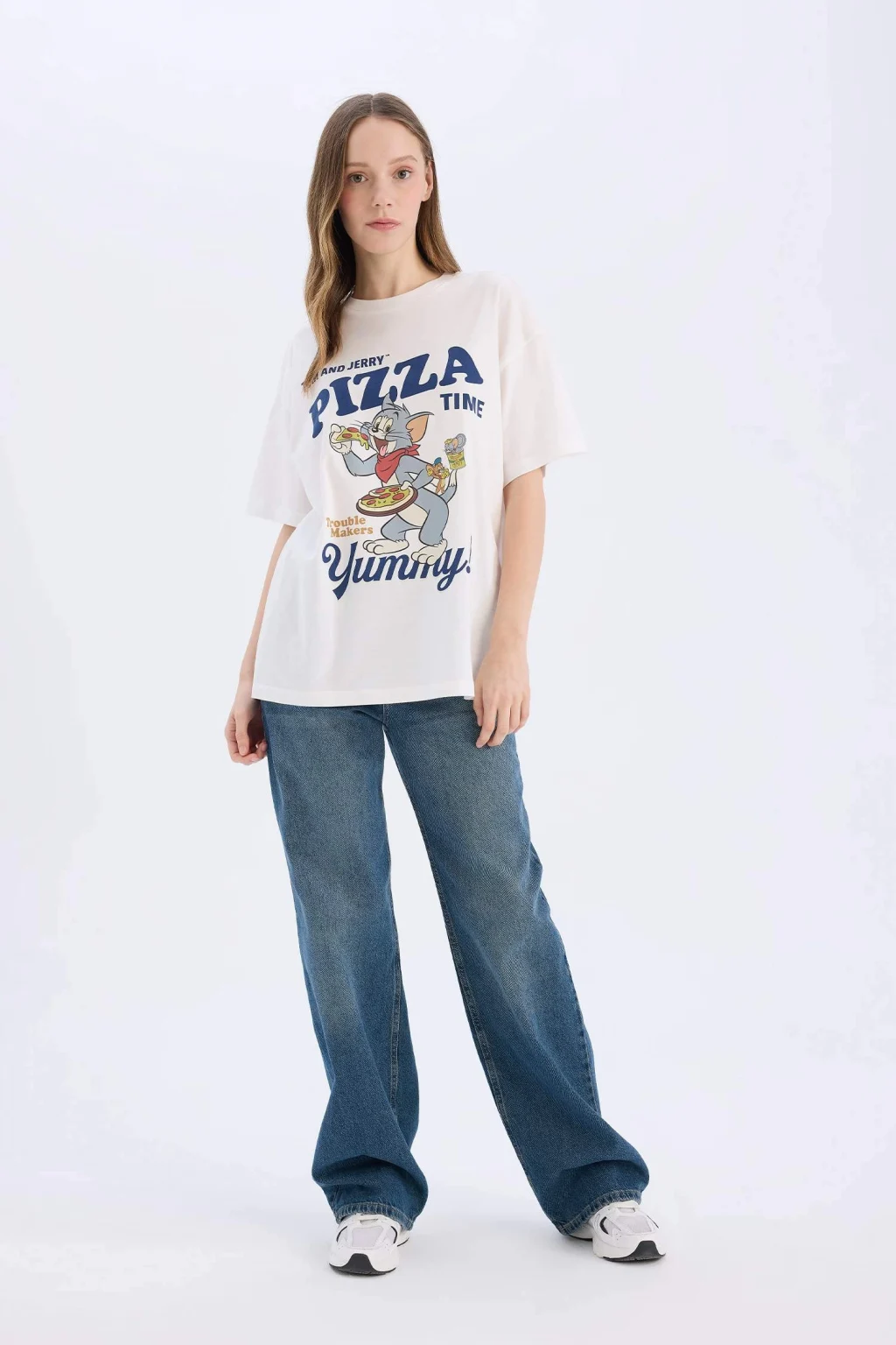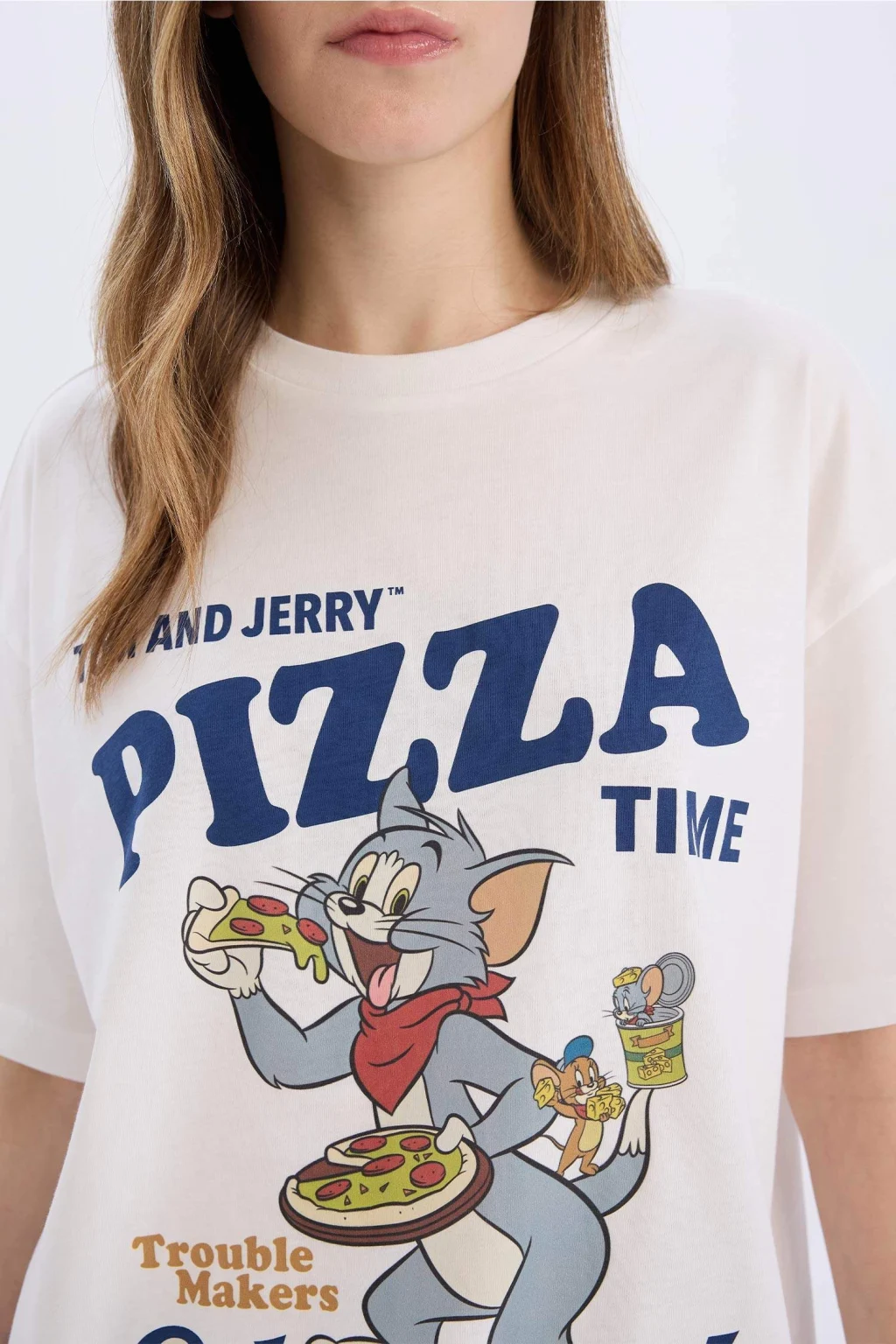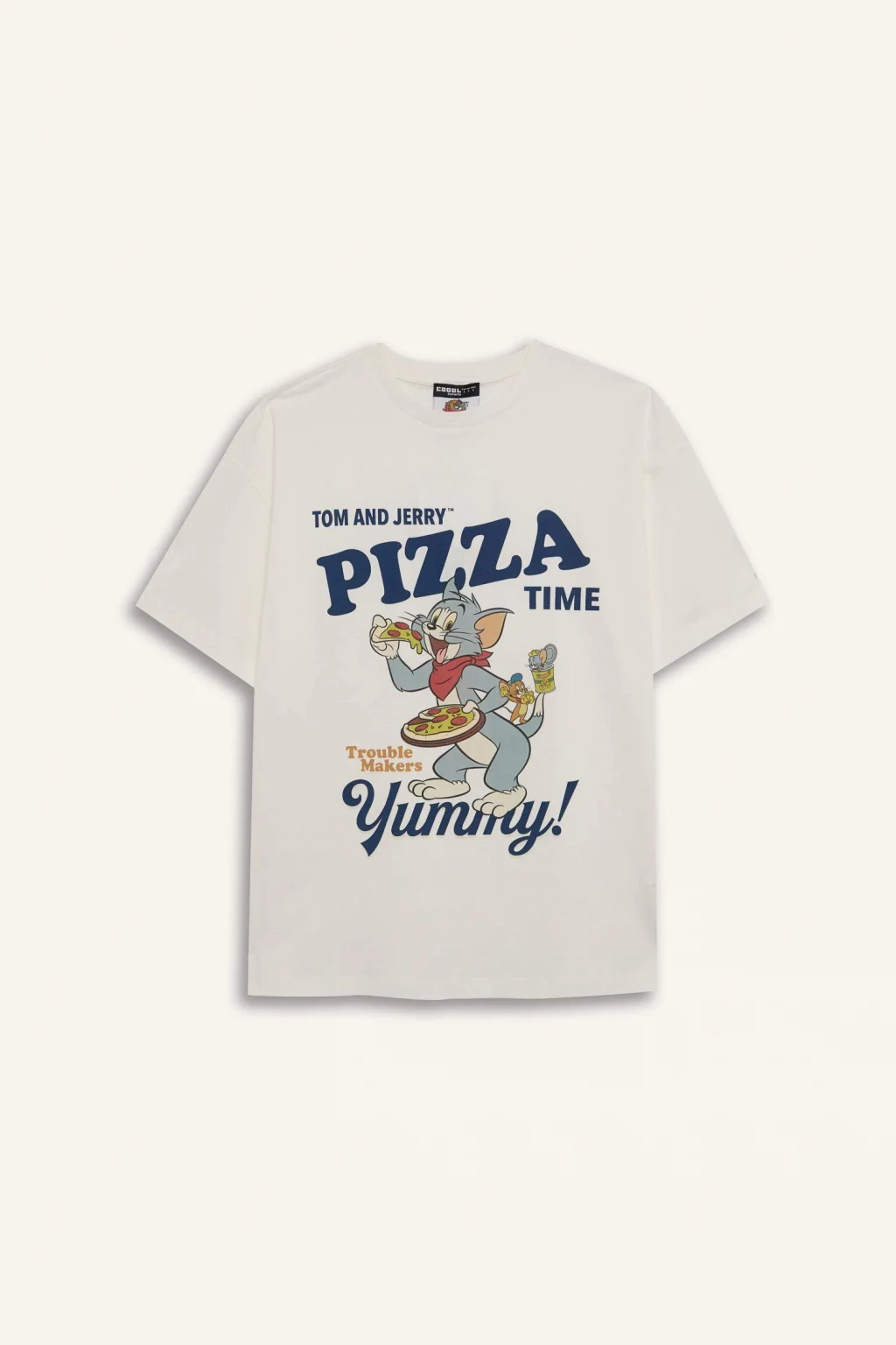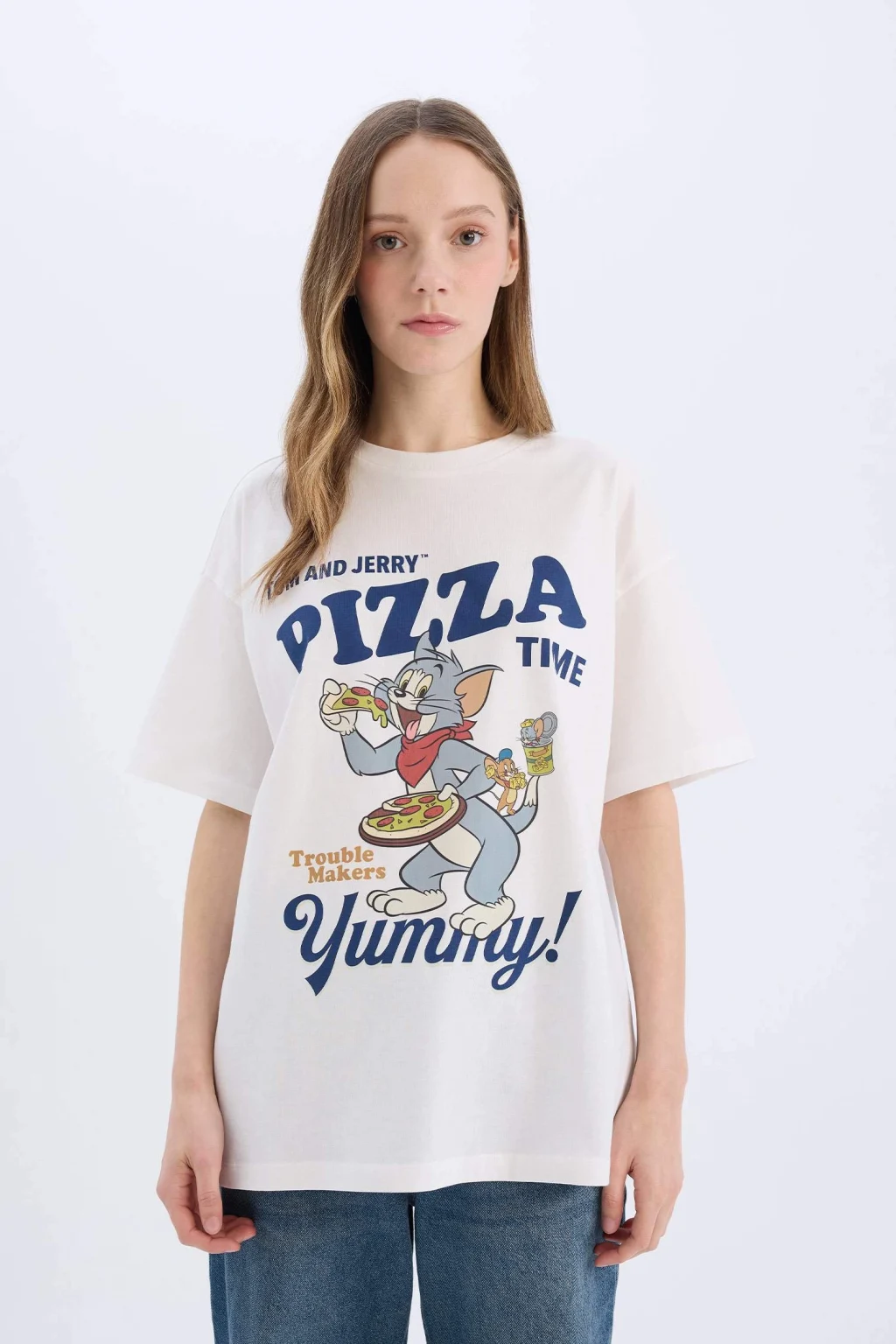 Yetişkin kadınlar için Coool marka Tom & Jerry lisanslı baskılı beyaz oversize geniş kalıplı kısa kollu tişört. Sürdürülebilir malzemeden üretilmiş, ilkbahar/yaz mevsimlerinde rahatlıkla kullanılabilir. Bisiklet yaka detayıyla şıklığı ve rahatlığı bir arada sunar.