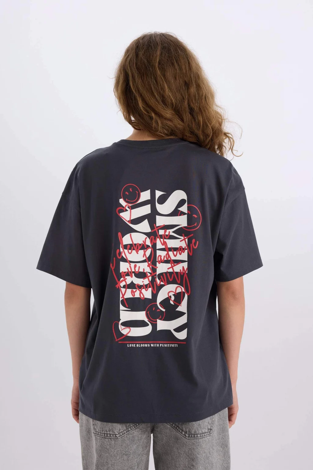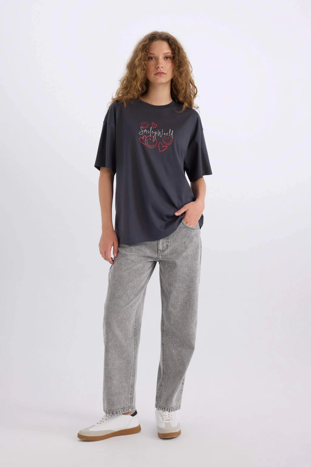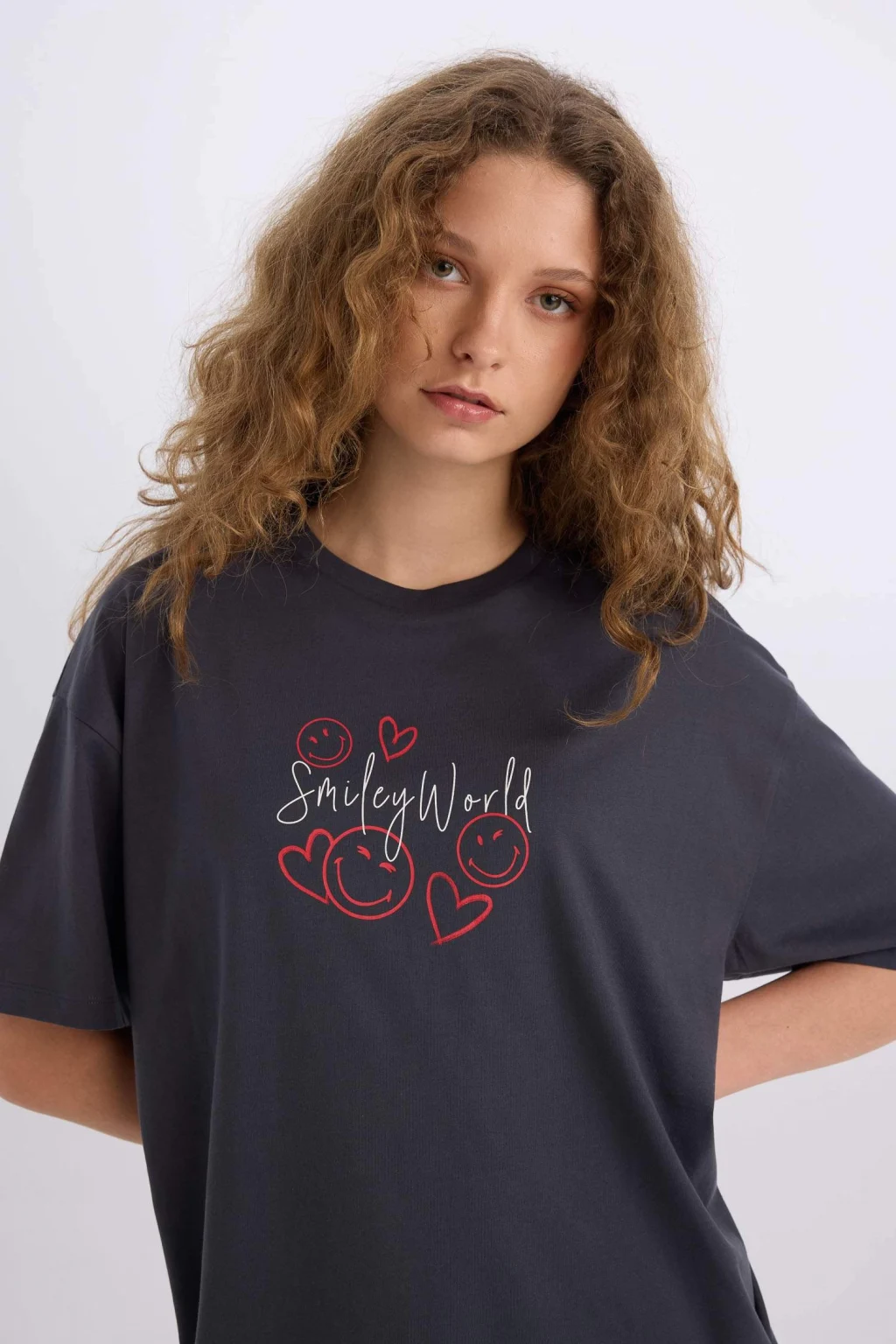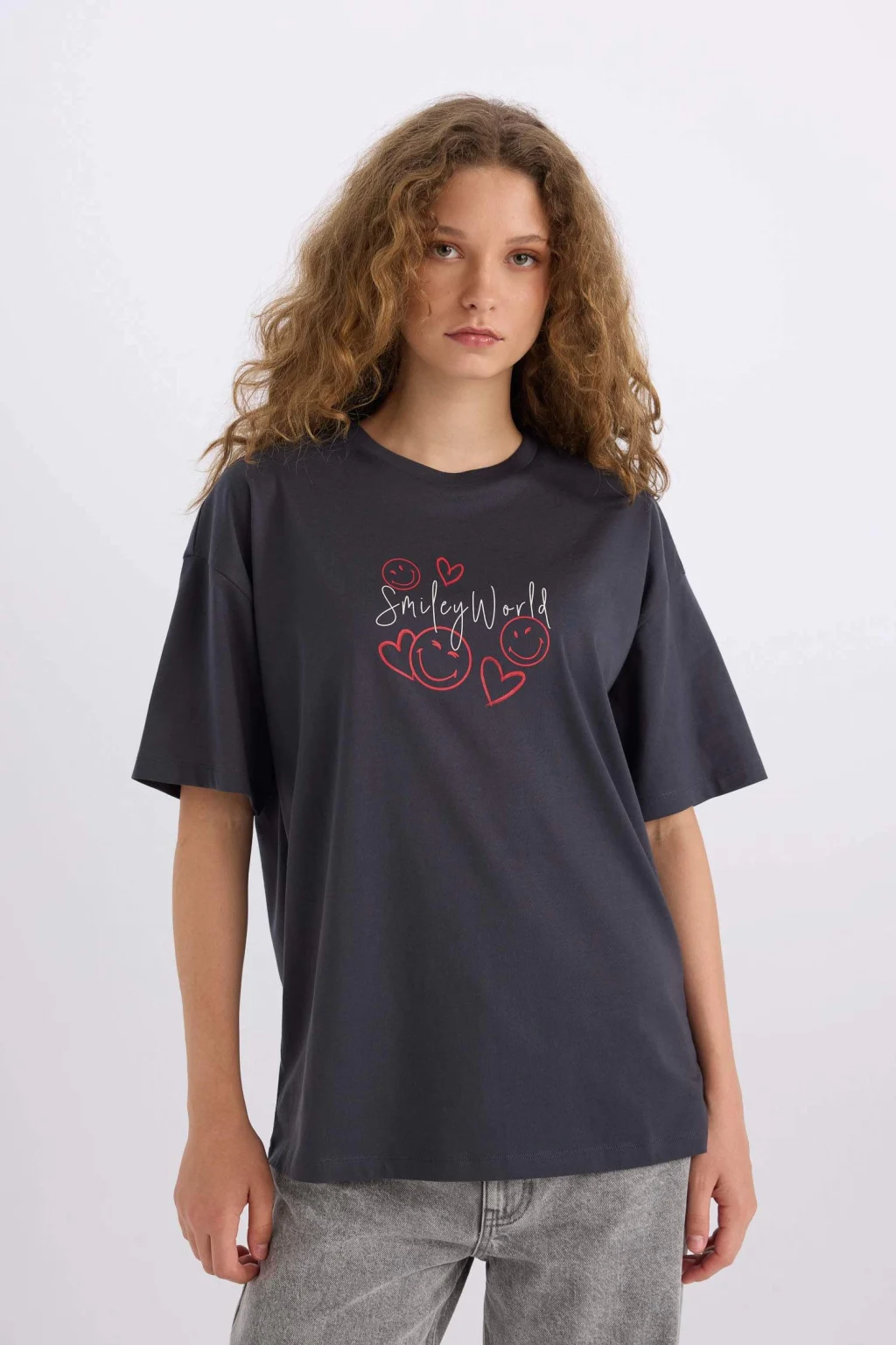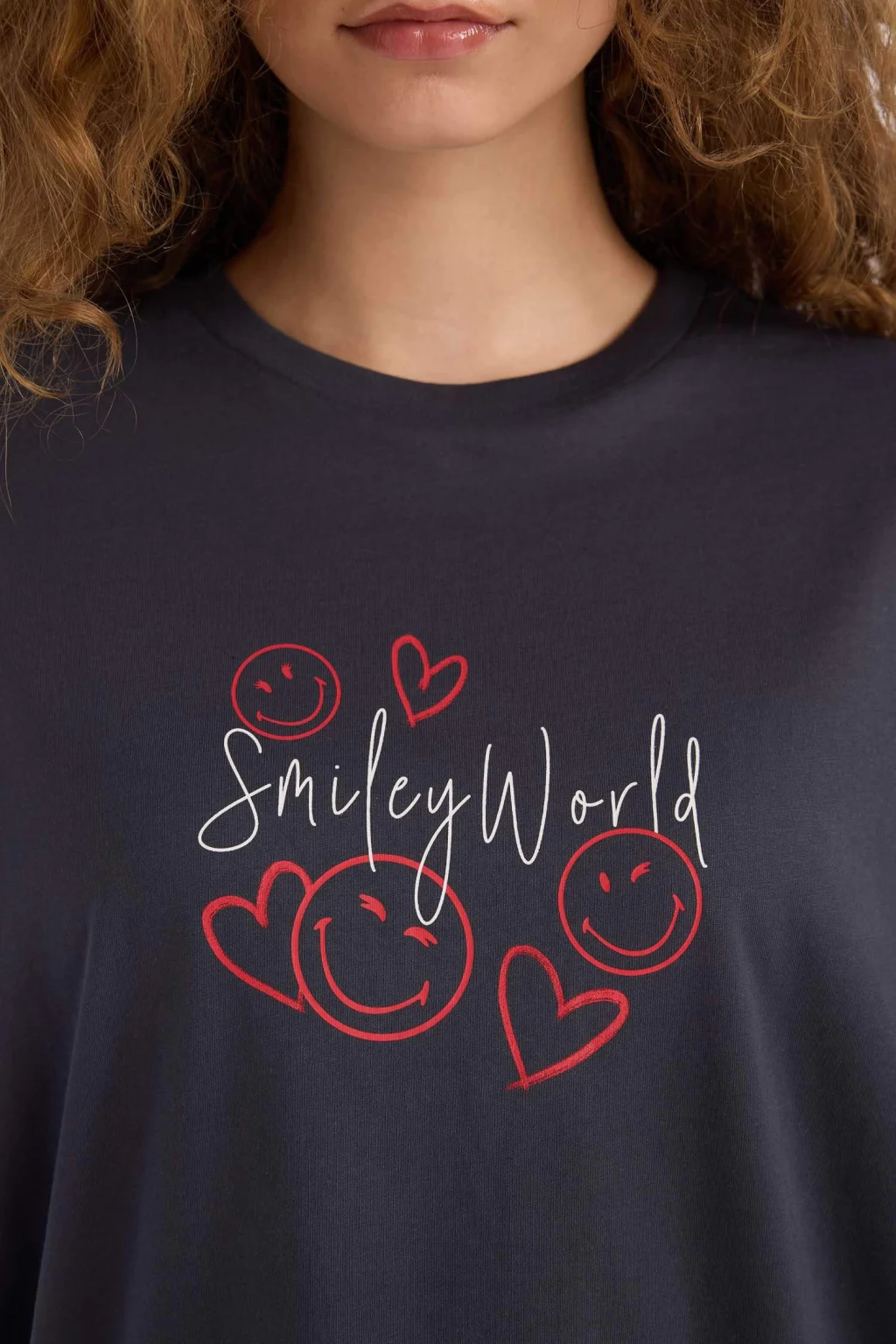 Yetişkin kadınlar için SmileyWorld lisanslı antrasit rengindeki kısa kollu tişört. Oversize geniş kalıbı ve sürdürülebilir yapısıyla dikkat çekiyor. Sevgililer Günü için özel tasarlanmış olan tişört, bisiklet yaka ve ribanalı yaka detaylarıyla öne çıkıyor. İlkbahar/Yaz koleksiyonunun vazgeçilmezi!