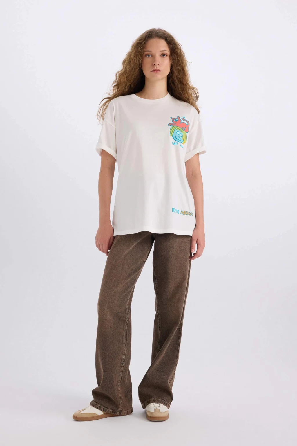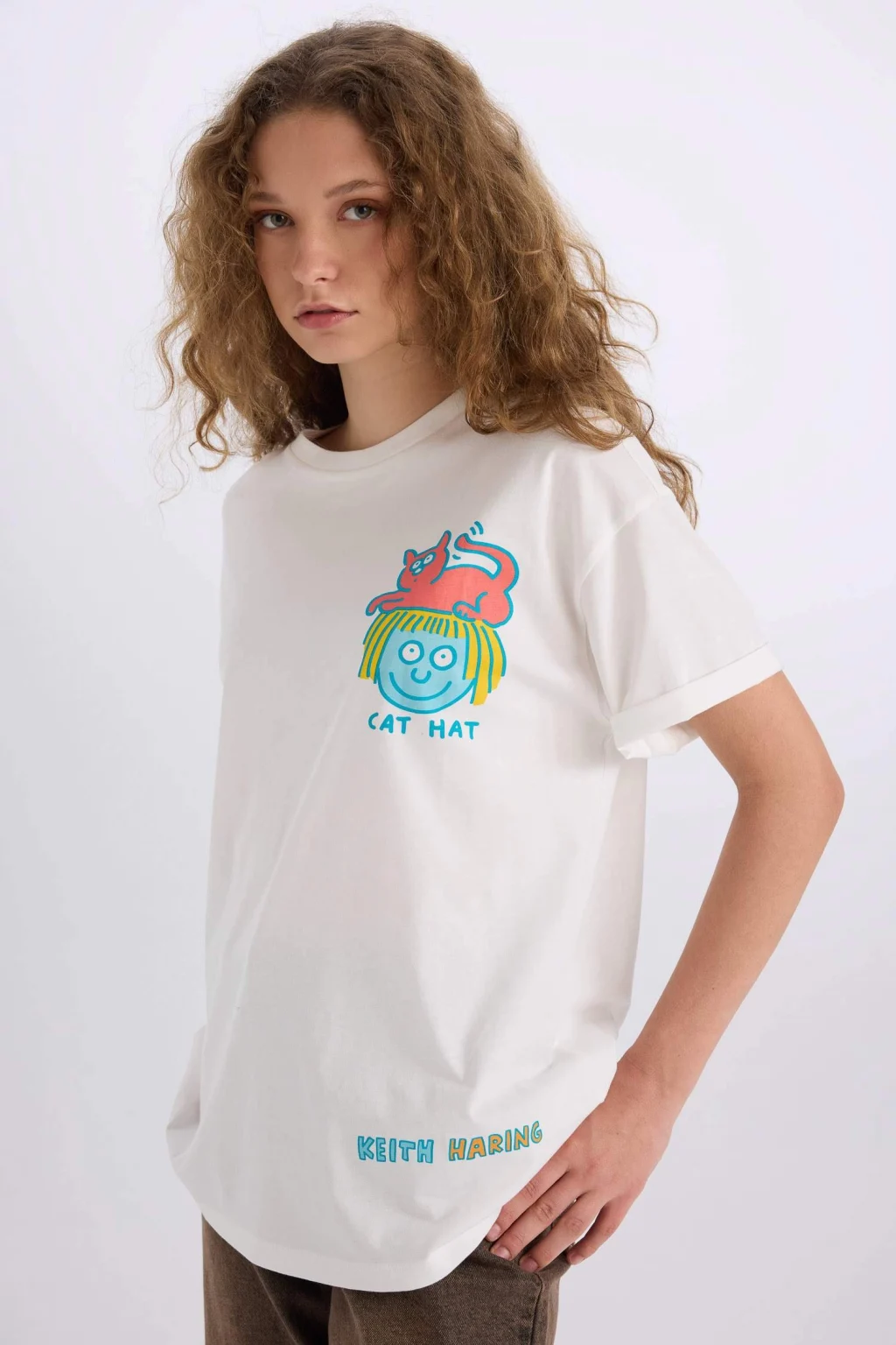 Yetişkinler için Keith Haring lisanslı beyaz baskılı kısa kollu tişört. Oversize geniş kalıbı ve sürdürülebilir malzemeleri ile dikkat çeken bu tişört, ilkbahar/yaz sezonunda örme giyim seven kadınların favorisi olacak. Bisiklet yaka ve ribanalı yaka detaylarıyla tarzınızı tamamlayın.