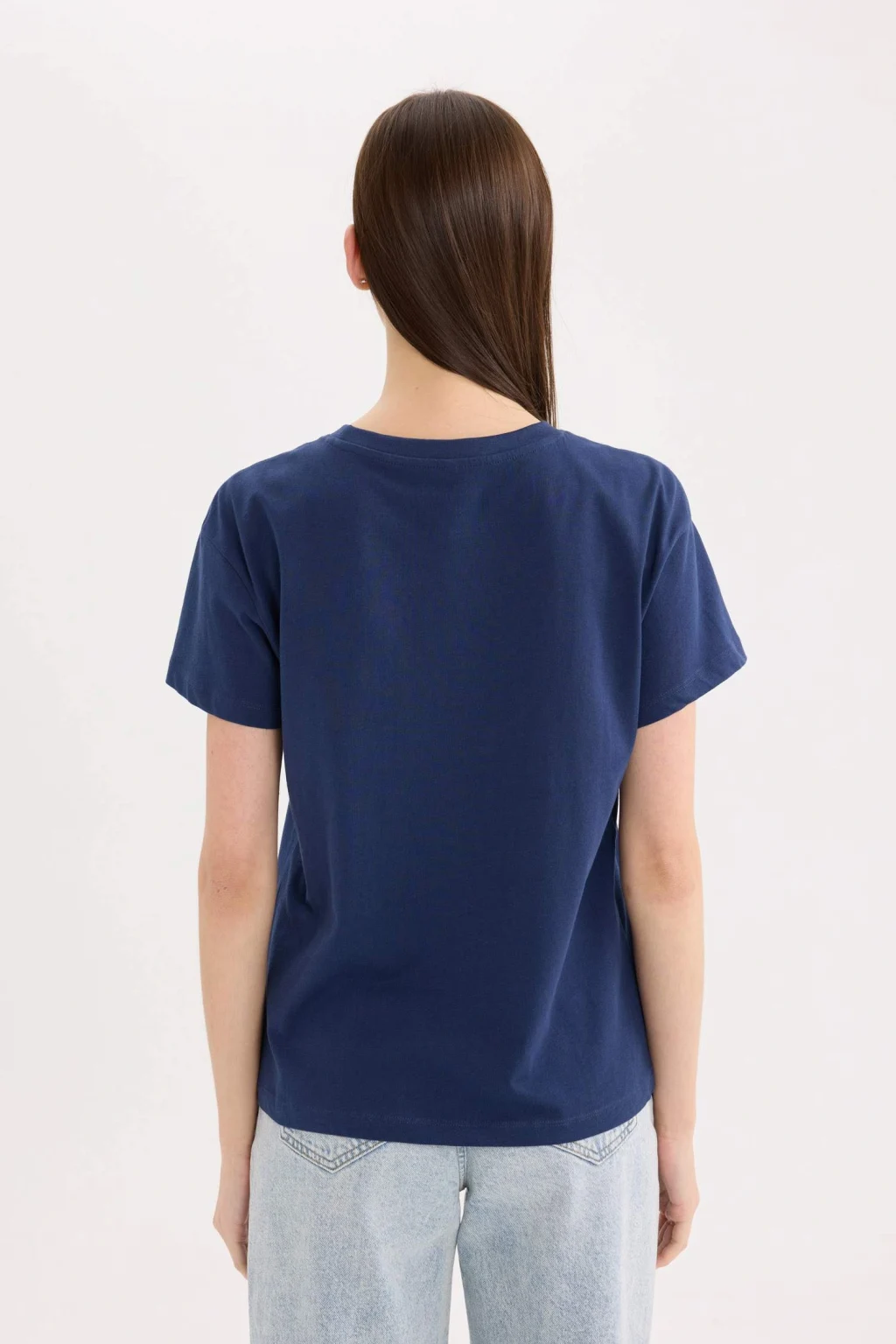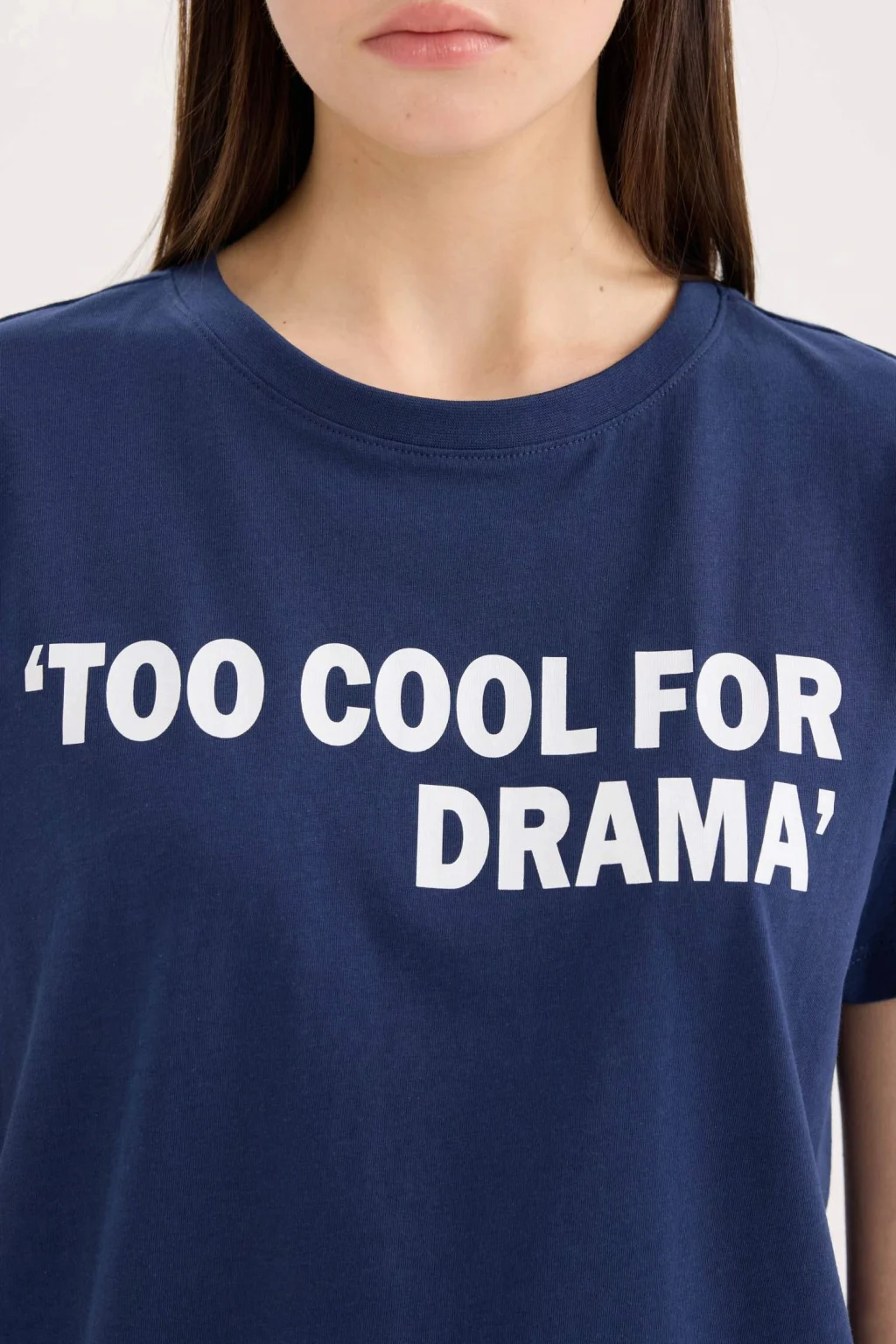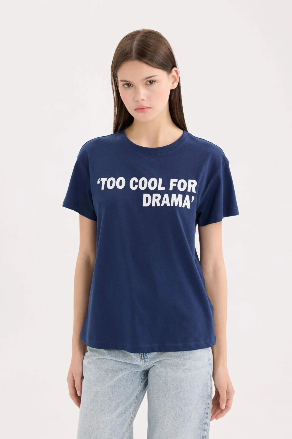 Kadınlar için yaz mevsimine özel slogan desenli lacivert kısa kollu tişört. Sürdürülebilir materyalden üretilmiş, bisiklet yaka ve ribanalı detaylar ile şık bir görünüm sunar. Regular fit kalıbı ile rahat ve şık bir seçim.
