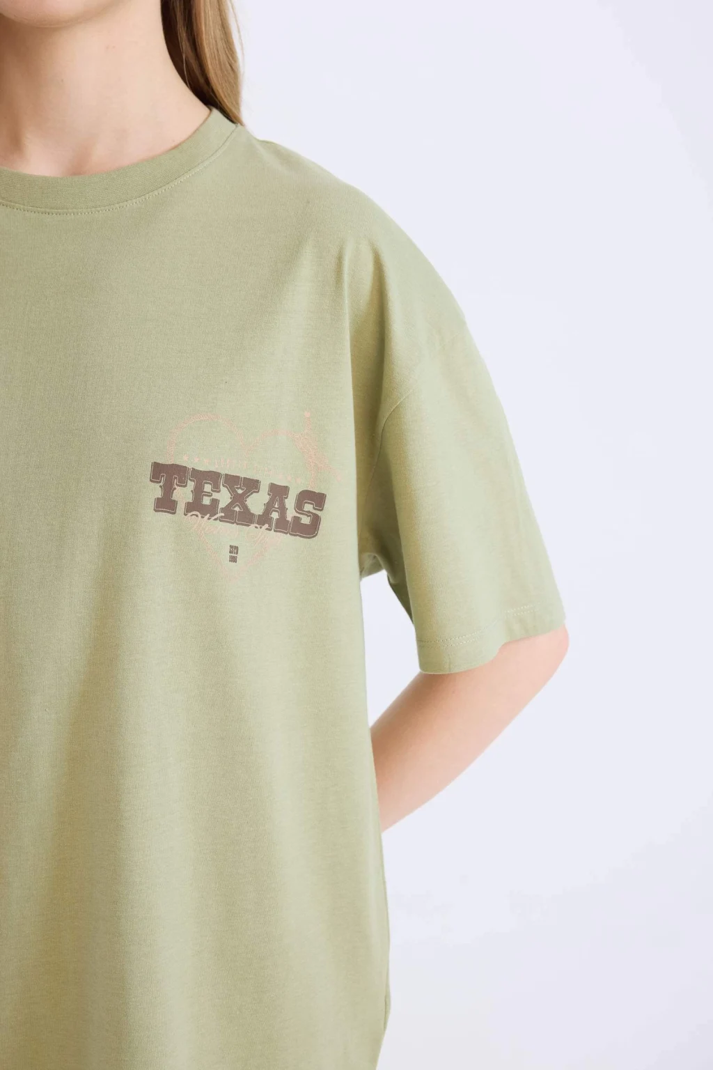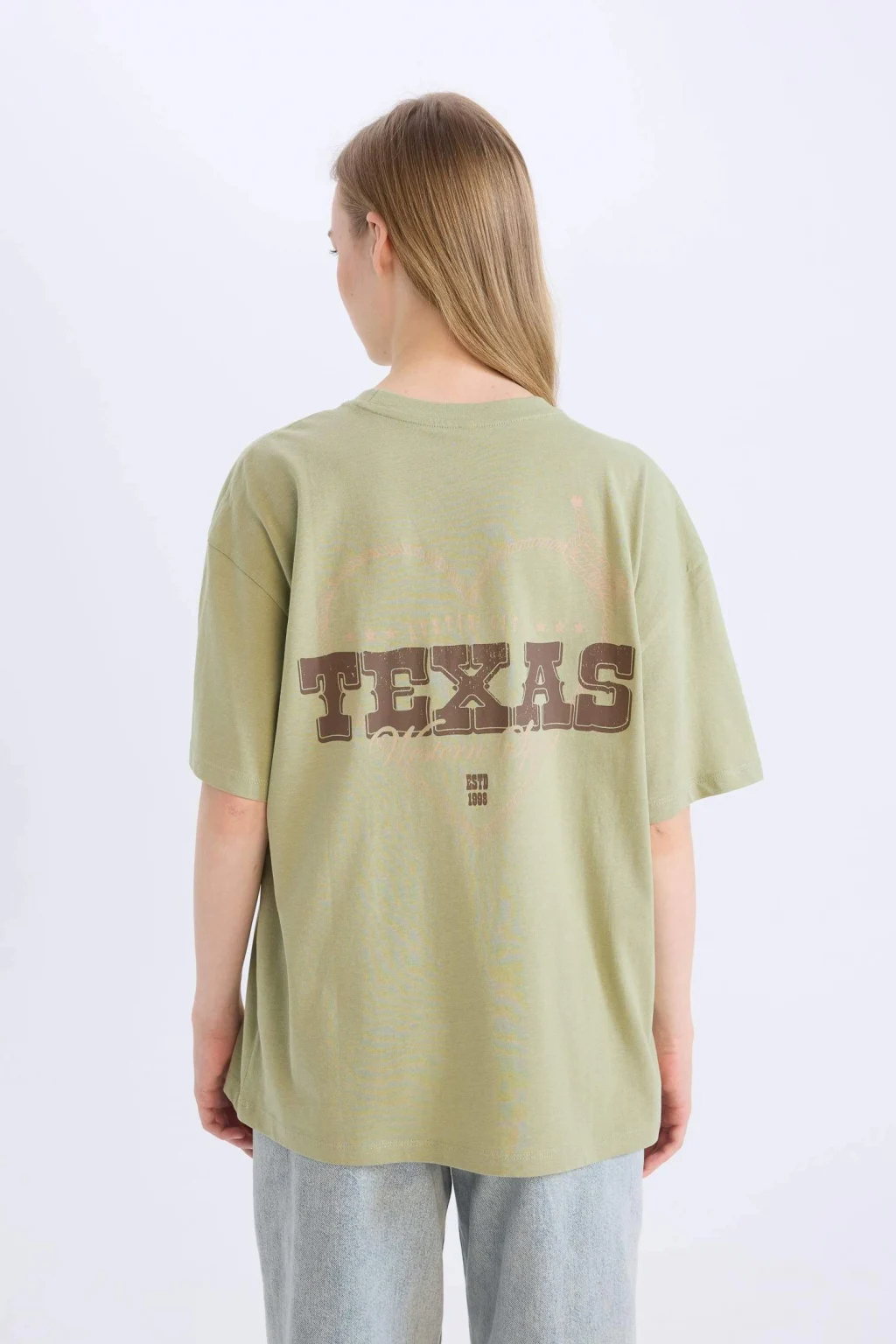 Yetişkin kadınlar için özel olarak tasarlanan baskılı haki kısa kollu tişört. Oversize geniş kalıbı ve düşük omuz detayıyla öne çıkıyor. Sürdürülebilir materyaller kullanılarak yaz mevsimine uygun bir parça. Bisiklet yakası ve ribanalı yaka detaylarıyla tarzınıza şıklık katın.