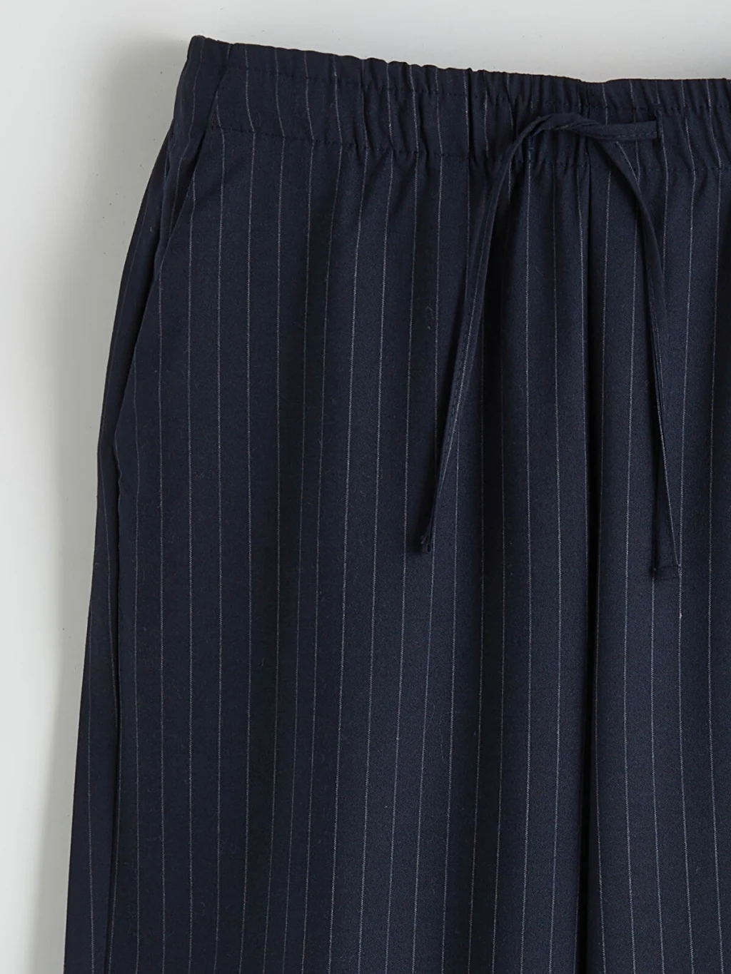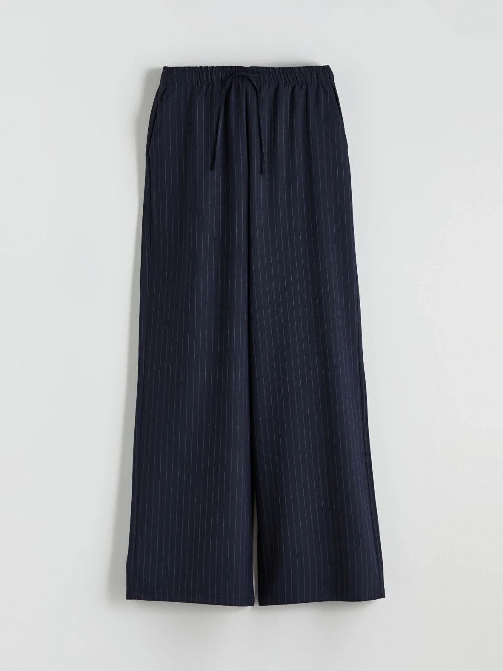 Poliviskon kumaştan üretilmiş, çizgili desenli kadın pantolon. Beli lastikli ve bağcıklıdır, geniş paça kesime sahiptir.