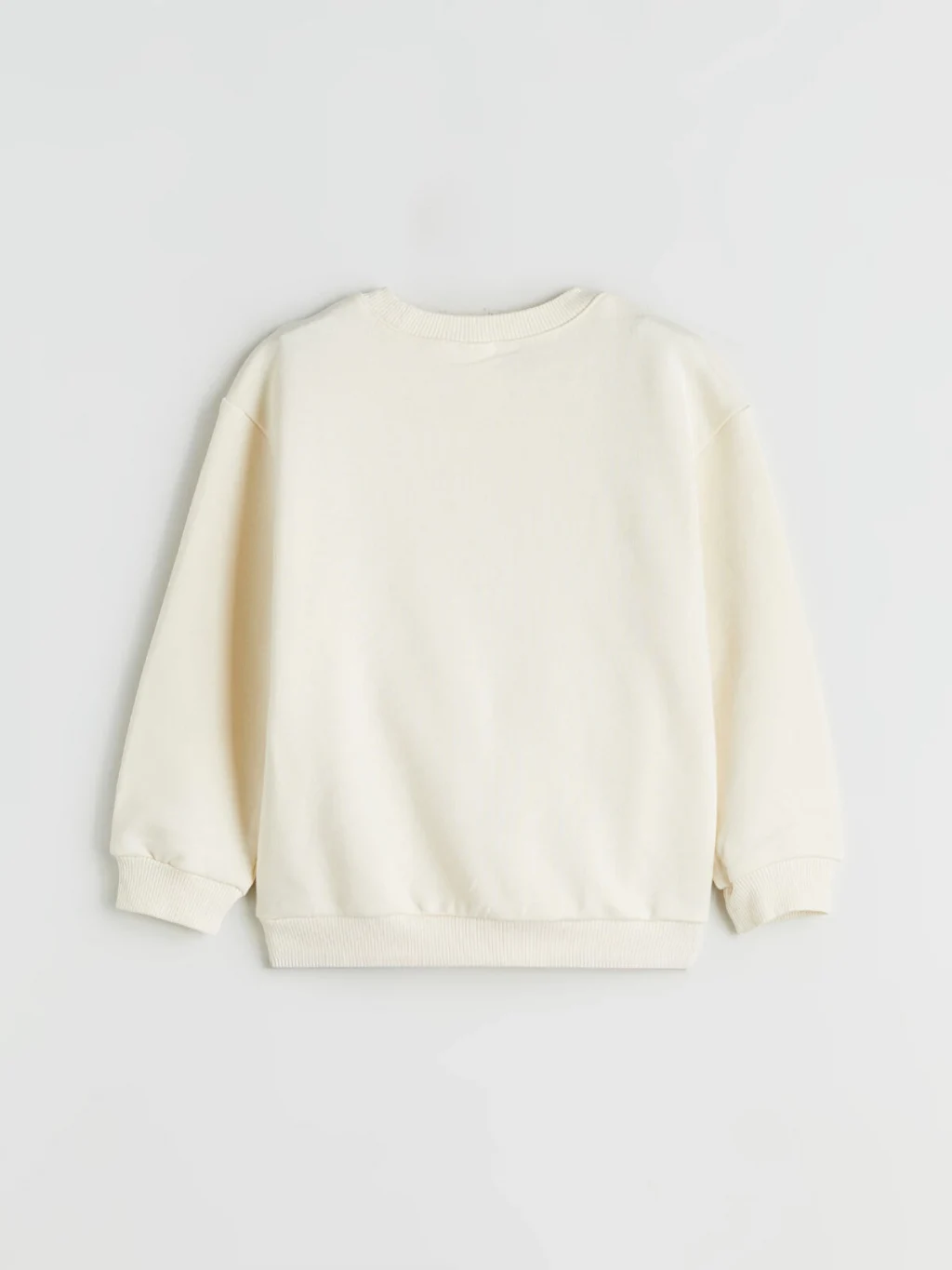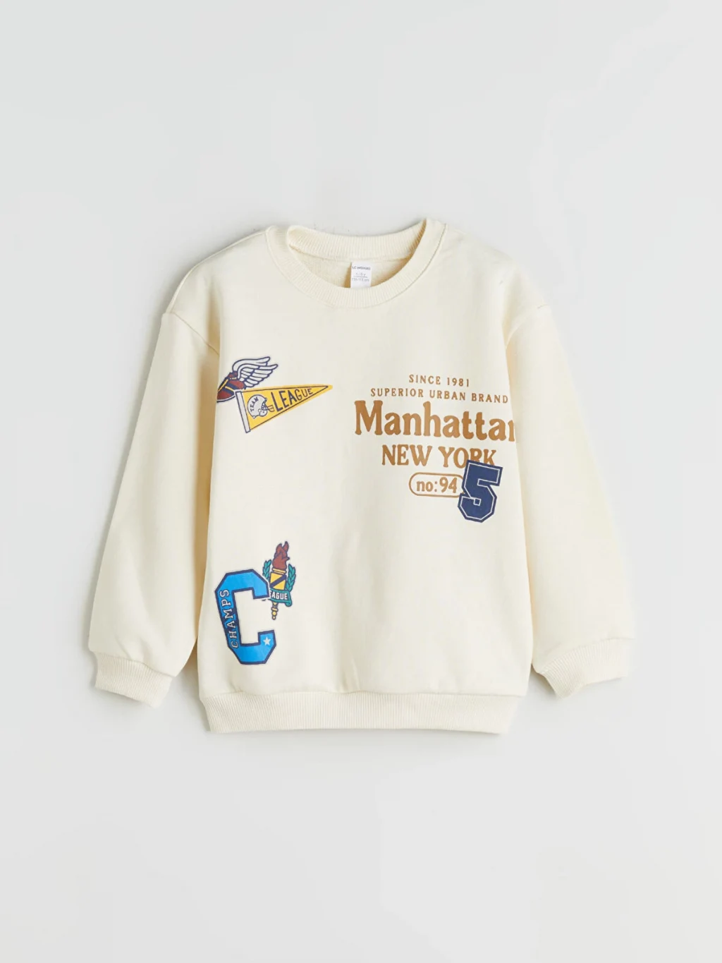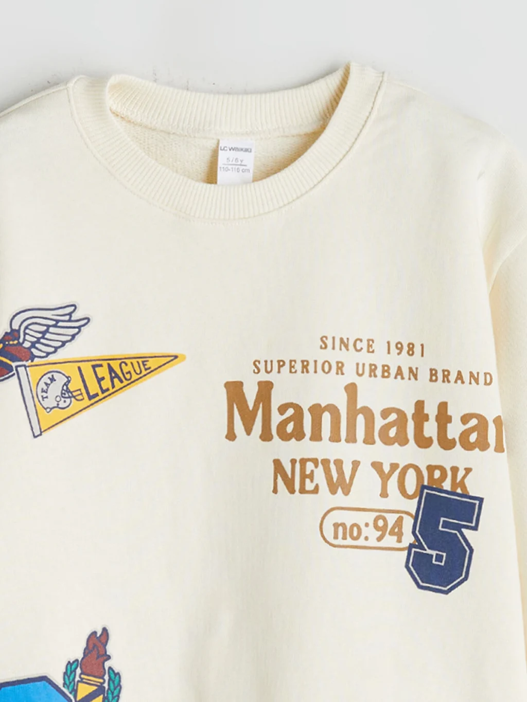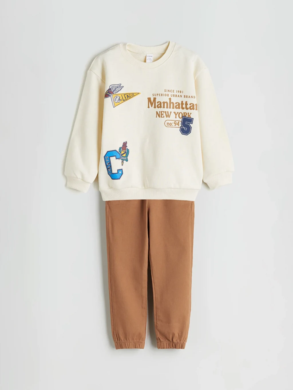 Erkek çocuk takım; bisiklet yaka, uzun kollu, baskılı ve yamalı sweatshirt ile paçası lastikli eşofman alttan oluşur. 3 iplik kumaştan üretilmiştir.