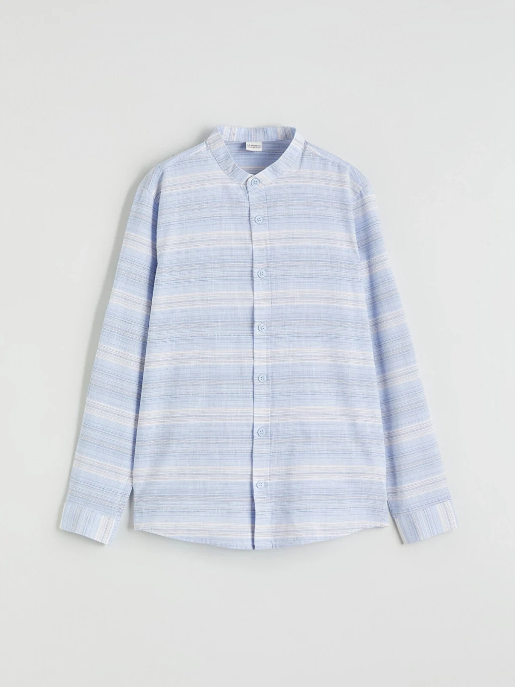 Çizgili, hakim yakalı erkek çocuk gömlek, uzun kolludur. Önden düğme kapamalı olup, %100 pamuk kumaştan üretilmiştir.