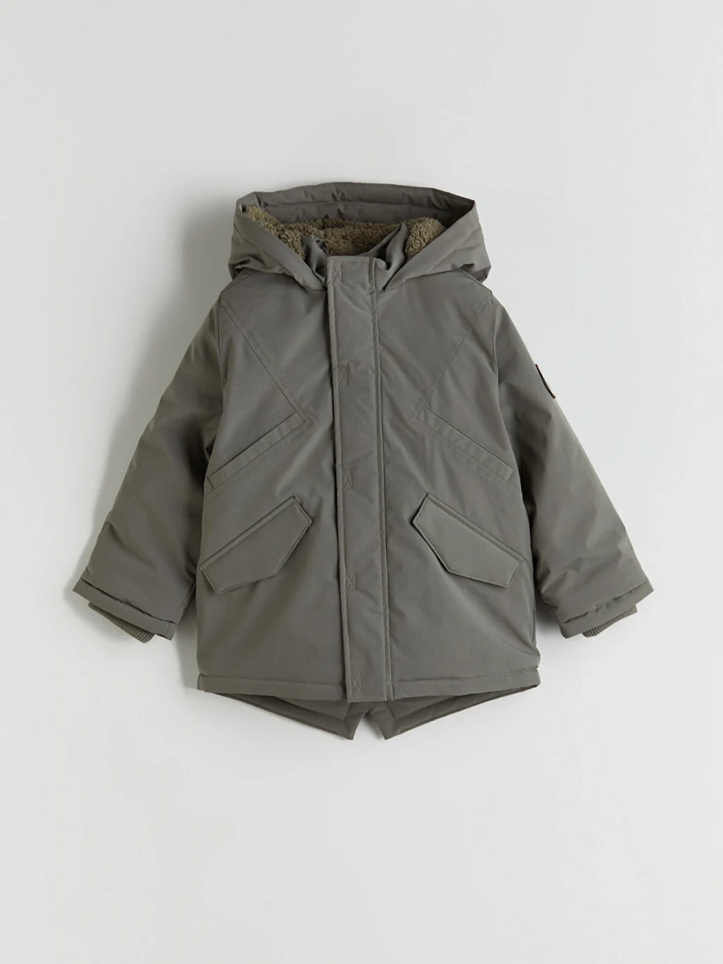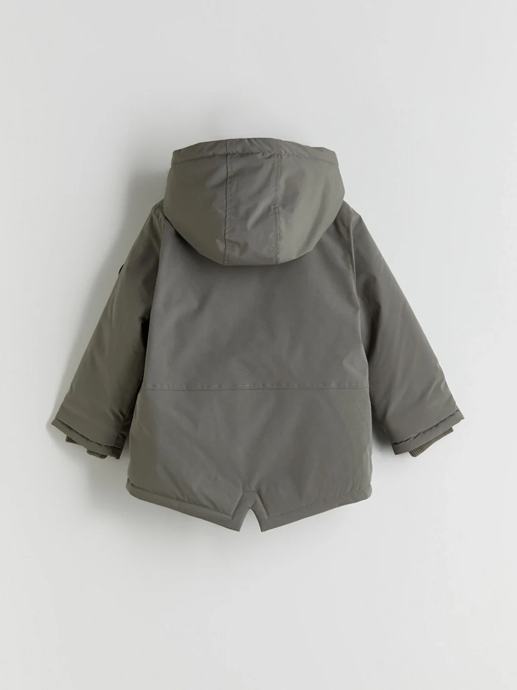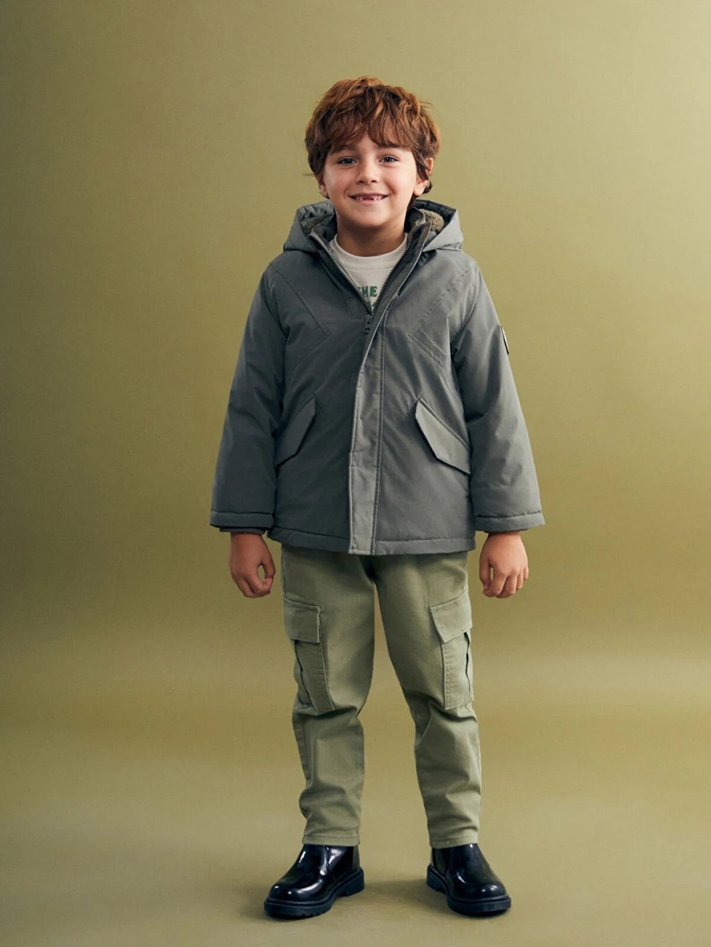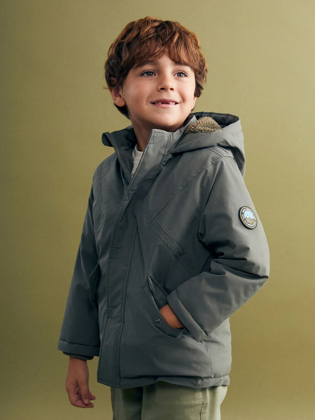 Erkek çocuk mont, kapüşonlu ve astarlı tasarıma sahiptir. Ön kısmı fermuar kapamalıdır.