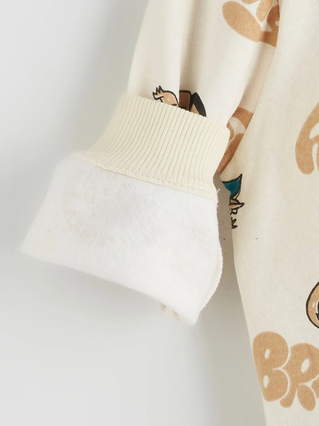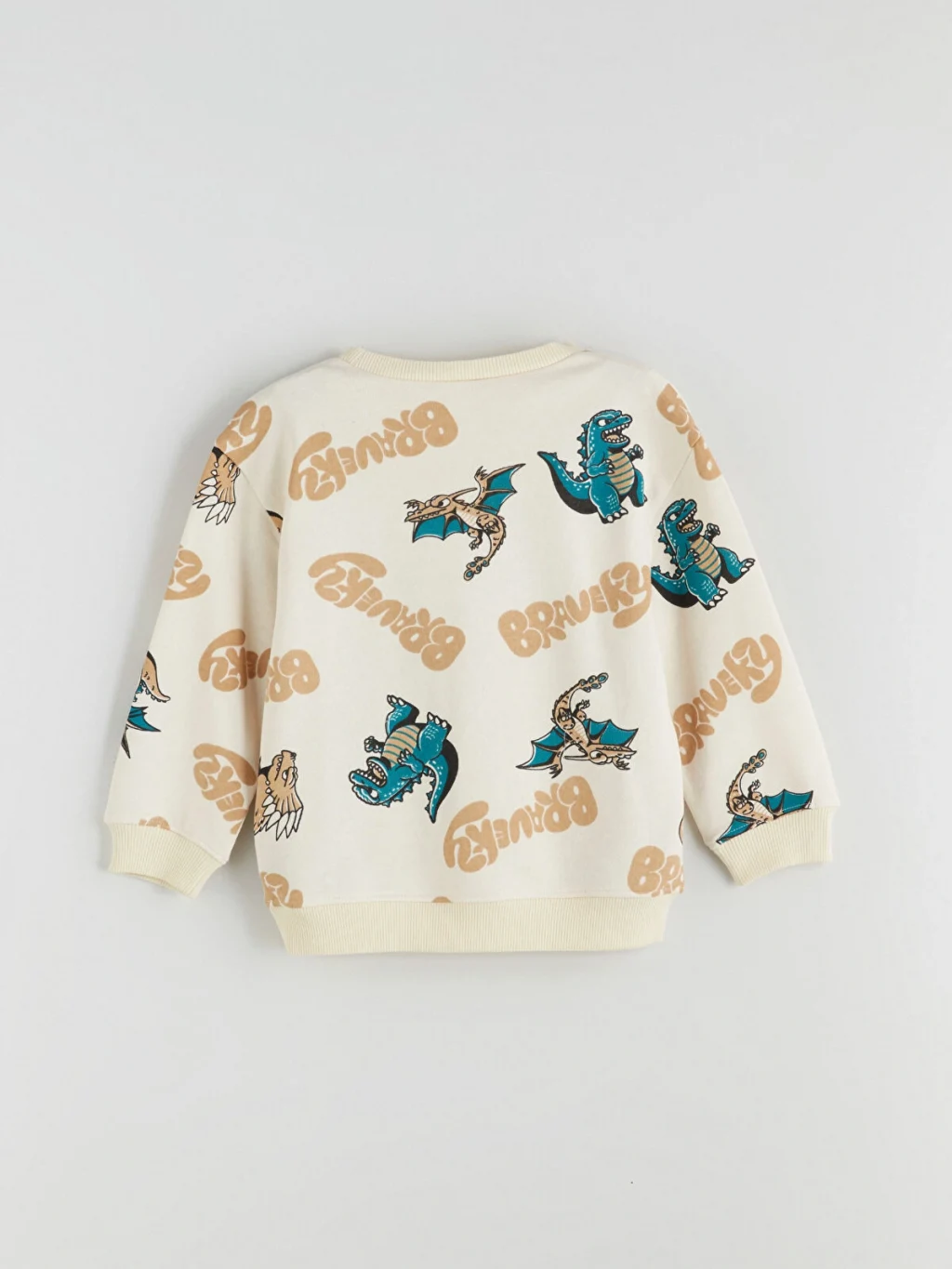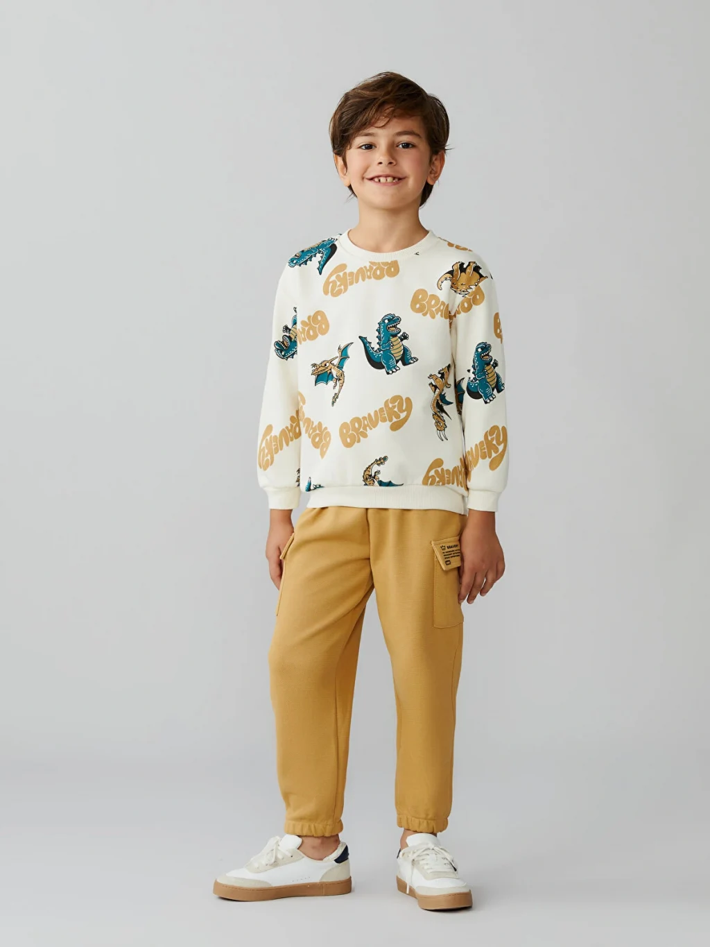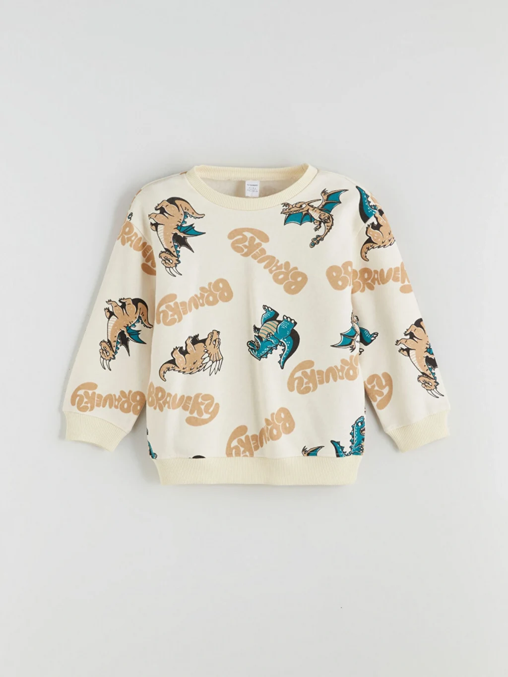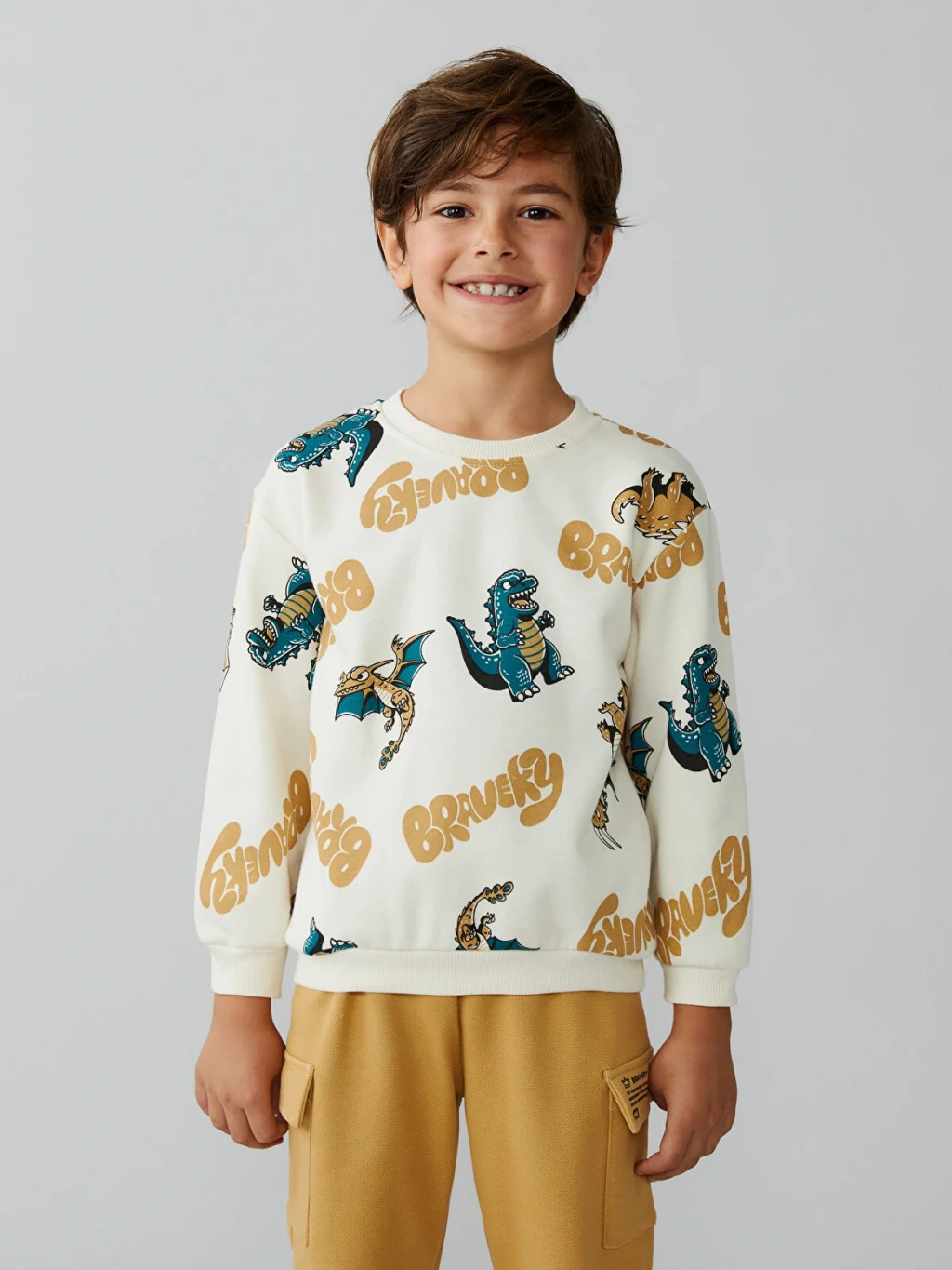 Bisiklet yaka, uzun kollu erkek çocuk sweatshirt, 3 iplik kumaştan üretilmiştir. Tamamı ejderha ve yazı desenli olup, kol uçları ve etek ucu ribanalıdır.