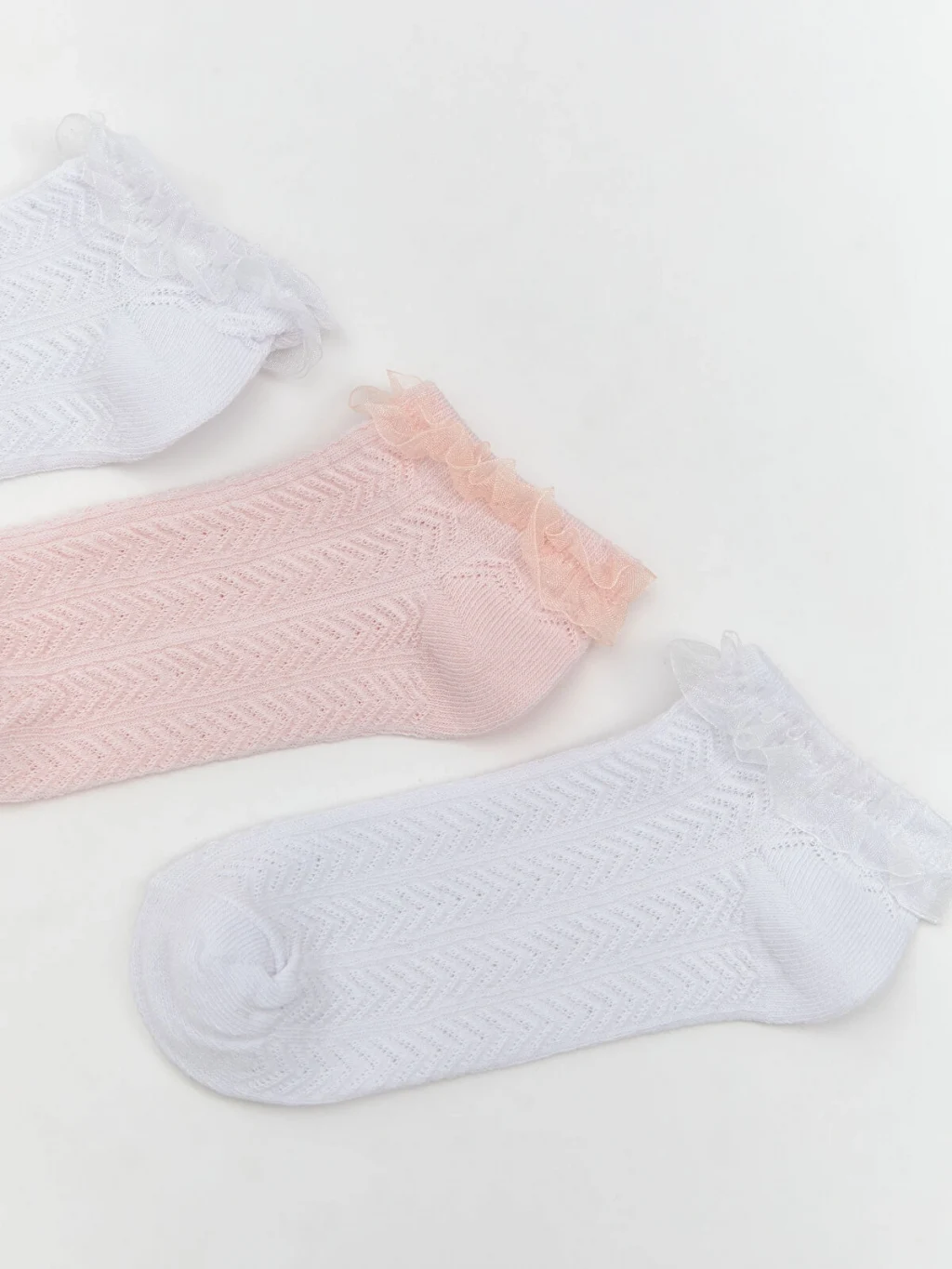 Üç çiftten oluşan kız çocuk patik çorap seti, bilekleri fırfırlı ve ajur örgü desenlidir.
